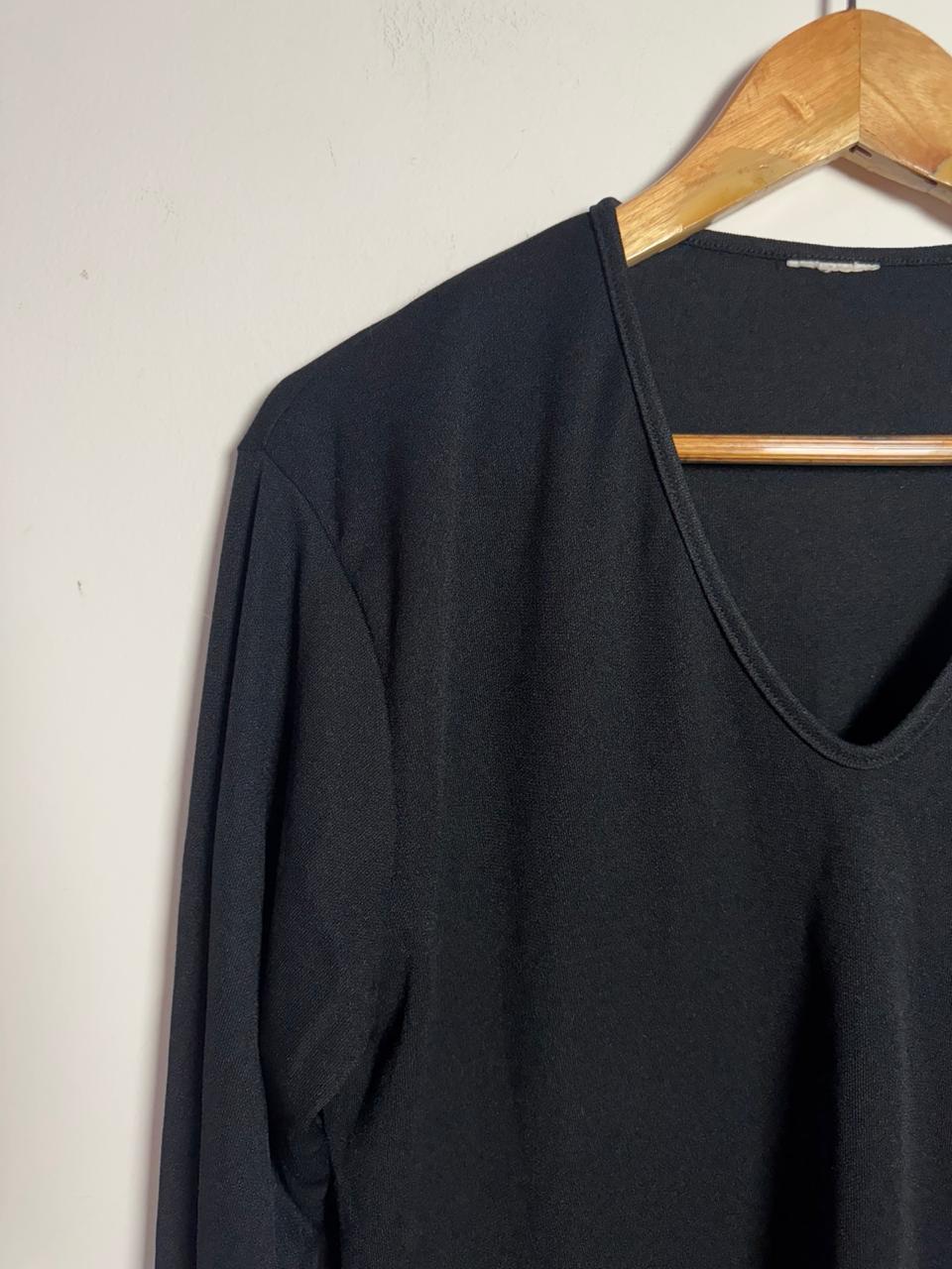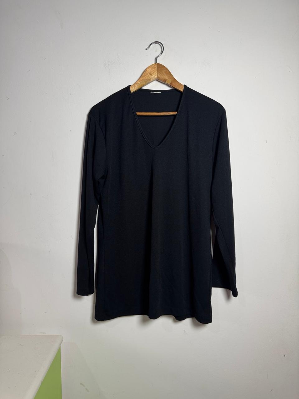 Camiseta/Blusa preta de manga longa em malha fluida, com modelagem alongada e decote V profundo. Uma peça básica e versátil, perfeita para ser usada em sobreposições ou como peça principal em um look minimalista elegante.