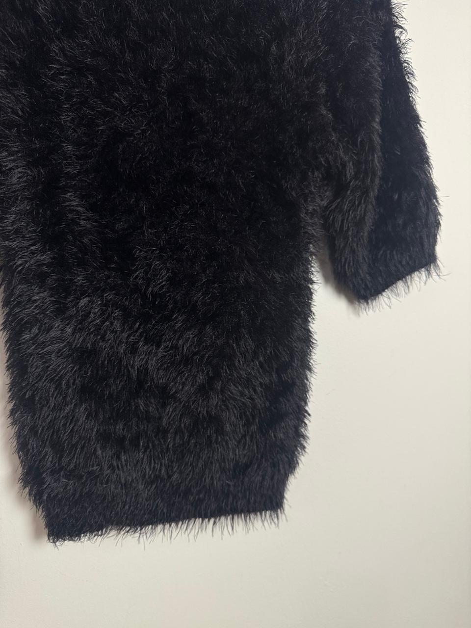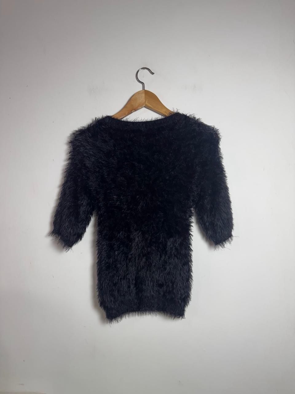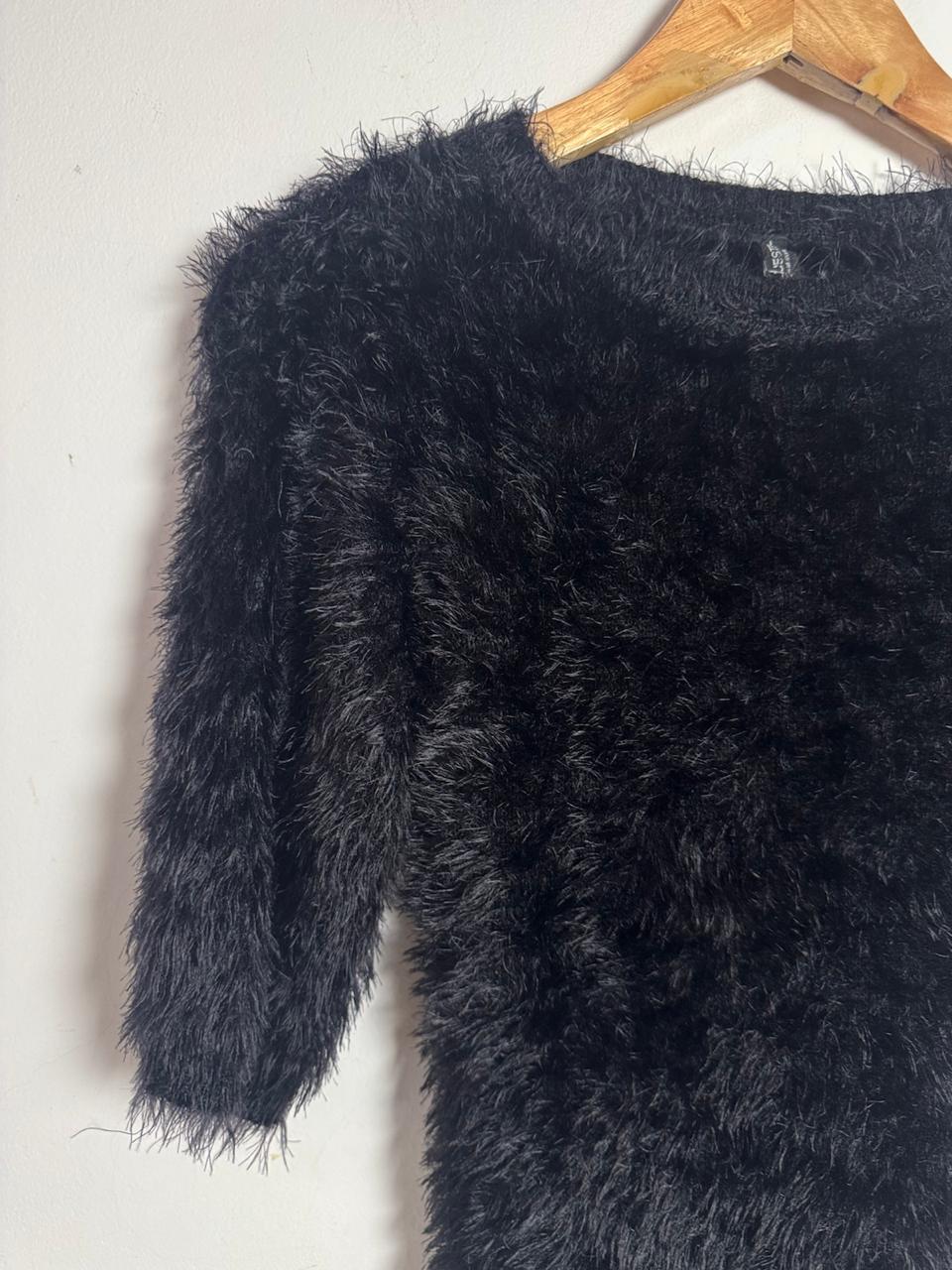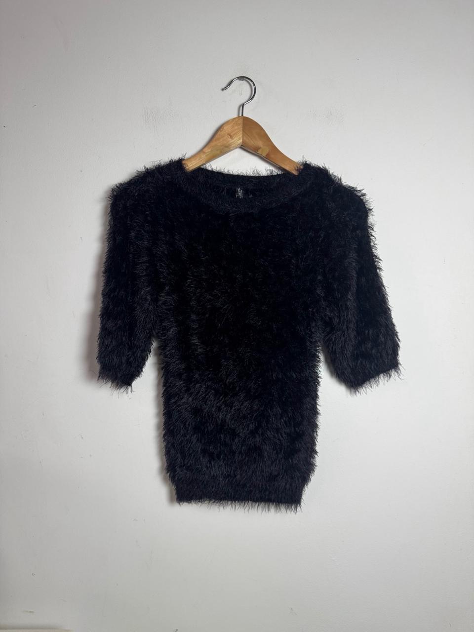 Camisa preta com mangas 3/4 e gola careca, confeccionada em material de aparência fofa e longa, sem falar do conforto. Essa peça é ideal para looks mais elaborados e aconchegantes.