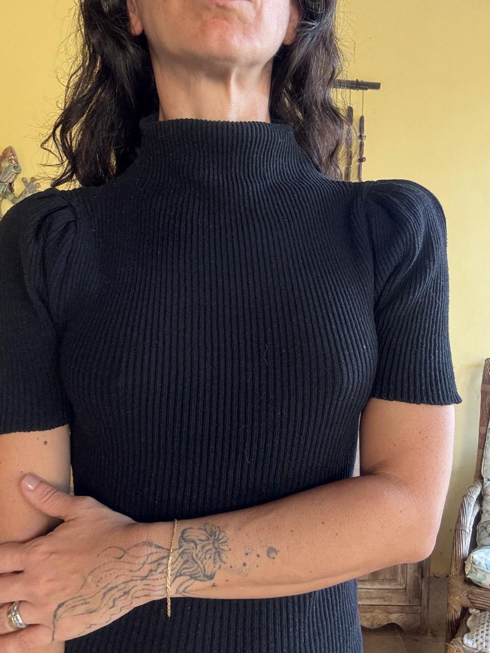 Camisa preta canelada com gola alta e mangas curtas bufantes (puff), que proporcionam um toque moderno e sofisticado. Uma peça super ajustada ao corpo, versátil para looks casuais com jeans ou mais elegantes.