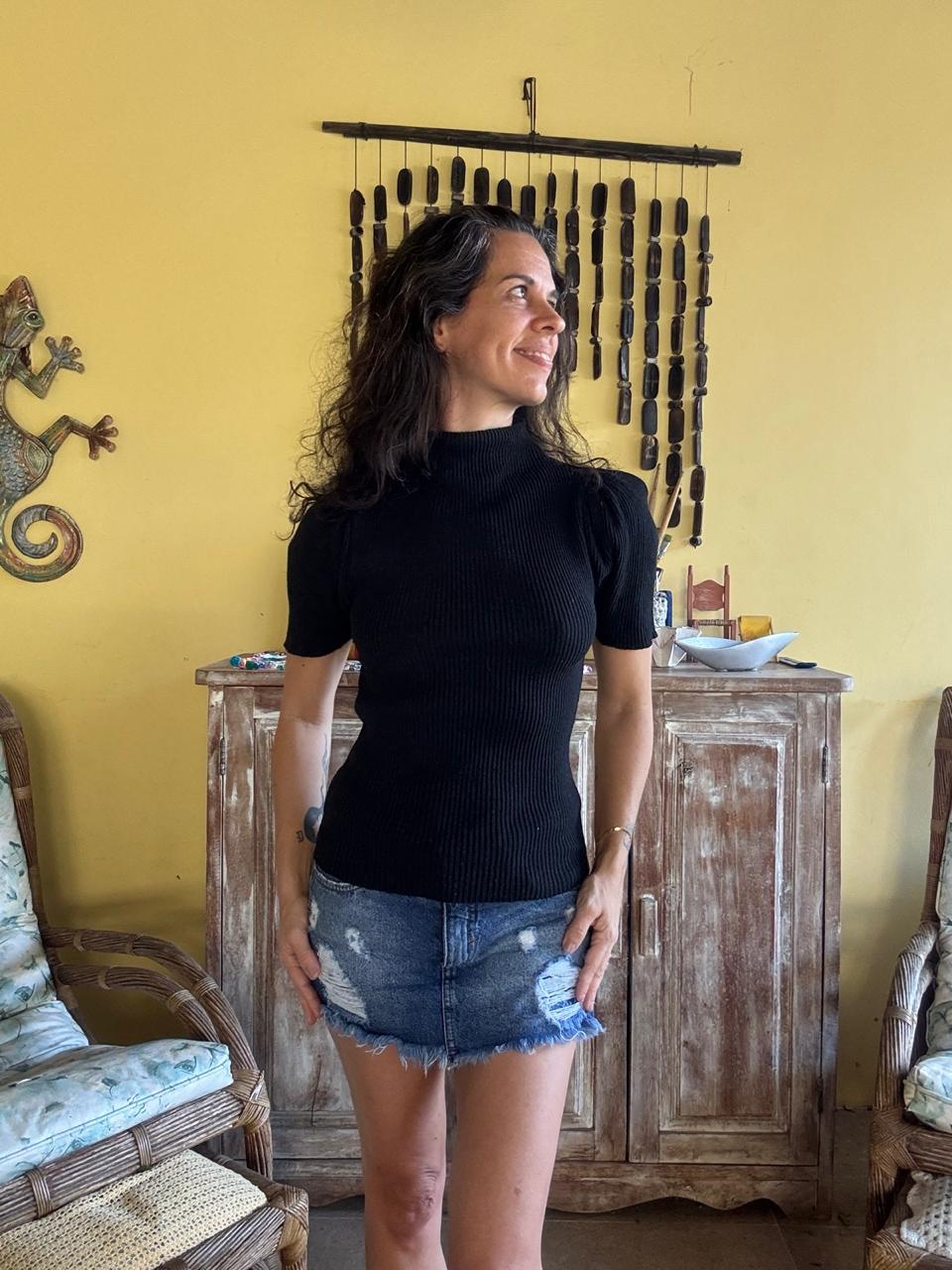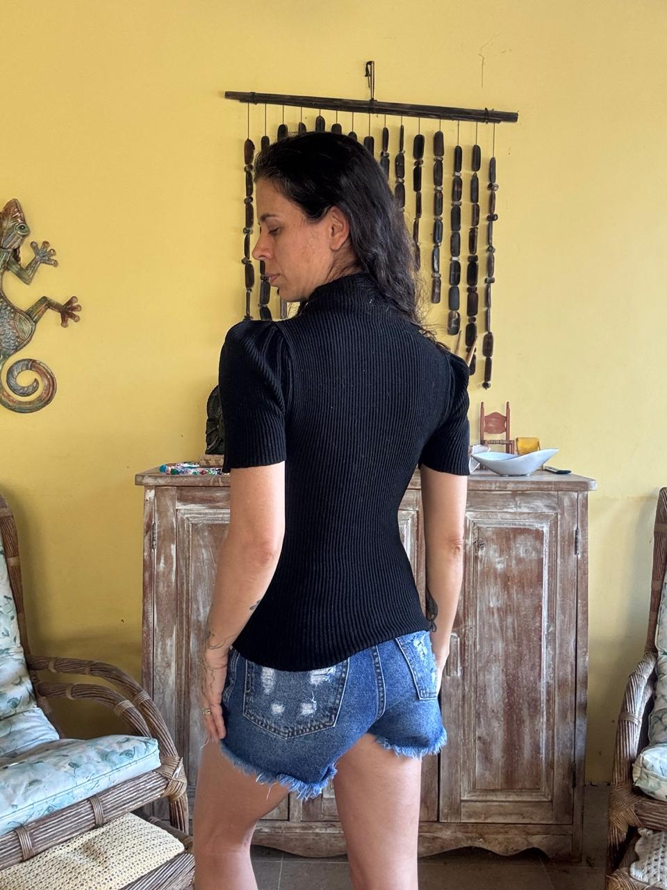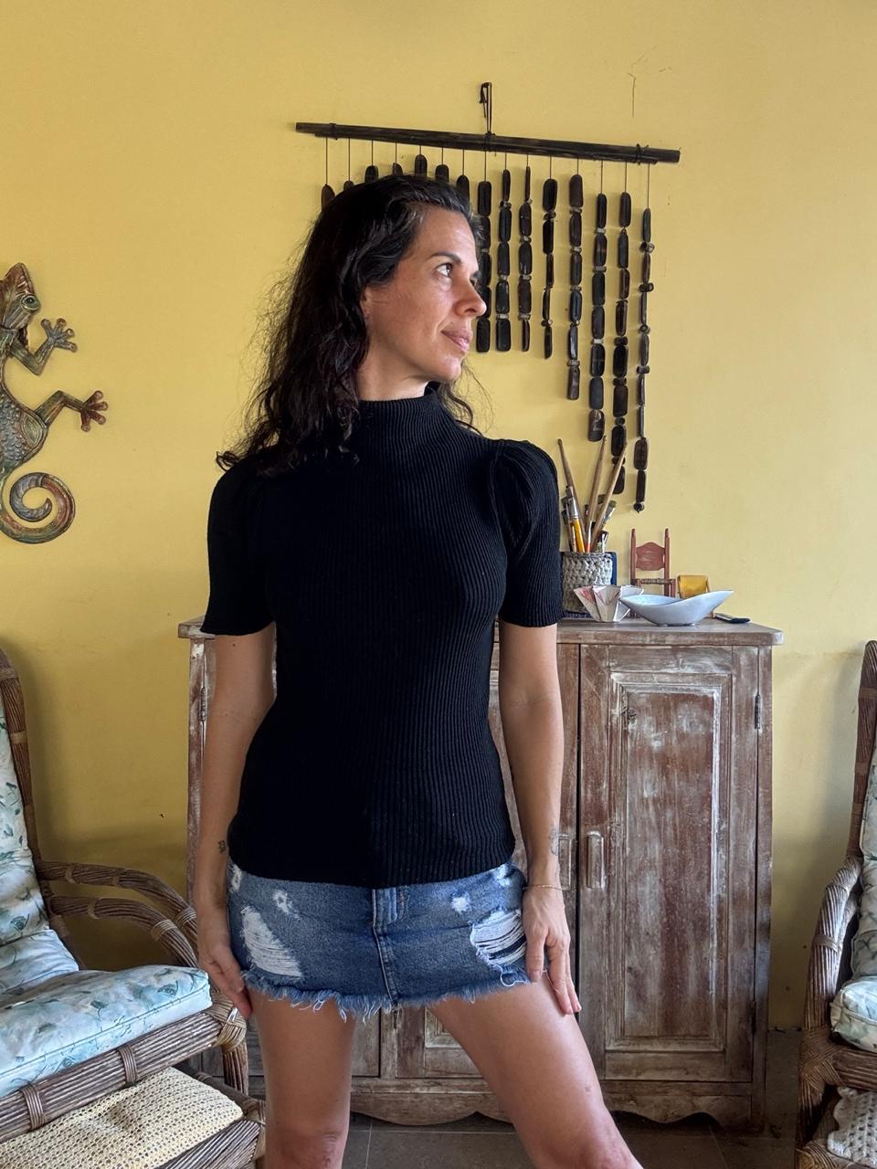 Blusa preta canelada com gola alta e mangas curtas bufantes (puff), que proporcionam um toque moderno e sofisticado. Uma peça super ajustada ao corpo, versátil para looks casuais com jeans ou mais elegantes.