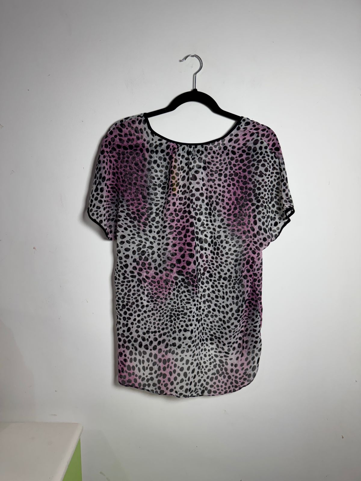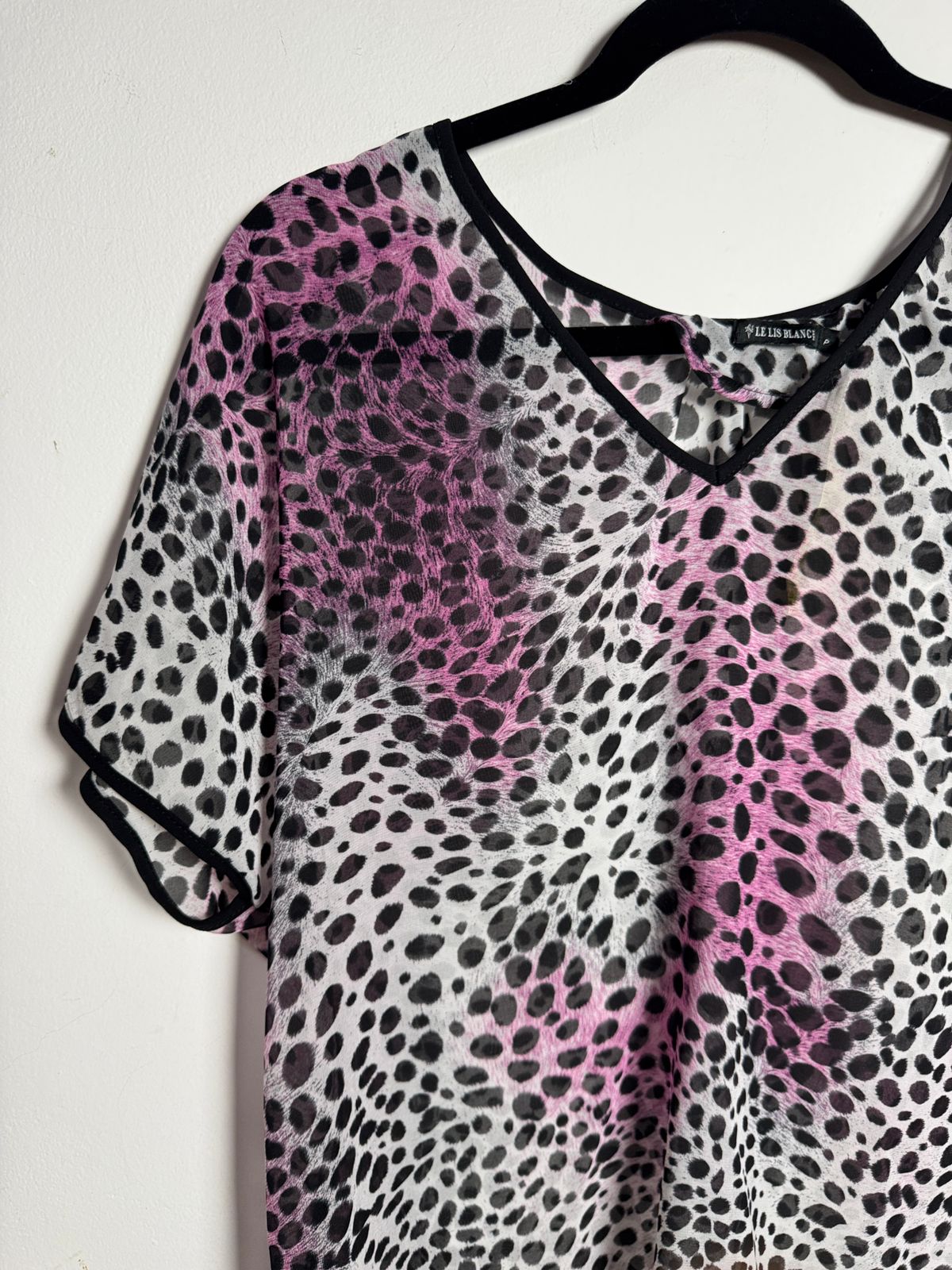 Crie um look marcante e cheio de personalidade com esta blusa leve e transparente. A estampa de oncinha em rosa e preto e as mangas curtas conferem um visual moderno e ousado para qualquer ocasião.