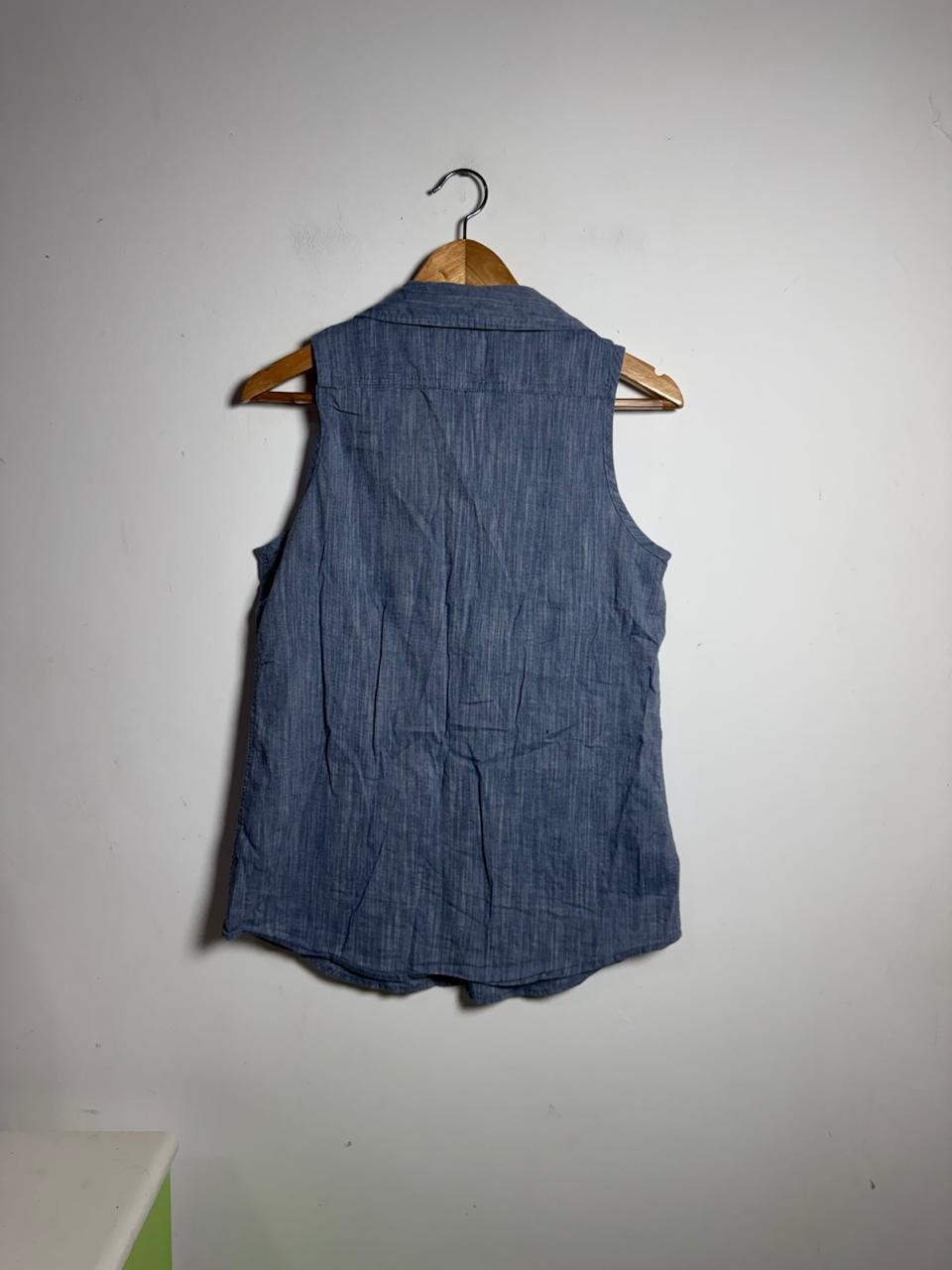 Camisa sem manga na cor azul estilo jeans com fechamento frontal por botões claros e bolso único no busto. Possui gola tradicional e caimento reto, sendo uma opção leve para composições cotidianas.