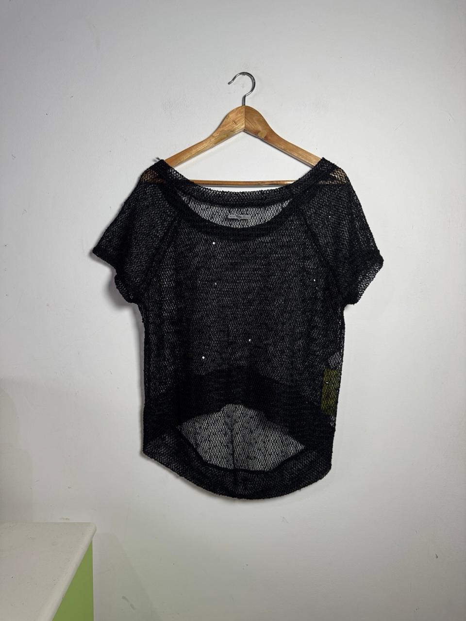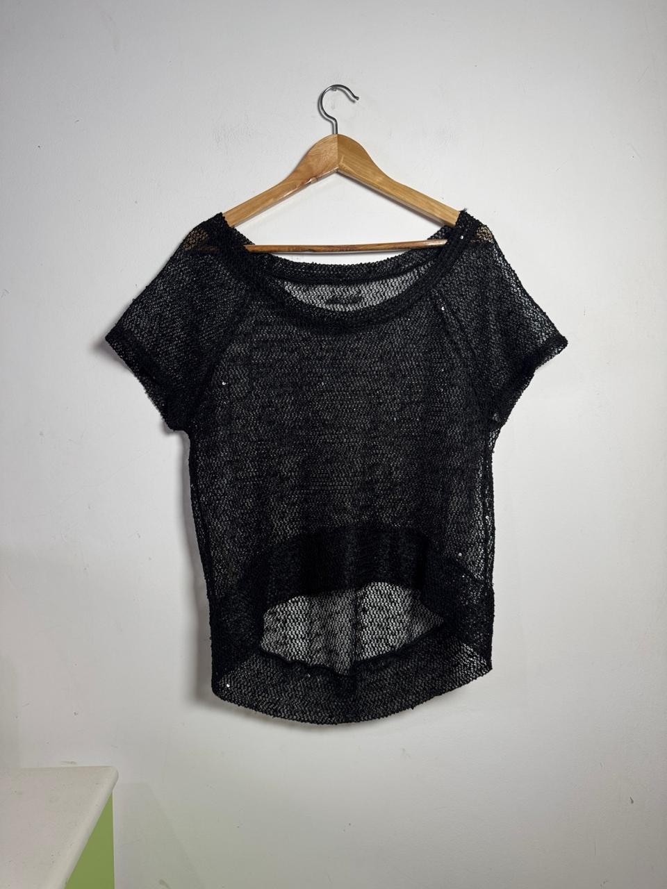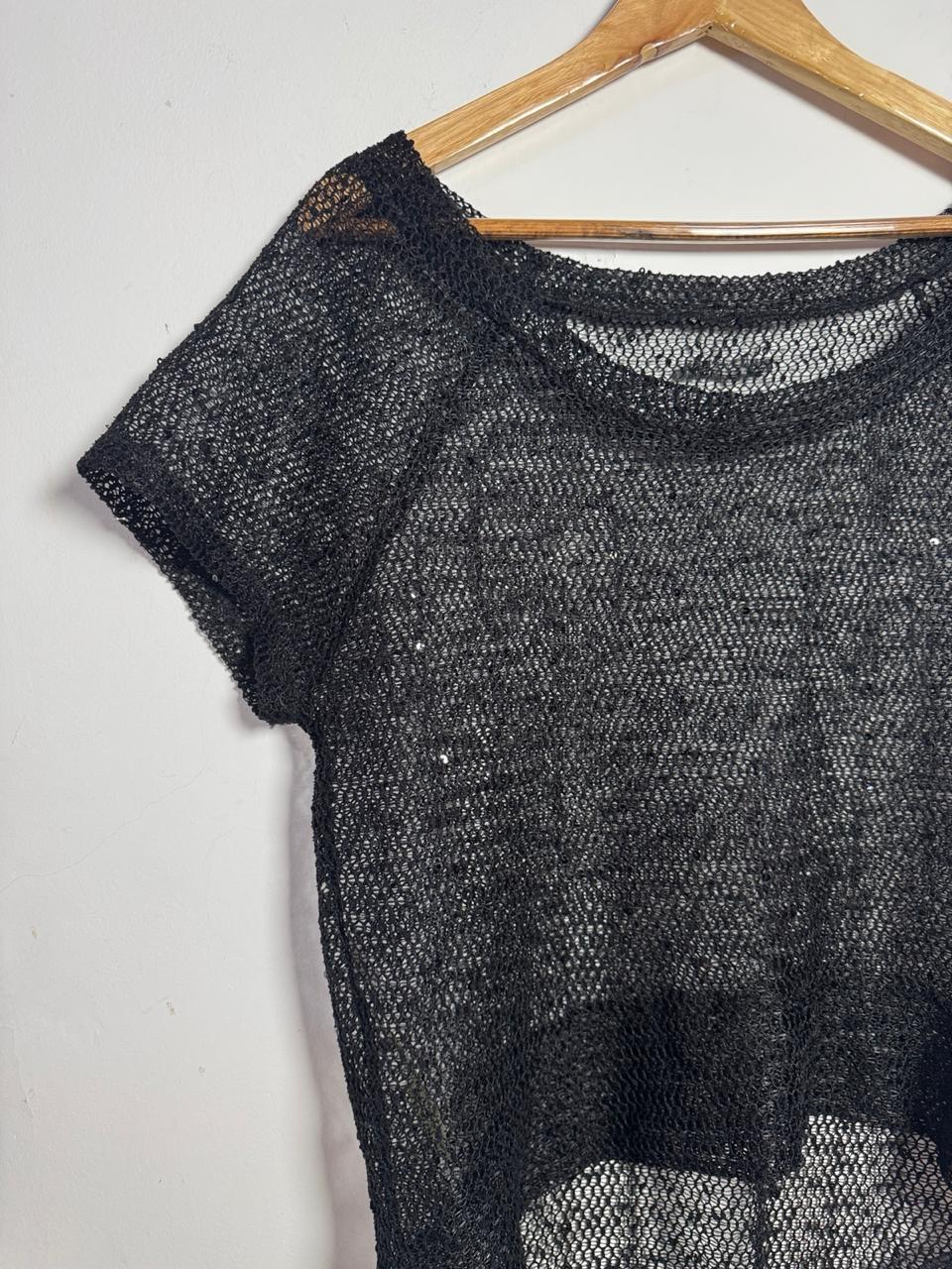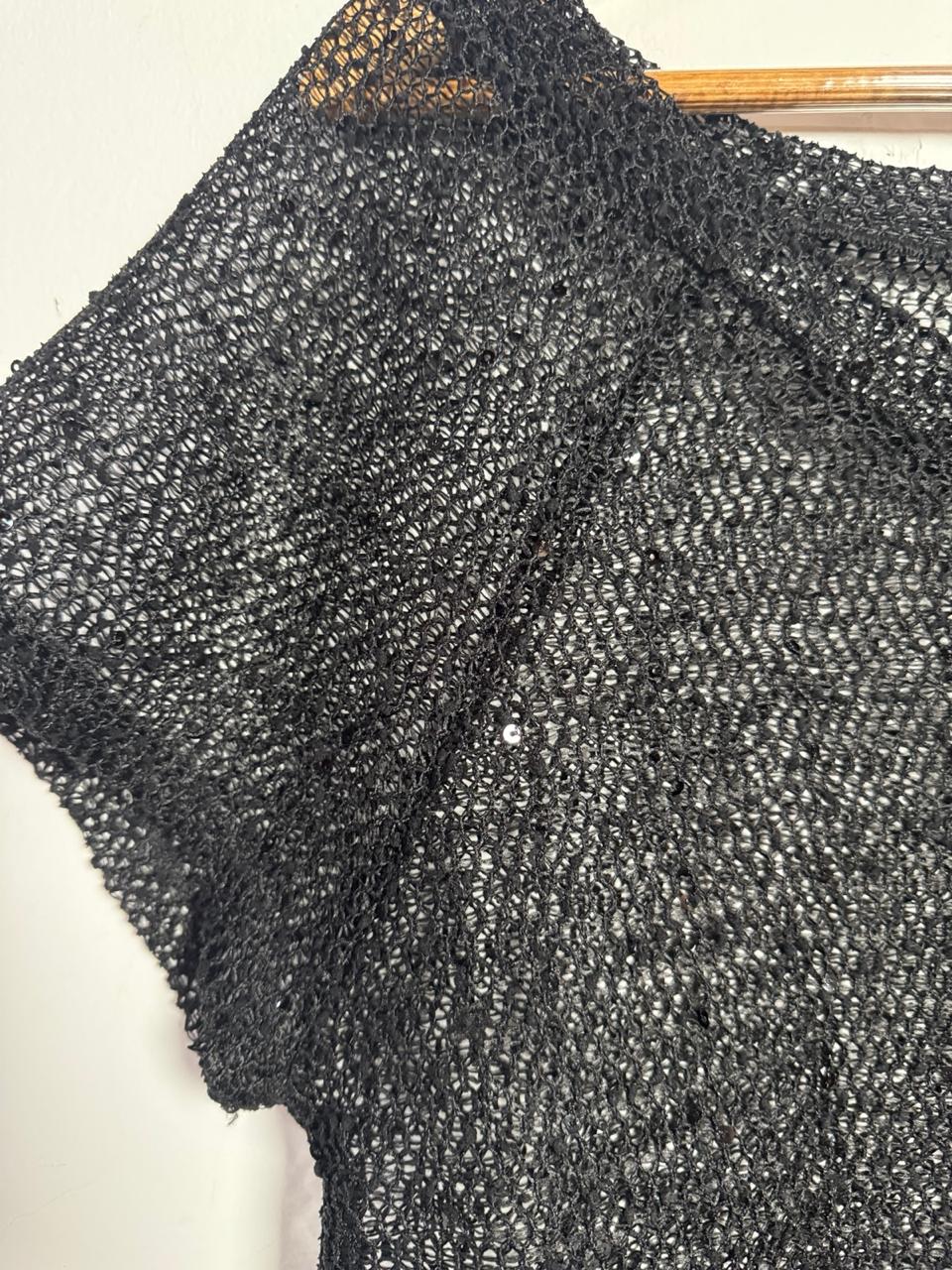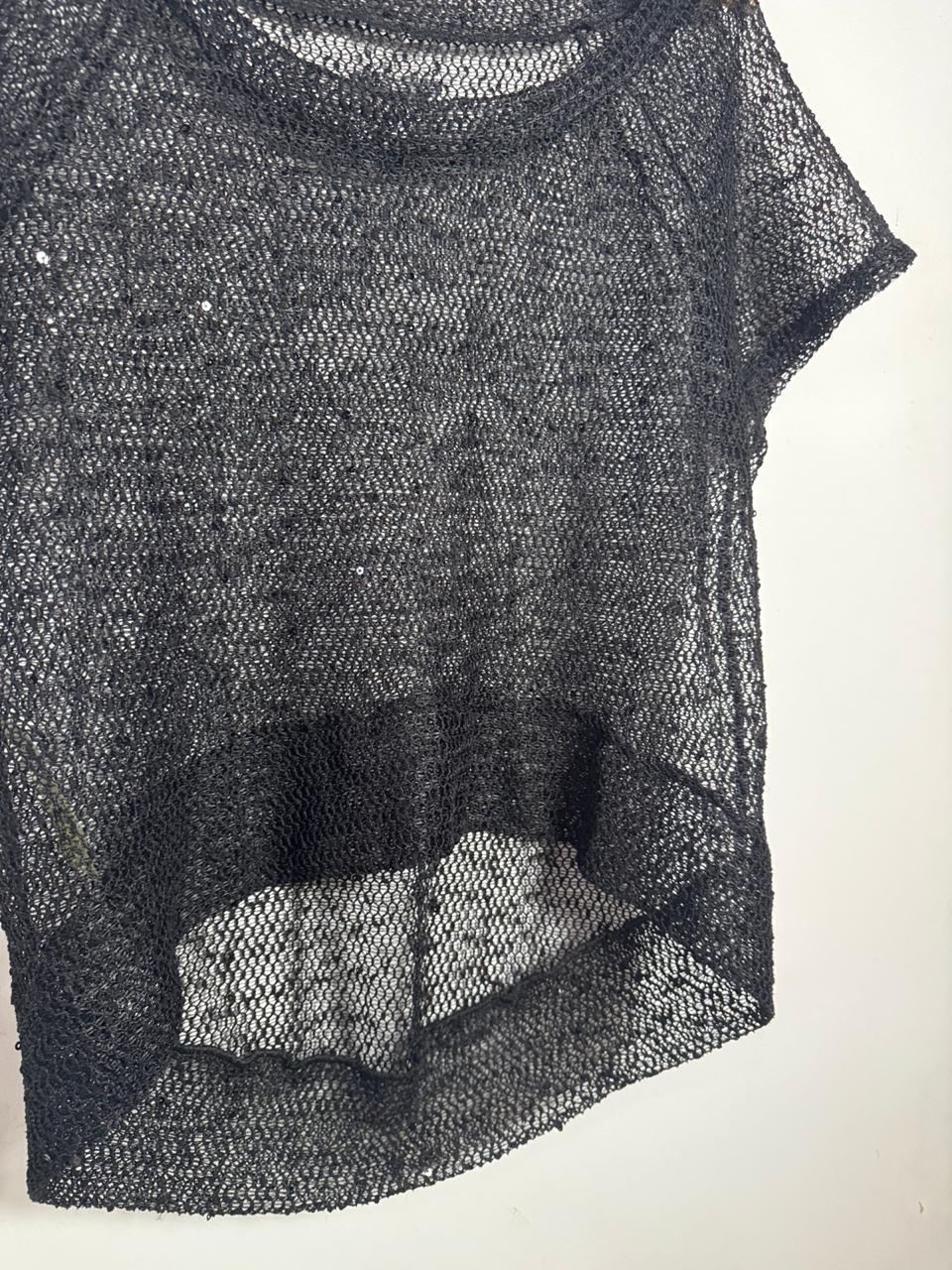 Blusa em malha de arrastão preta, com sutil aplicação de mini paetês que dão um brilho discreto. Peça fashionista e super sexy, ideal para ser usada como sobreposição com tops e biquínis.