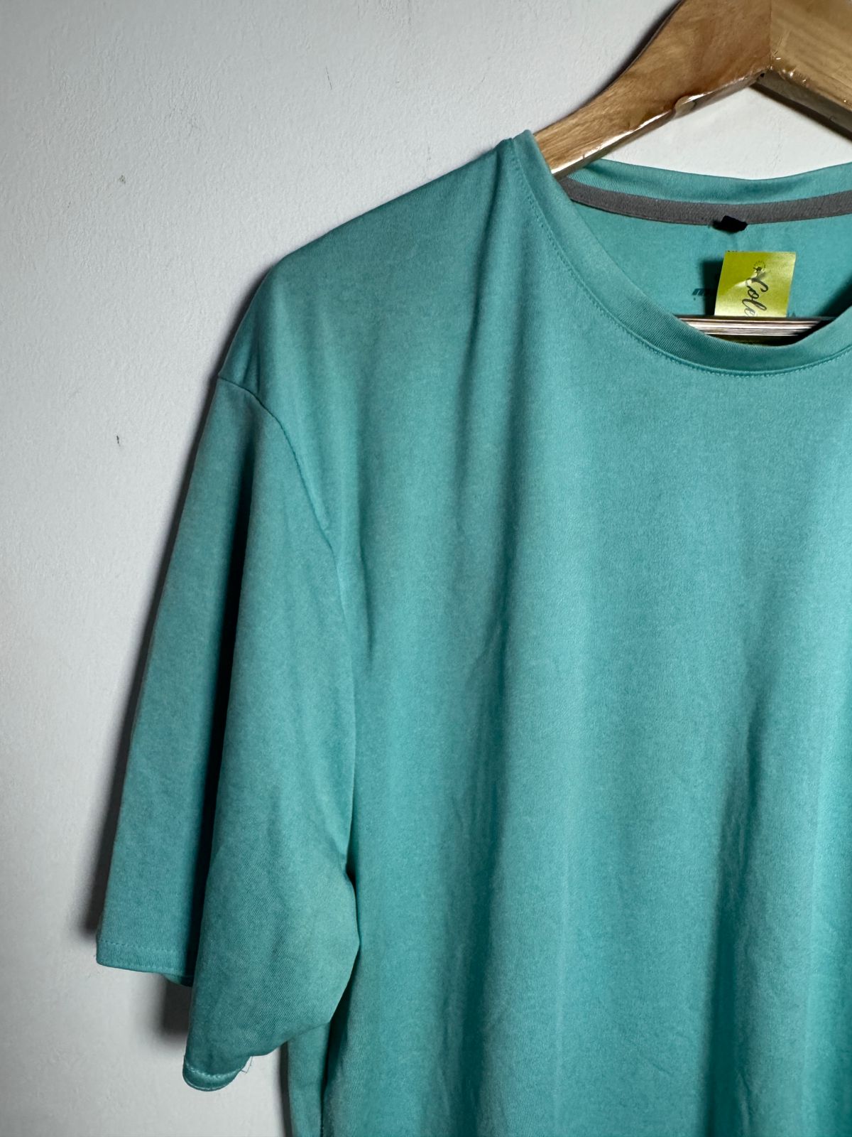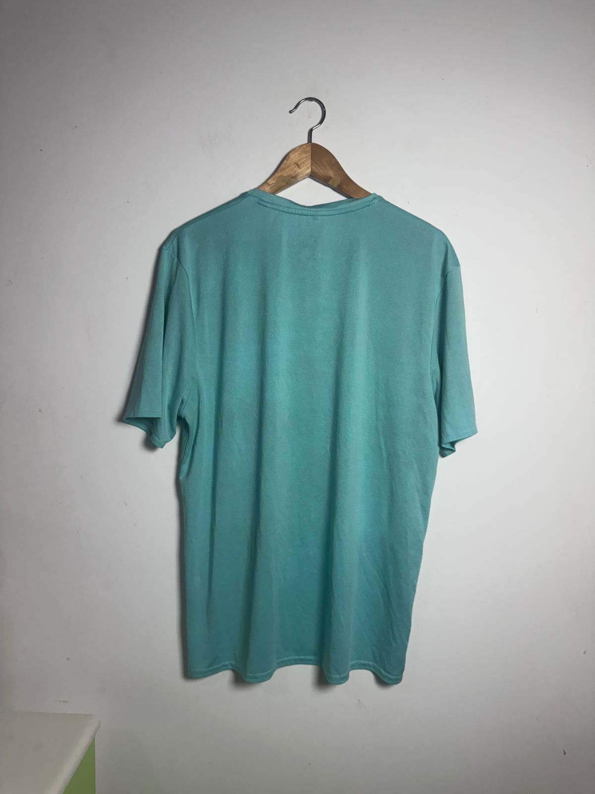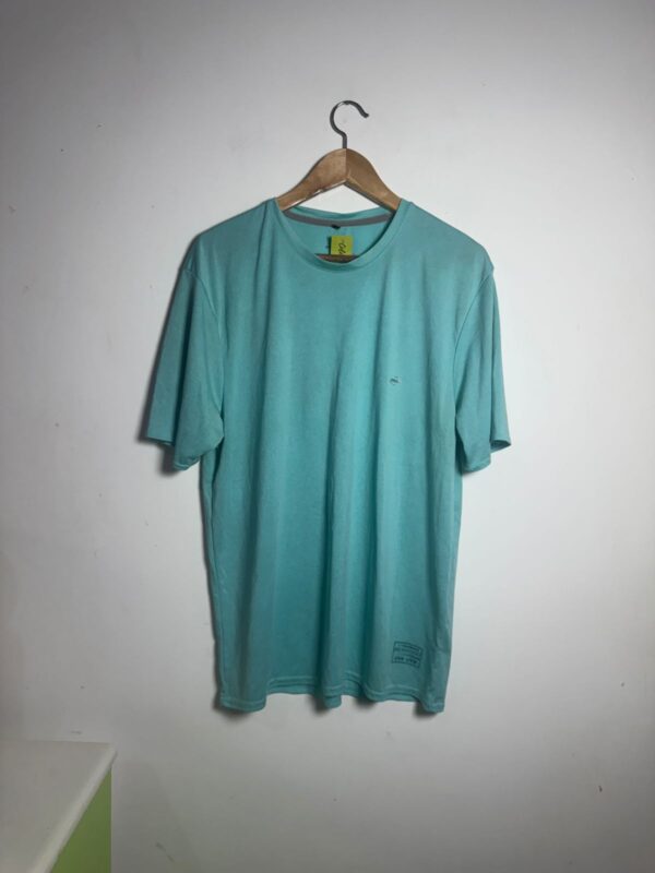 Camiseta básica de malha no tom azul/verde água (turquesa) estonado, gola redonda e modelagem clássica. Peça confortável e essencial para o dia a dia, com proteção UV.