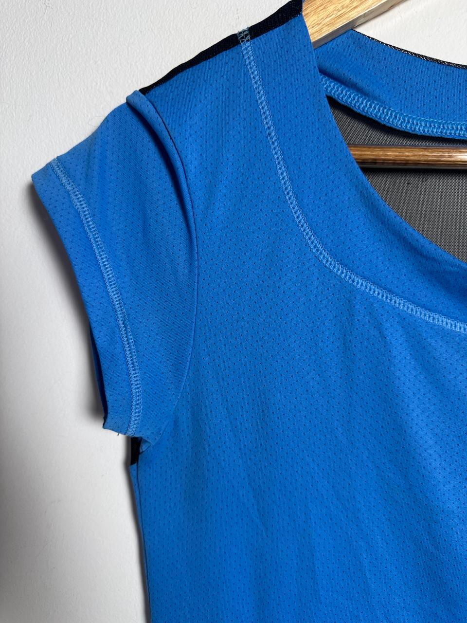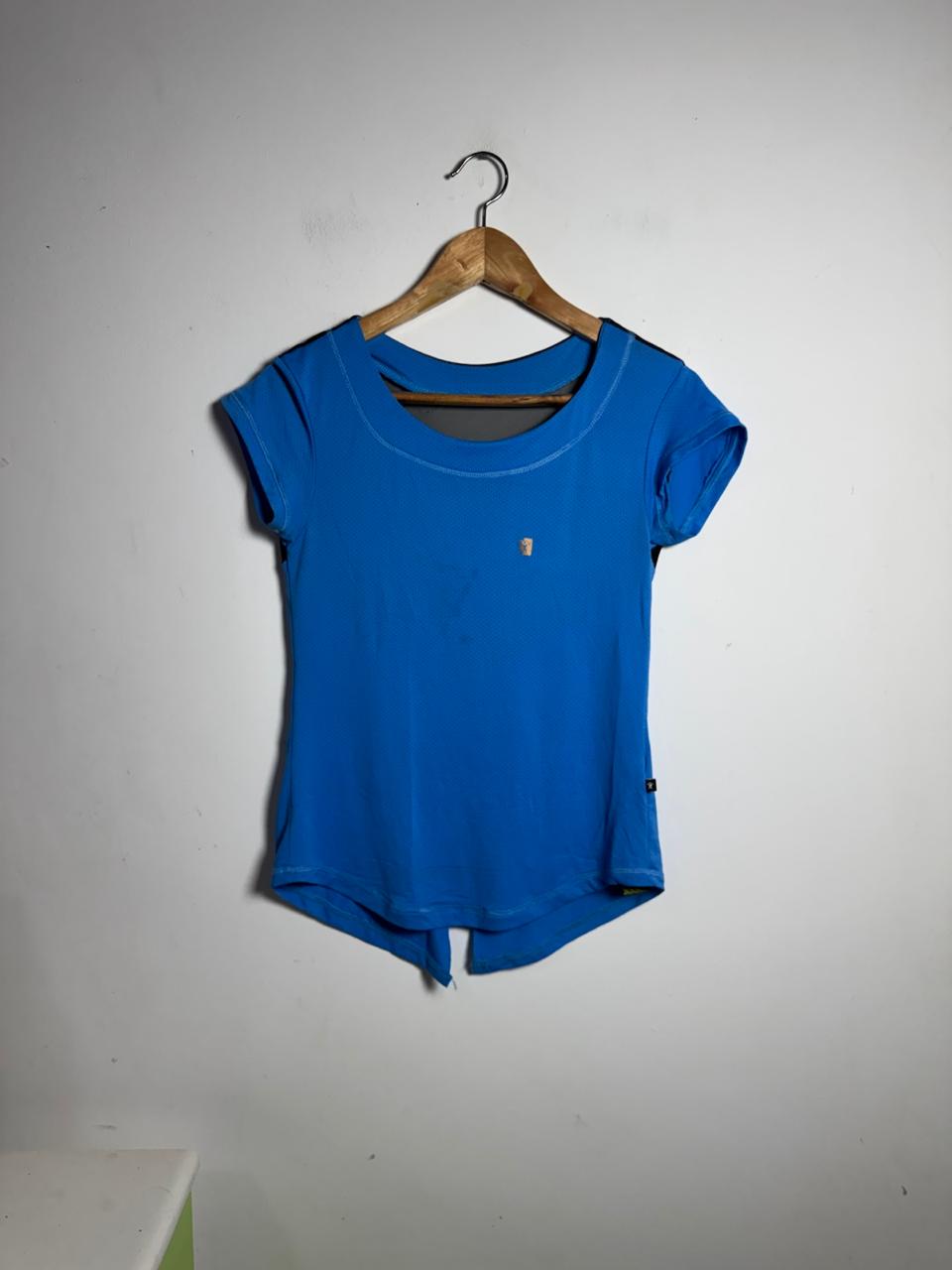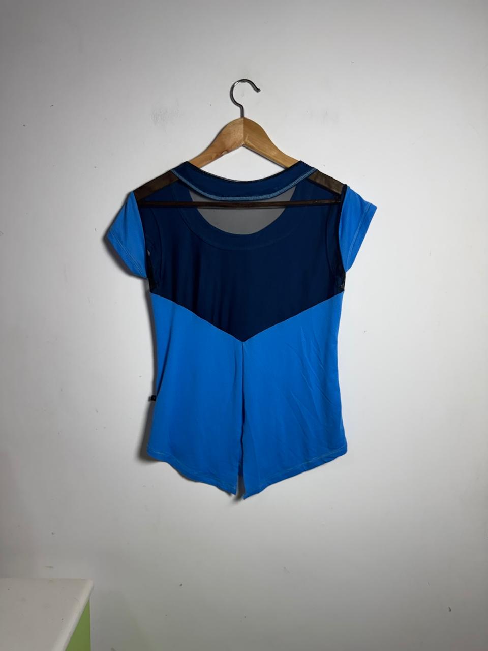 Camiseta de manga curta na cor azul vibrante com recortes em tela preta nos ombros e costas. Modelo soltinho com barra arredondada, excelente para práticas esportivas.