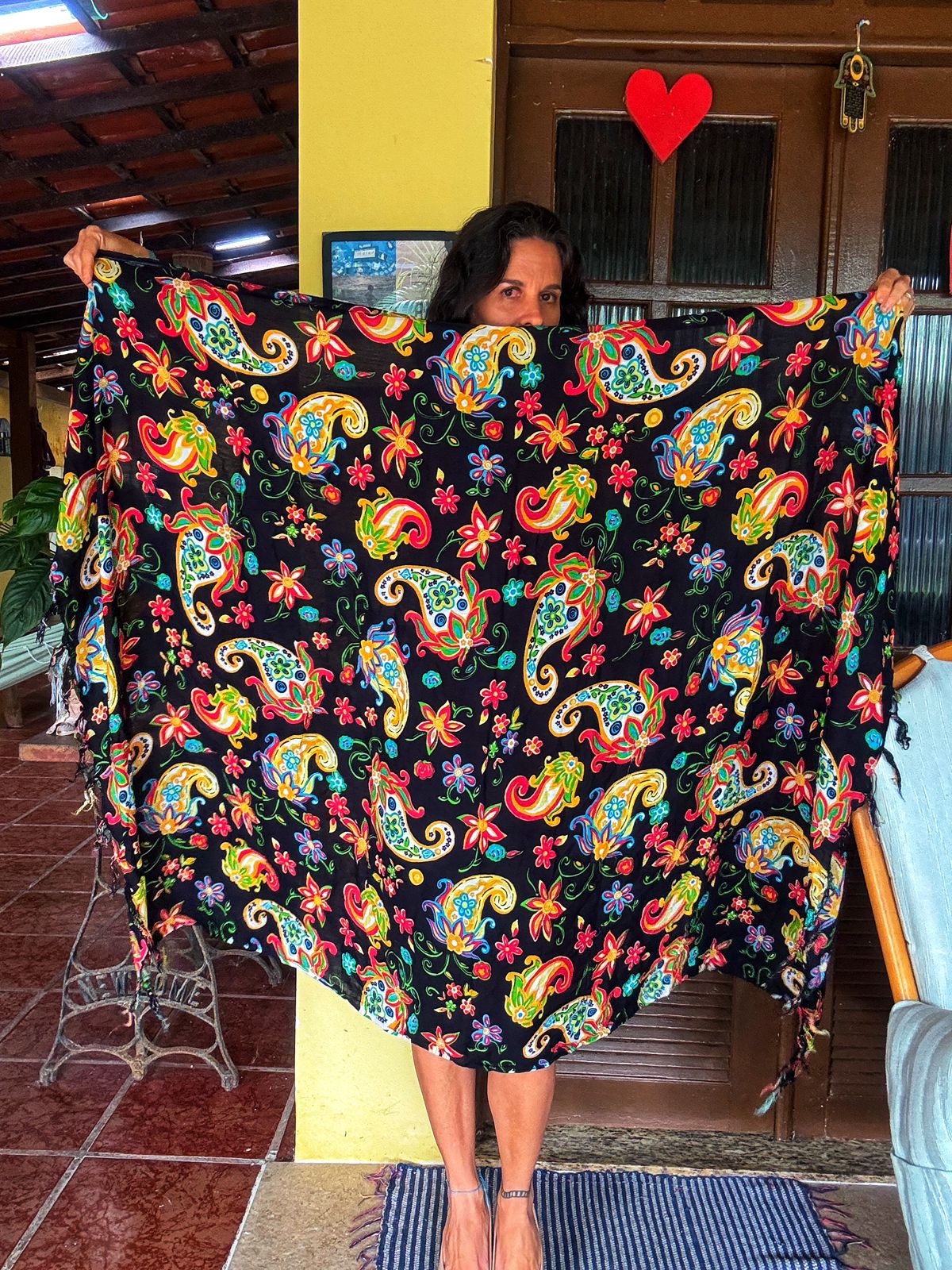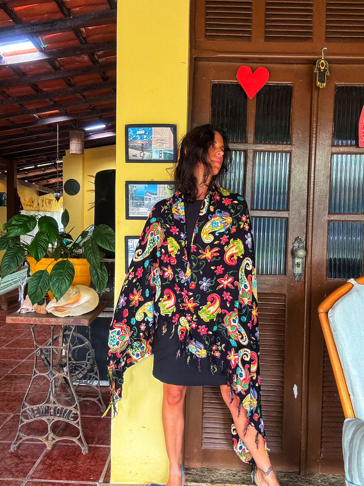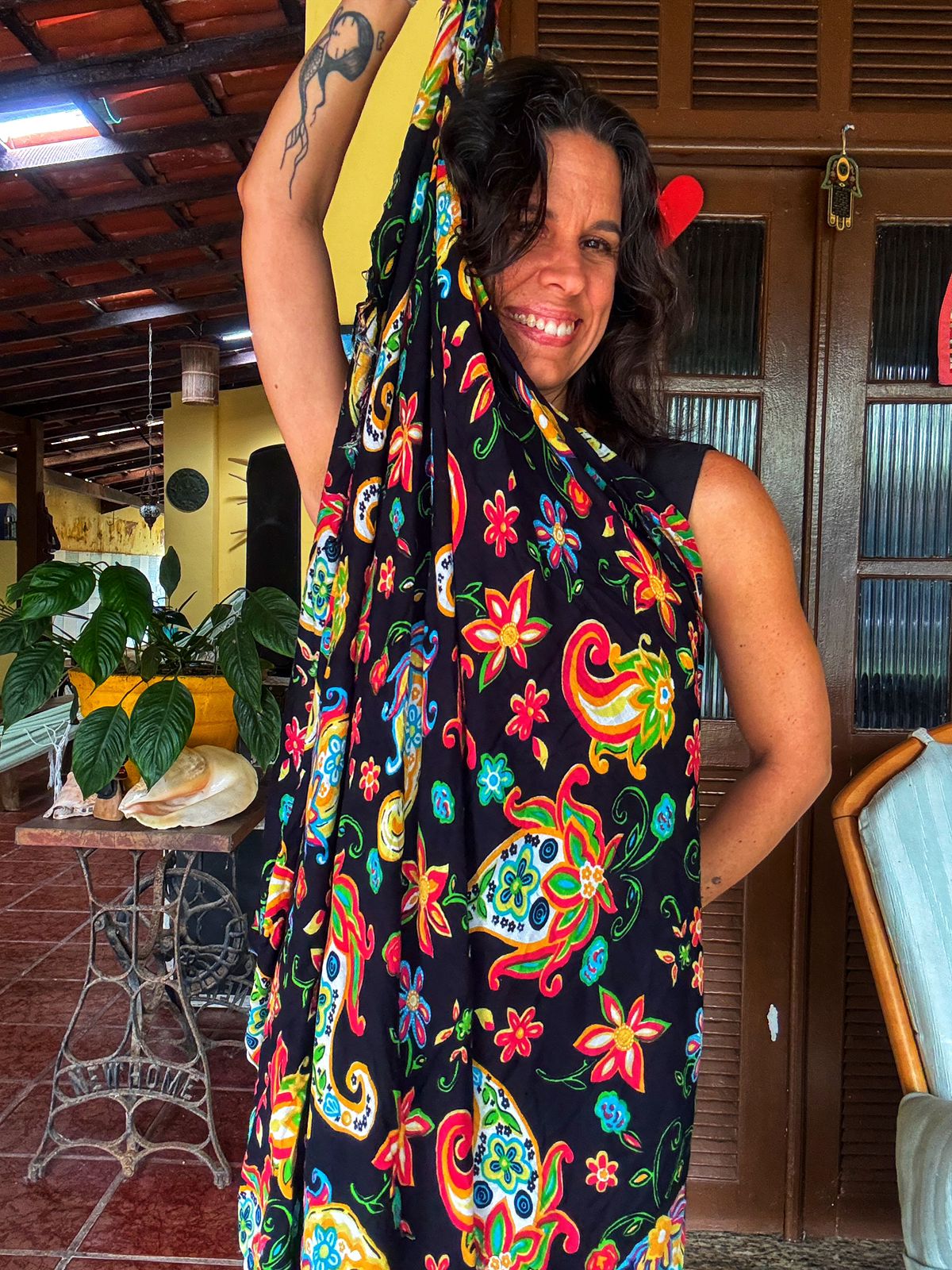 Esta canga vibrante em fundo preto, com estampas paisley e florais coloridas, é o acessório perfeito para realçar seu estilo na praia ou piscina. Um toque de alegria e versatilidade para seus dias de sol!