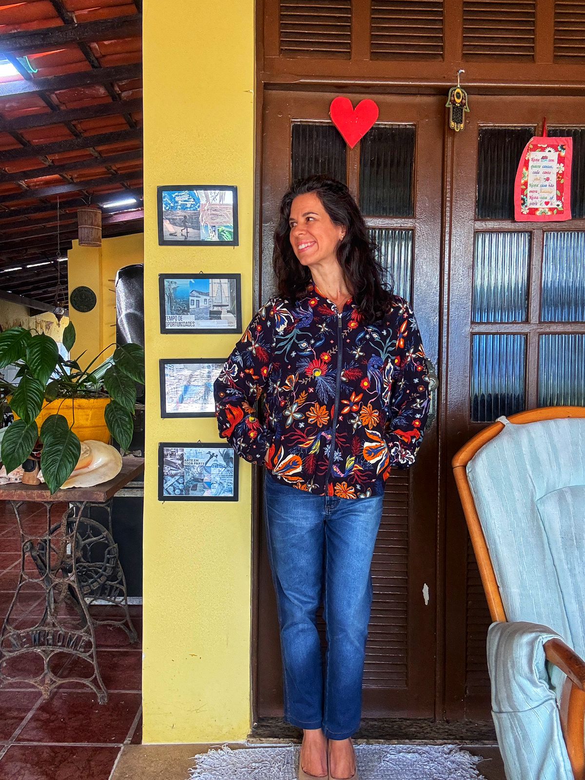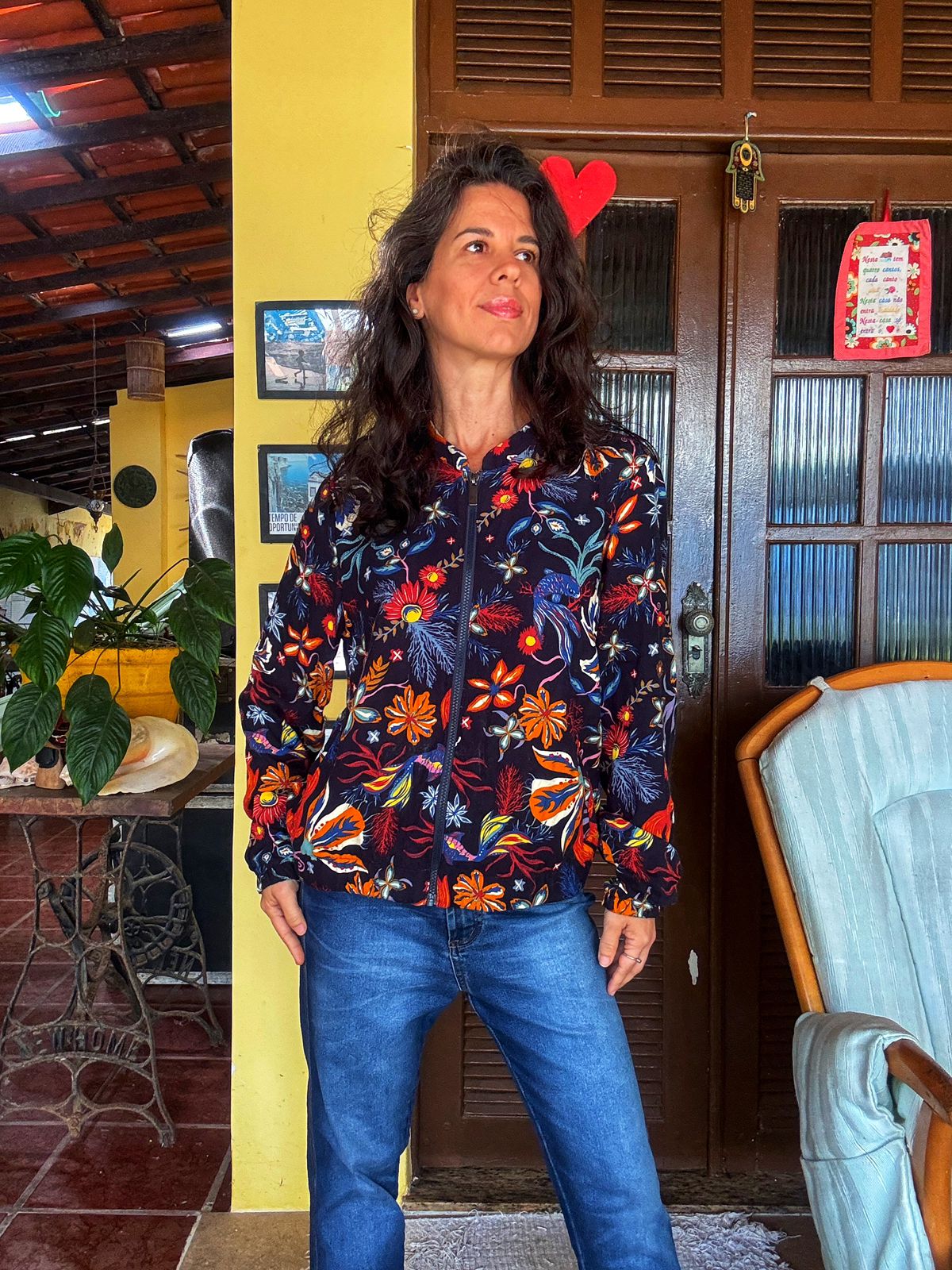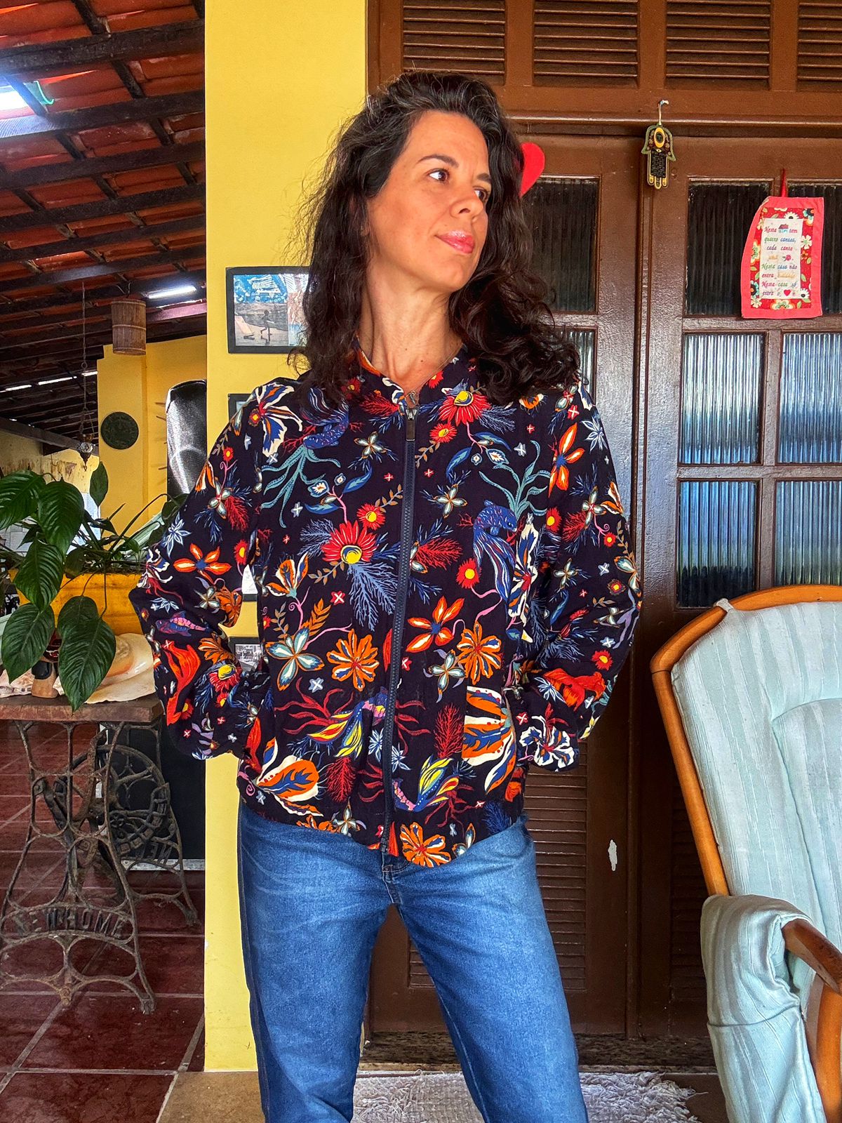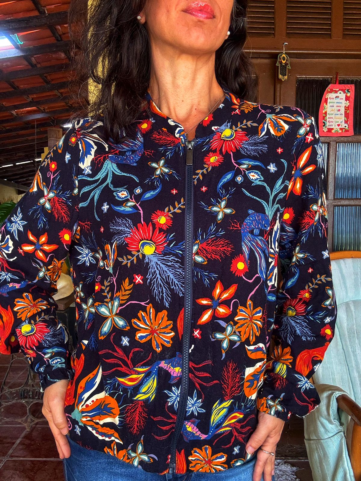 Jaqueta bomber em tecido de nylon preto com estampa vibrante (floral/tropical) nas cores vermelho, laranja, azul e amarelo. Possui zíper frontal e gola de beisebol, sendo a terceira peça perfeita para dar um toque cool e alegre a qualquer look.