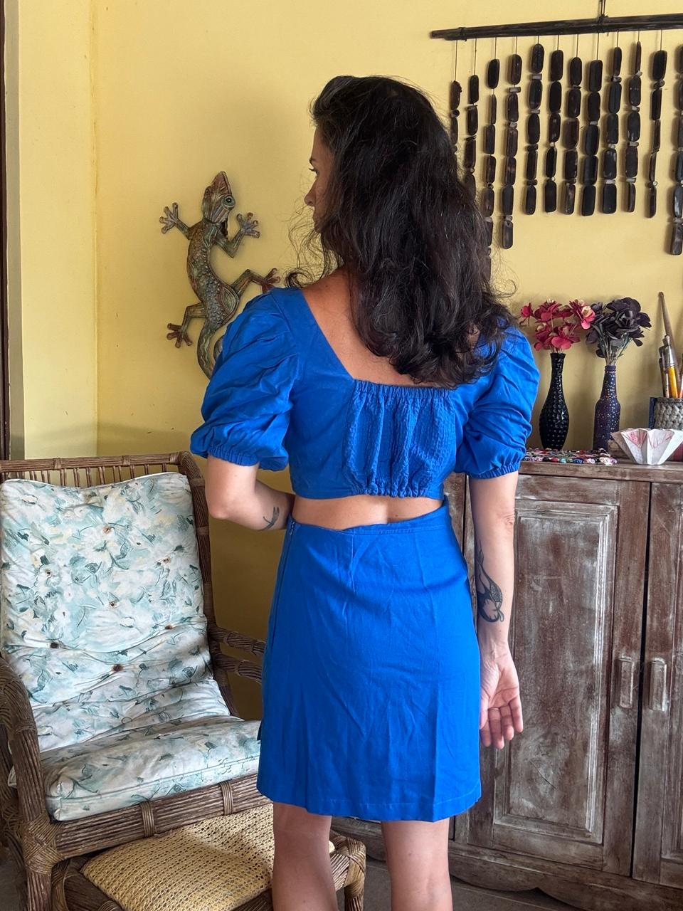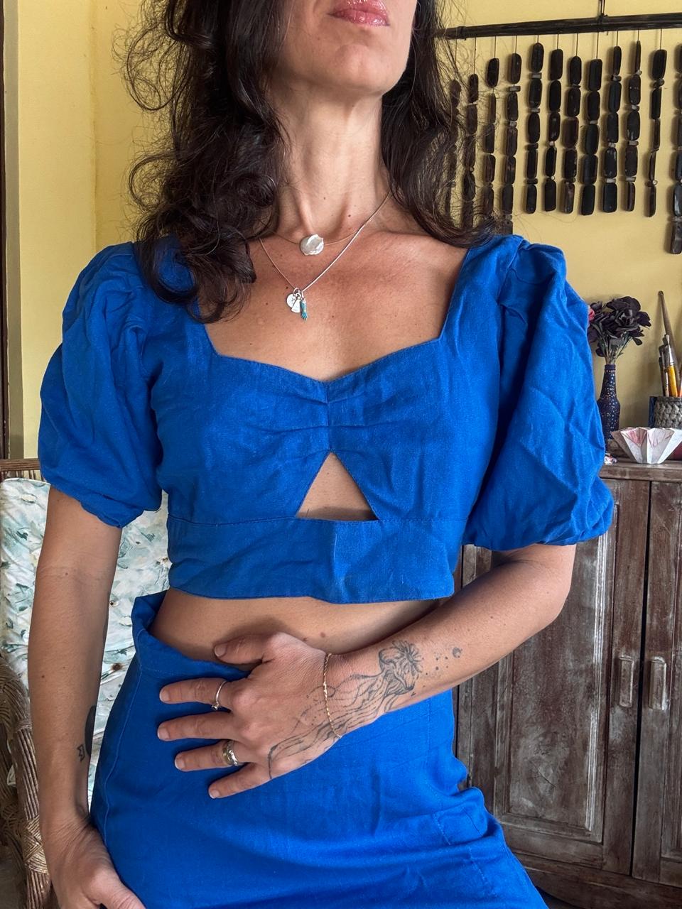 Conjunto azul royal com top cropped de mangas bufantes e decote diferenciado, além de saia com fenda lateral. Elegante e moderno para diversas ocasiões!