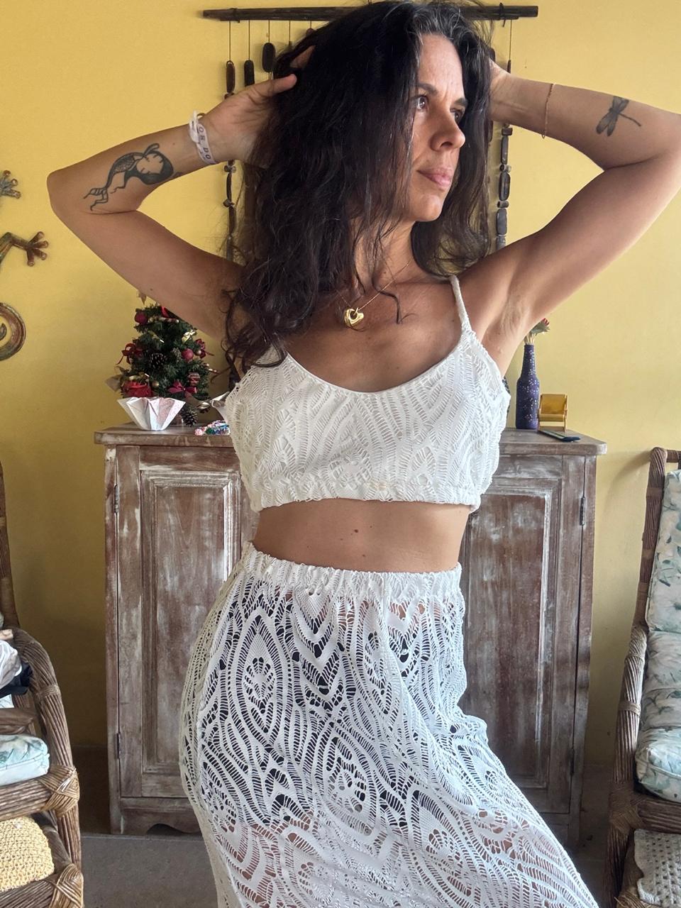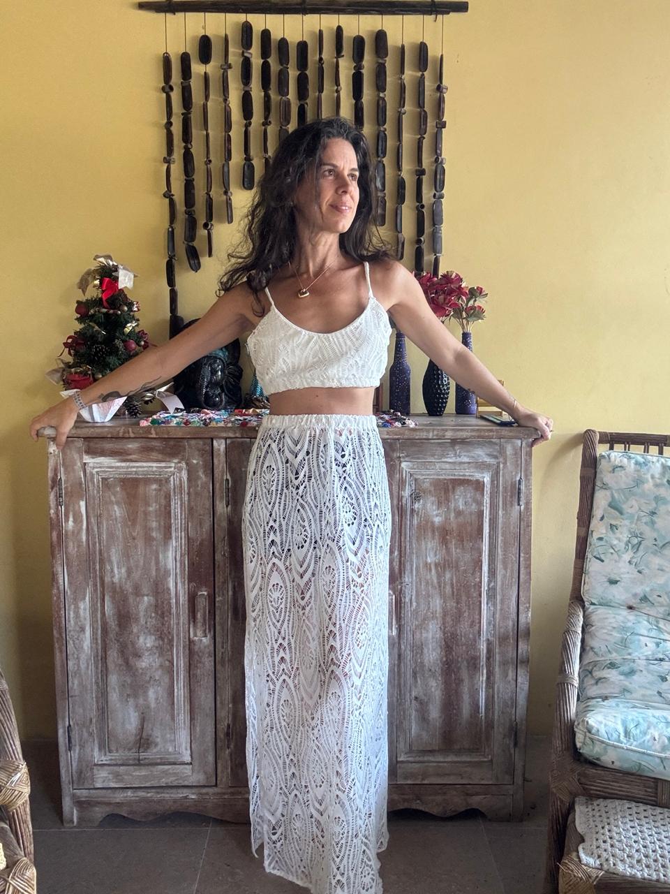Conjunto composto por top cropped de alças finas e saia longa em renda trabalhada com desenhos geométricos vazados. A combinação exibe uma modelagem ajustada que valoriza a silhueta, sendo uma escolha marcante para ocasiões na praia ou festas de verão.