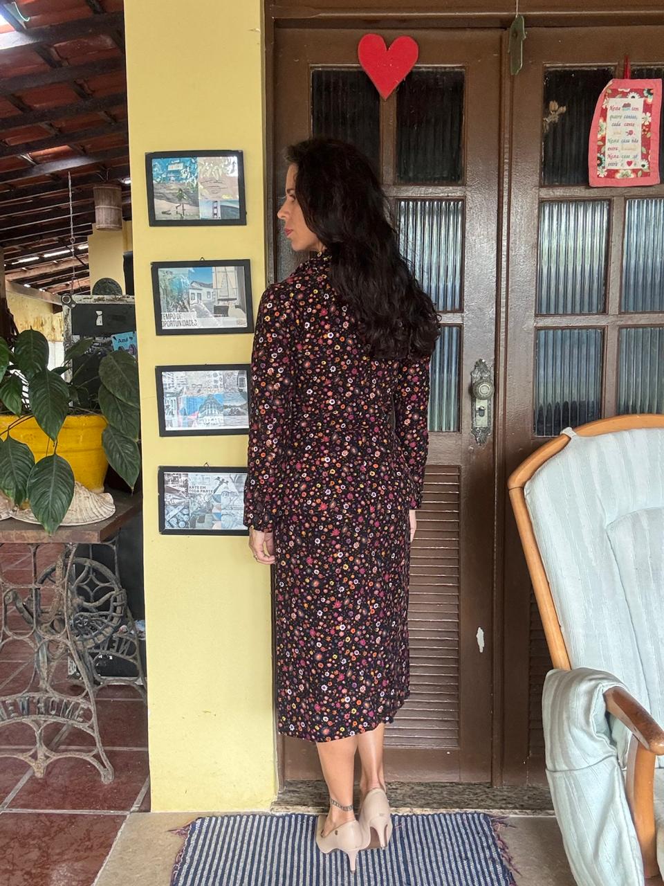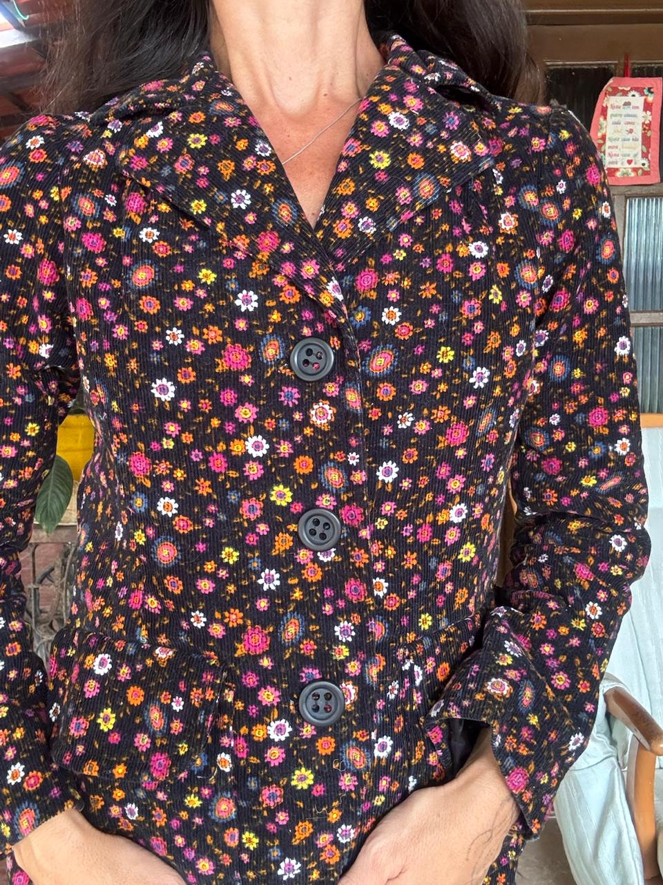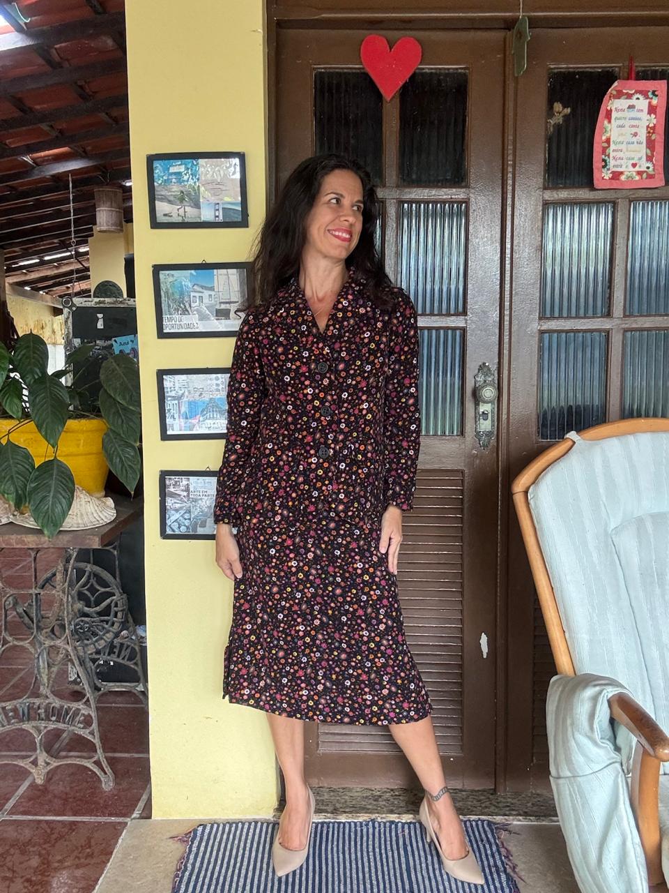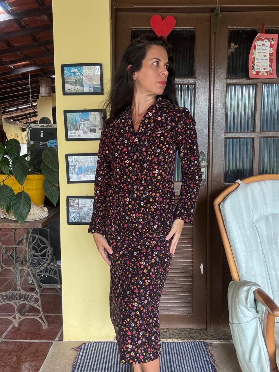 Conjunto composto por casaco de mangas longas com botões frontais e saia de comprimento midi. A peça apresenta estampa de pequenas flores coloridas, sendo uma escolha elegante para eventos sociais ou dias com temperaturas amenas.