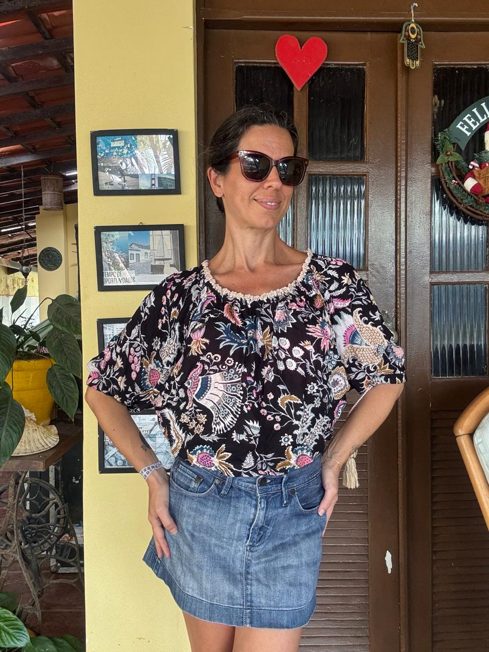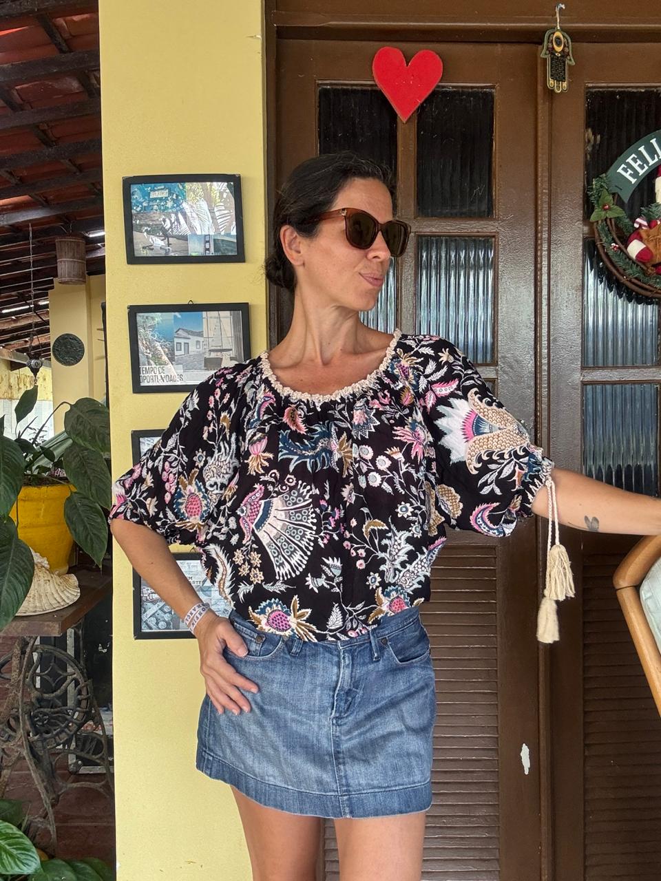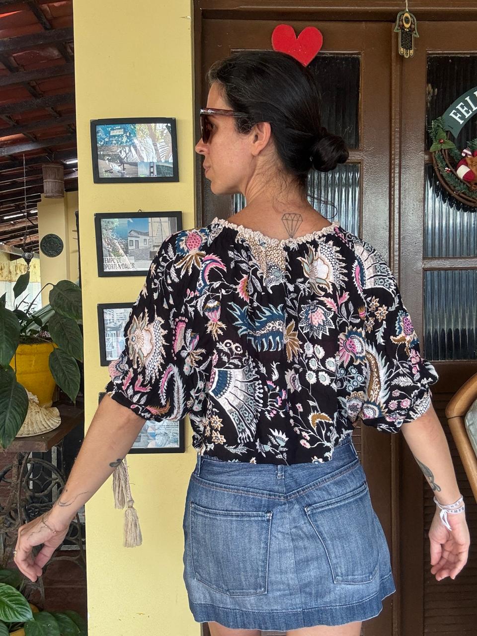 Blusa de modelagem curta e solta que exibe padronagem étnica multicolorida sobre fundo escuro com acabamento rendado no decote. O design conta com mangas bufantes finalizadas por cordões ornamentados, compondo produções românticas quando combinada a saias jeans de cintura alta.
