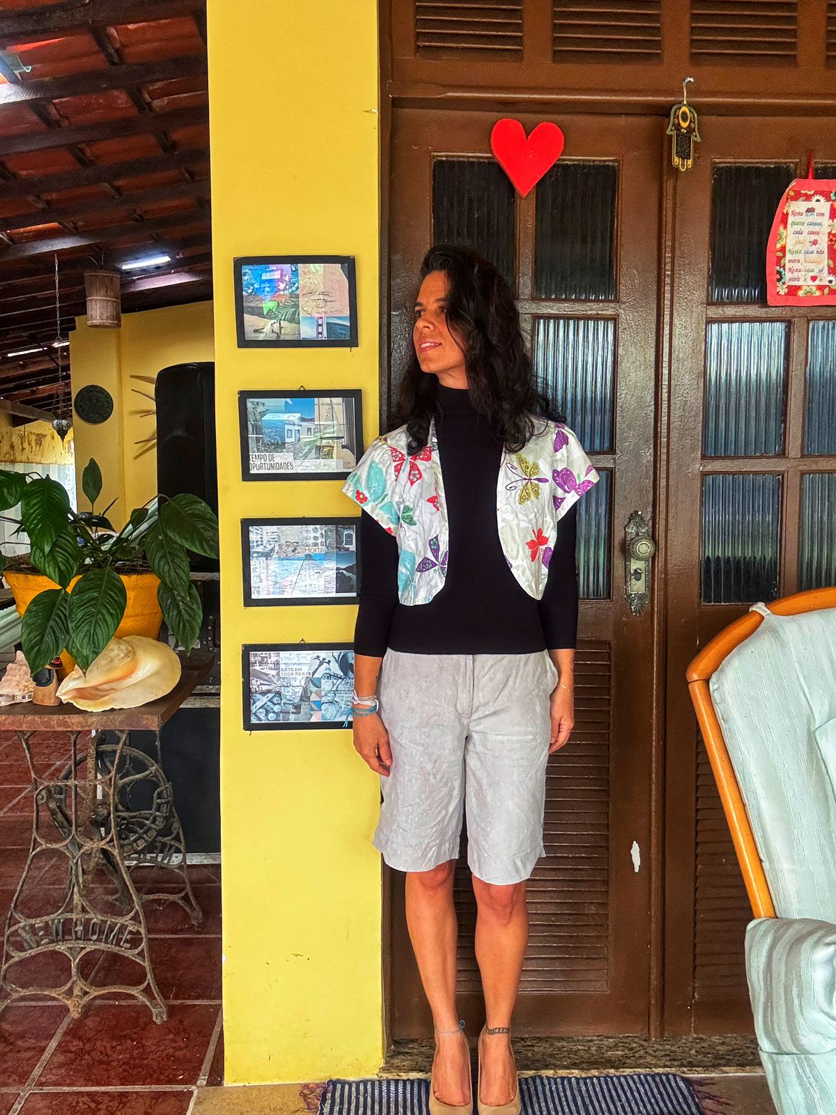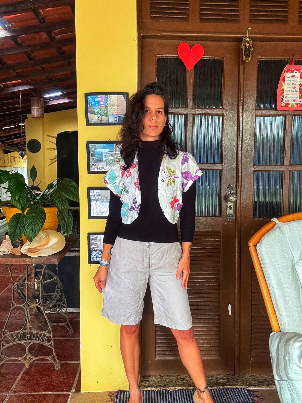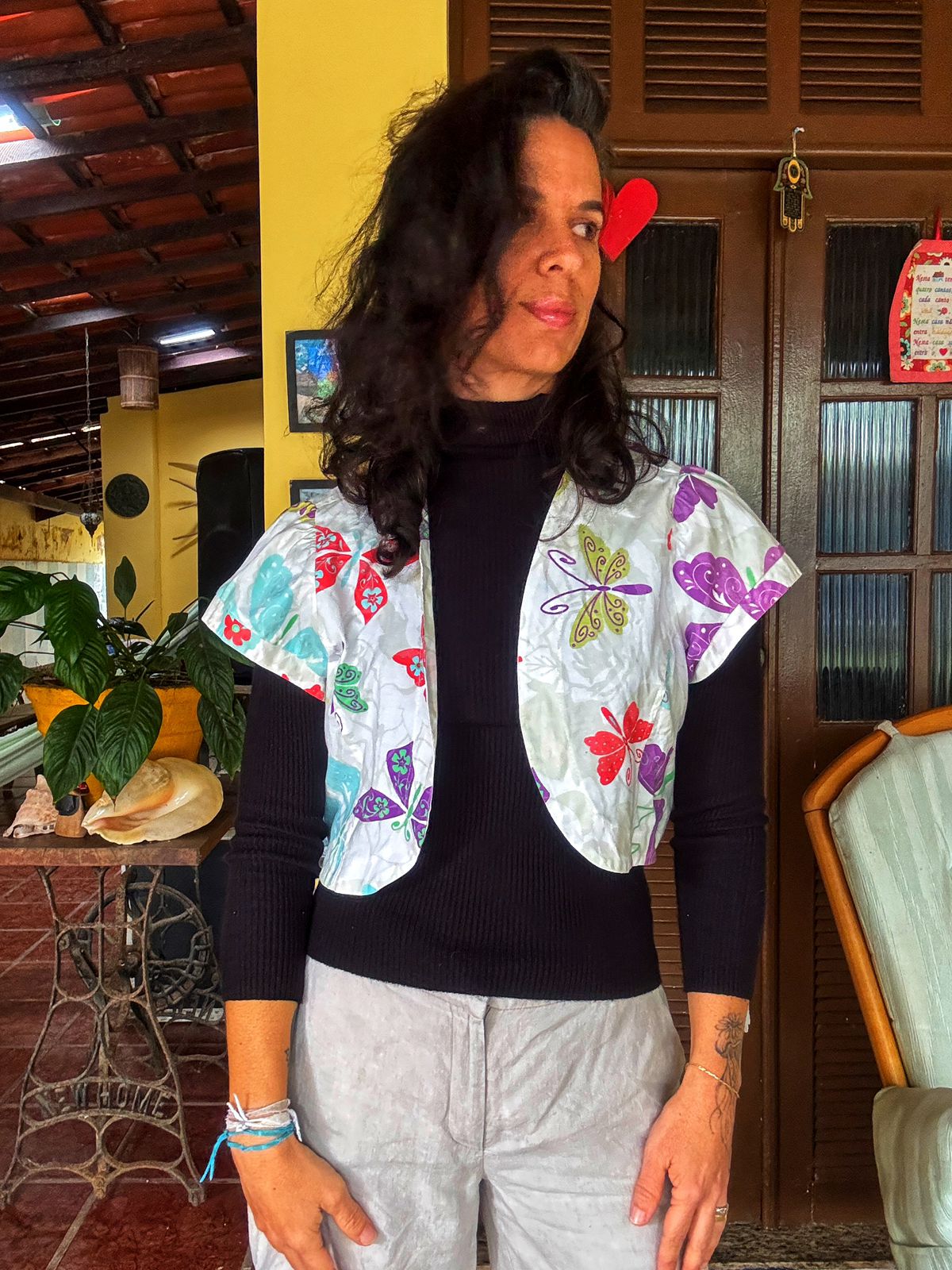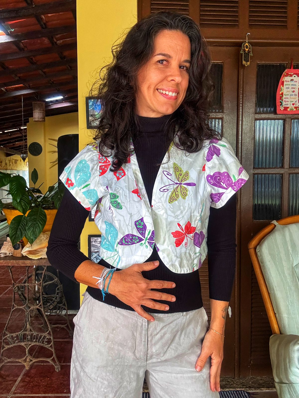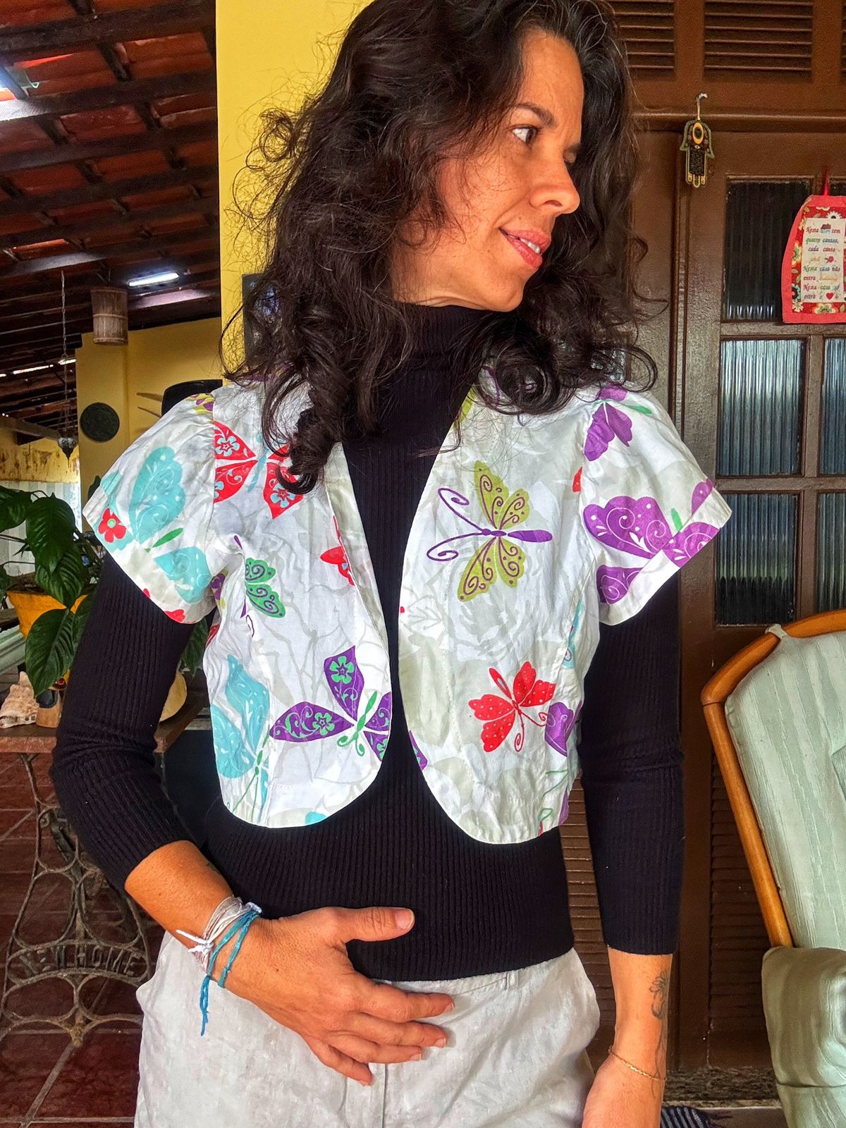 Colete cropped em tecido leve com estampa de borboletas, ideal para sobreposições. Perfeito para dar um up no visual, seja com uma blusa de manga longa ou uma regata simples