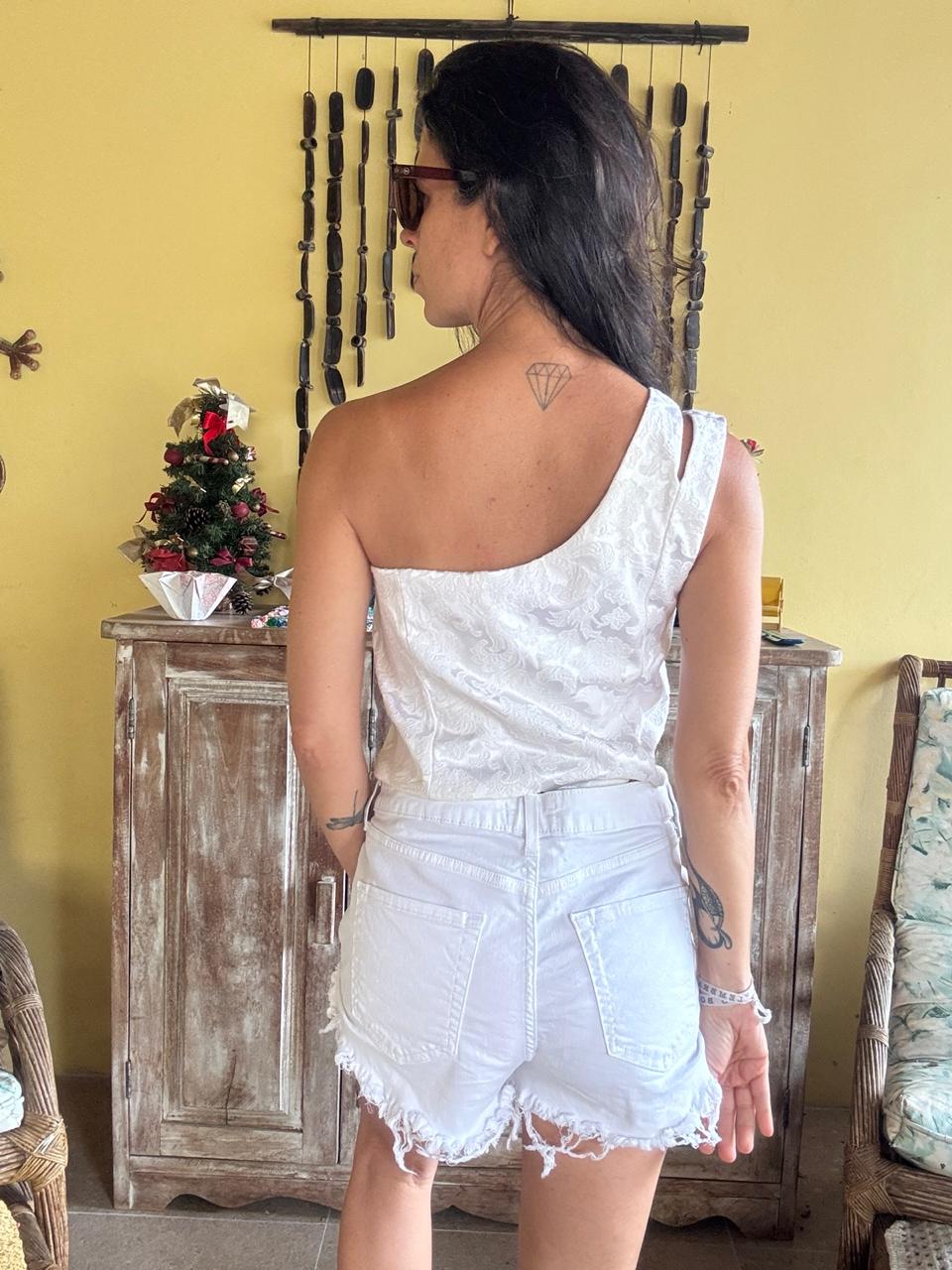 Peça em tecido jacquard com padronagem floral em relevo e design assimétrico de um ombro só com detalhe vazado na alça. A modelagem ajustada ao corpo conta com pences estruturais que garantem um caimento elegante e sofisticado.