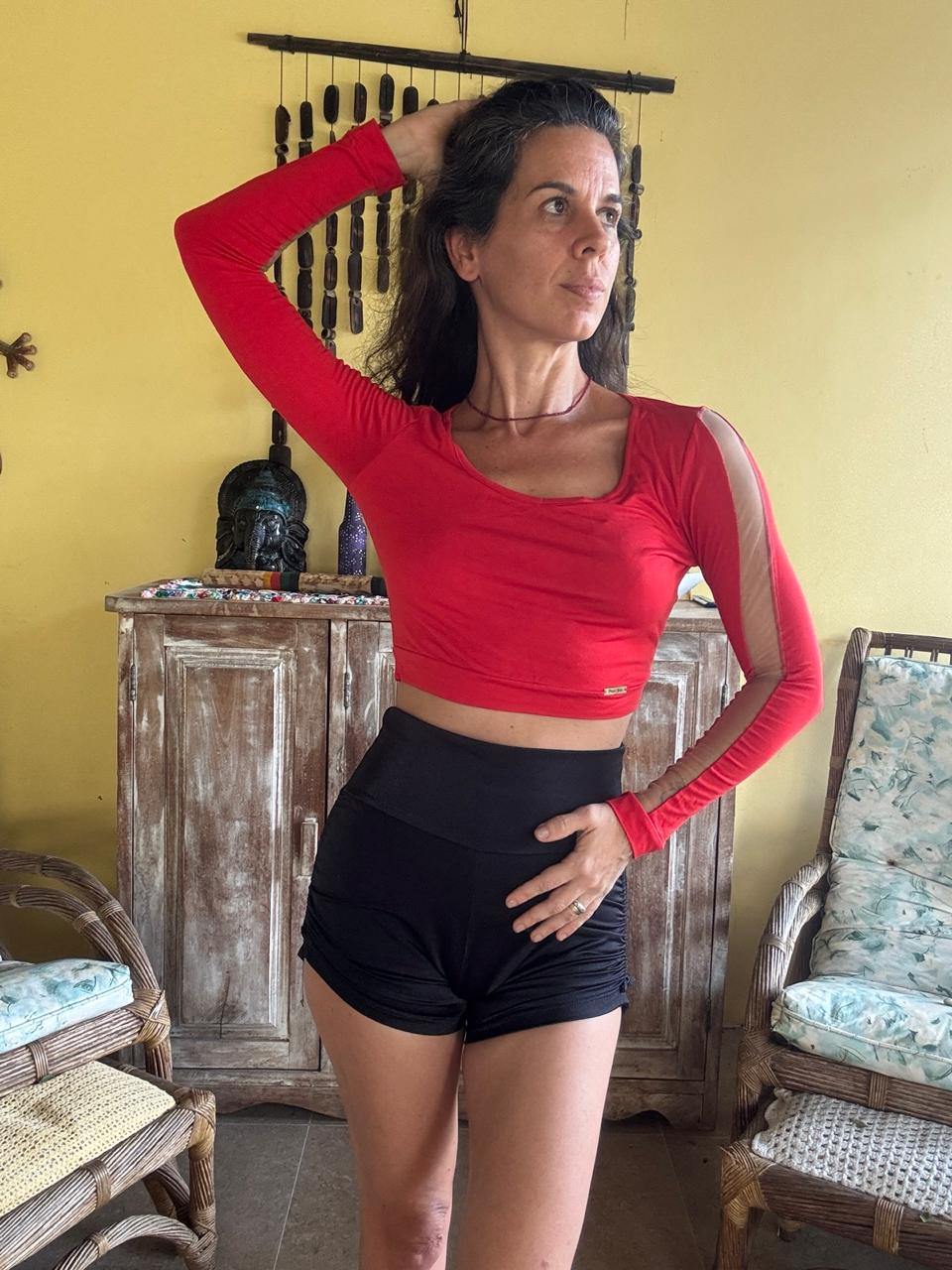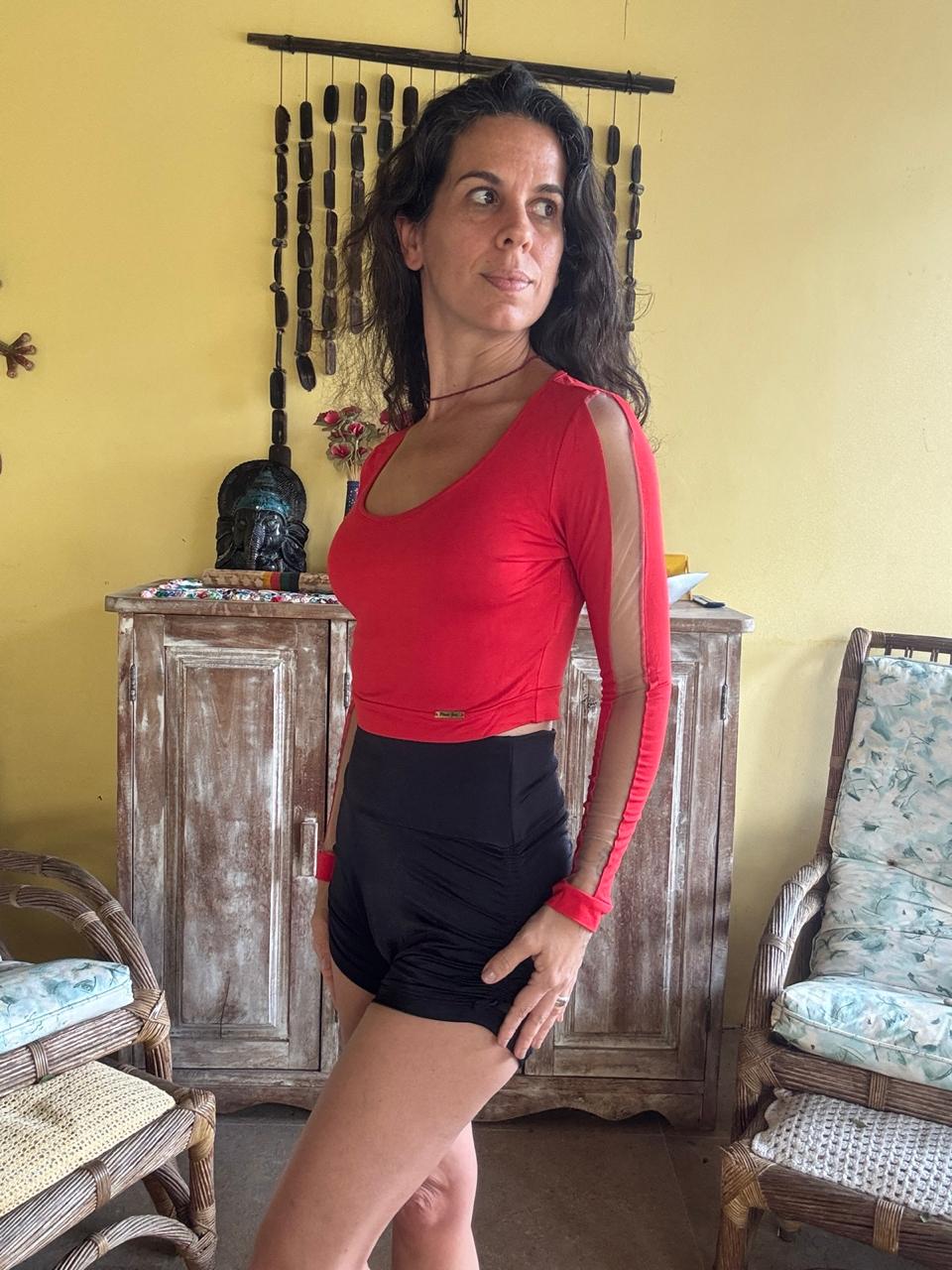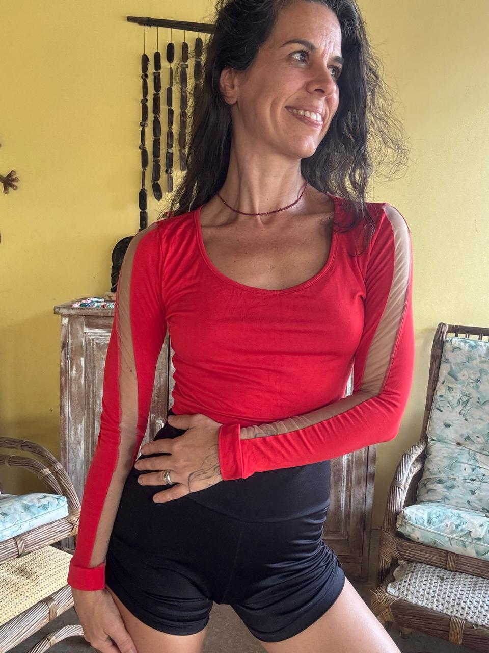 Cropped fitness vermelho vibrante de manga longa, com recortes em tela transparente ao longo dos braços e laterais. Ideal para atividades físicas, combinando estilo, conforto e ventilação.