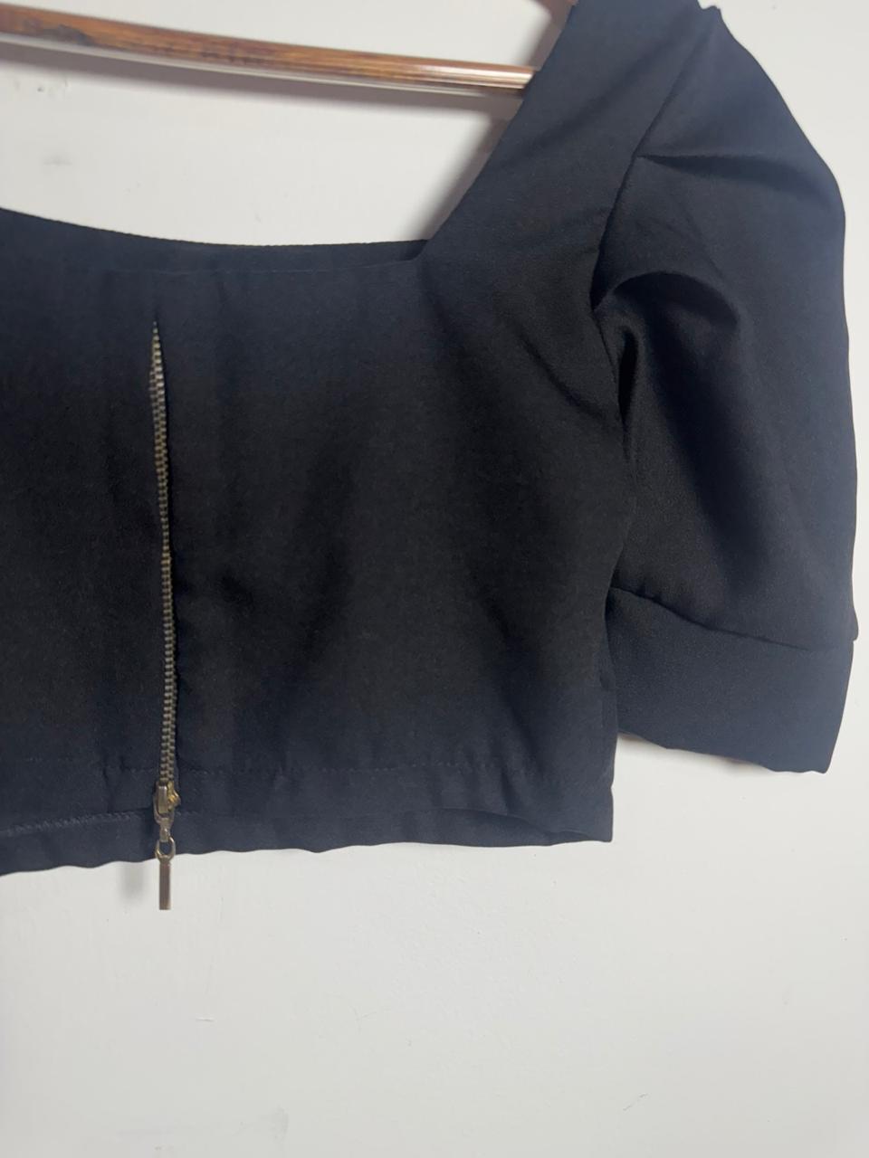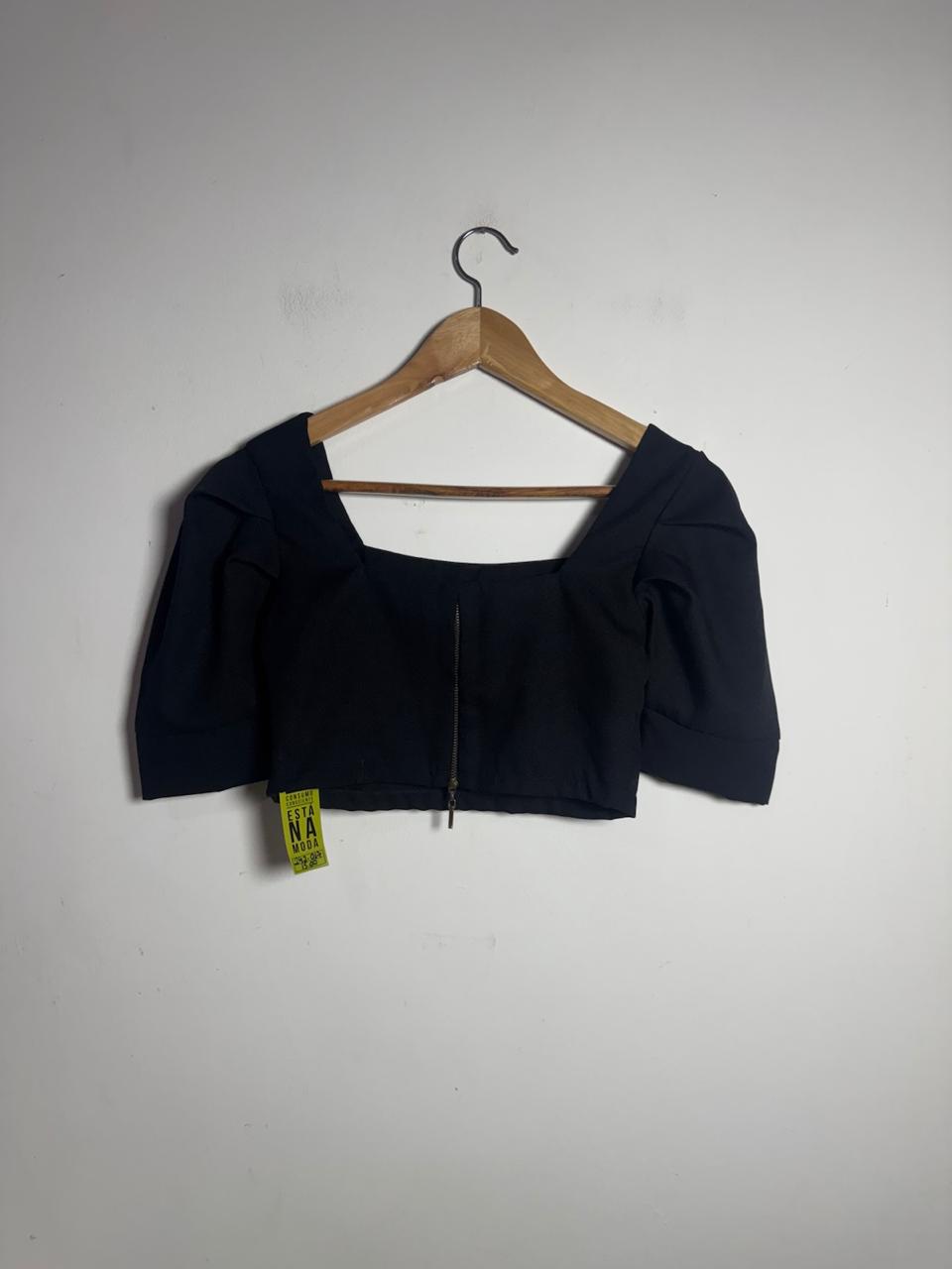 Cropped preto com decote quadrado, fechamento em zíper frontal e mangas curtas volumosas. Peça moderna para criar looks sofisticados em eventos noturnos.