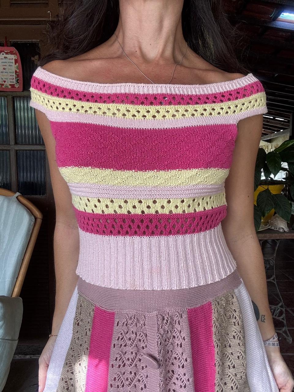 Cropped de tricô listrado em tons vibrantes de pink, rosa claro e amarelo, com detalhes vazados e decote ombro a ombro. A peça possui modelagem ajustada e barra canelada, perfeita para um look moderno e descontraído.