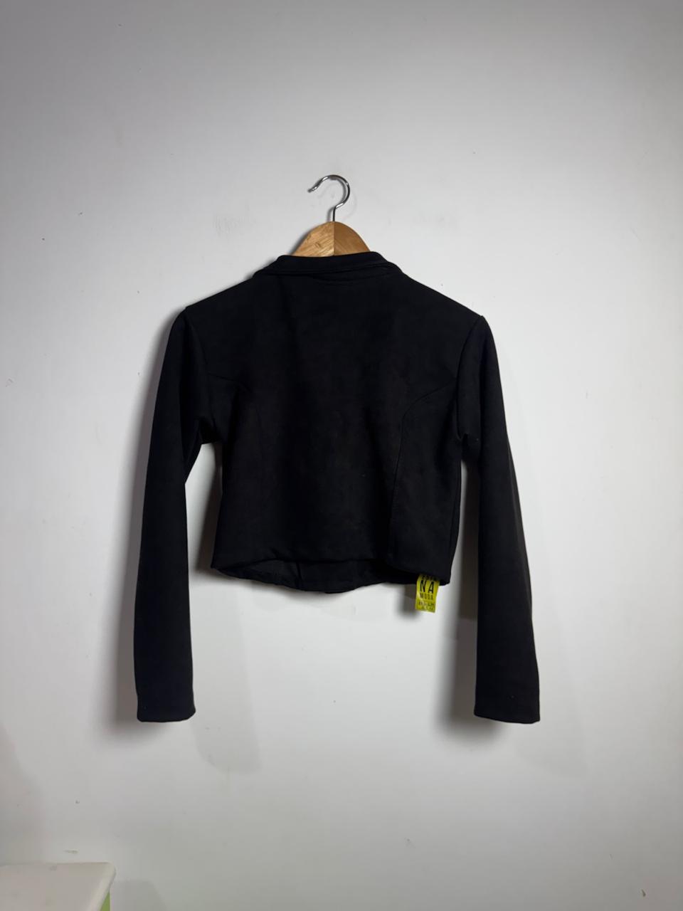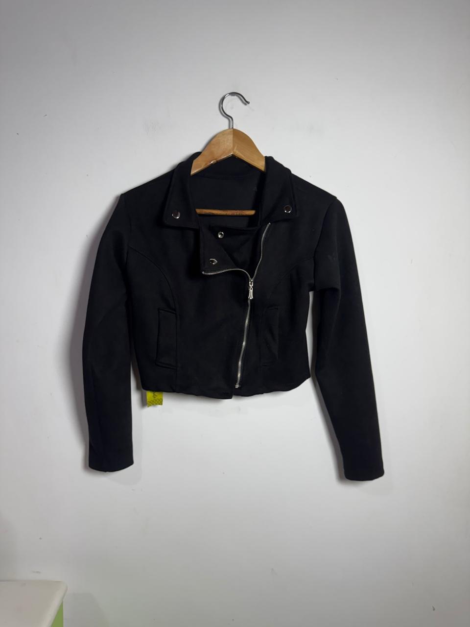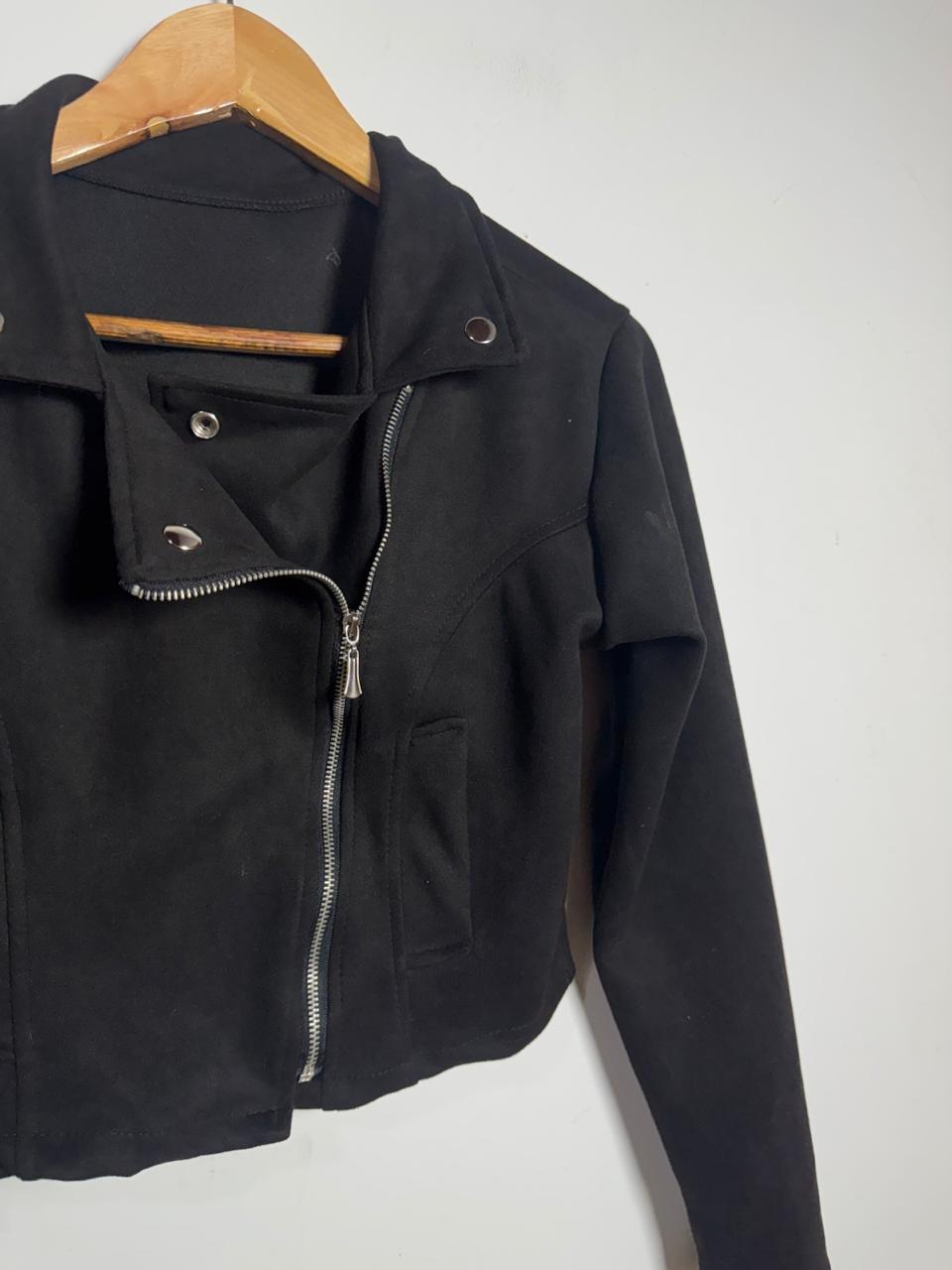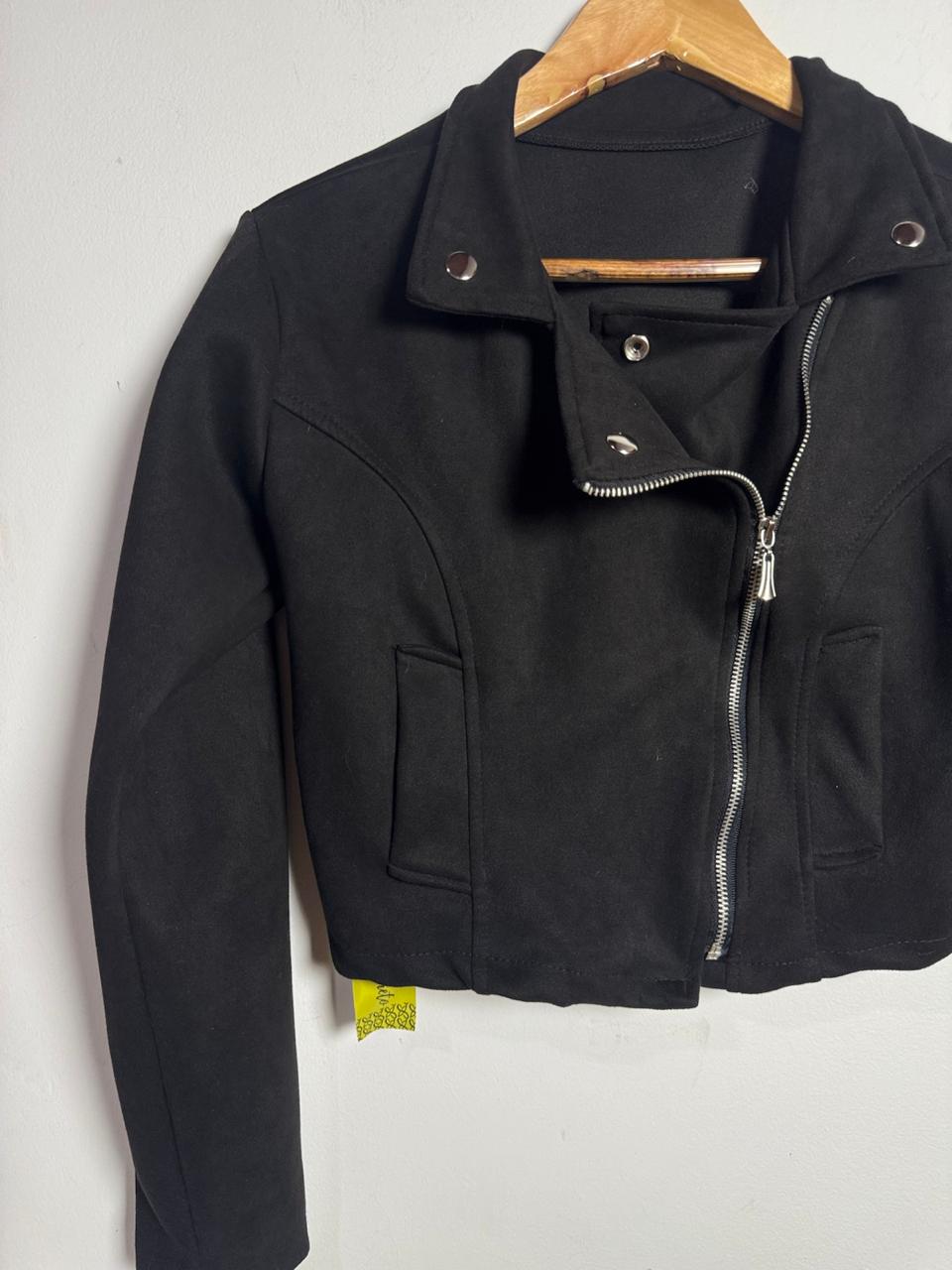 Jaqueta curta preta de mangas longas com fechamento por zíper prateado e gola de lapela com botões de pressão decorativos. Esta peça de visual moderno é uma terceira peça perfeita para elevar looks casuais ou noturnos.