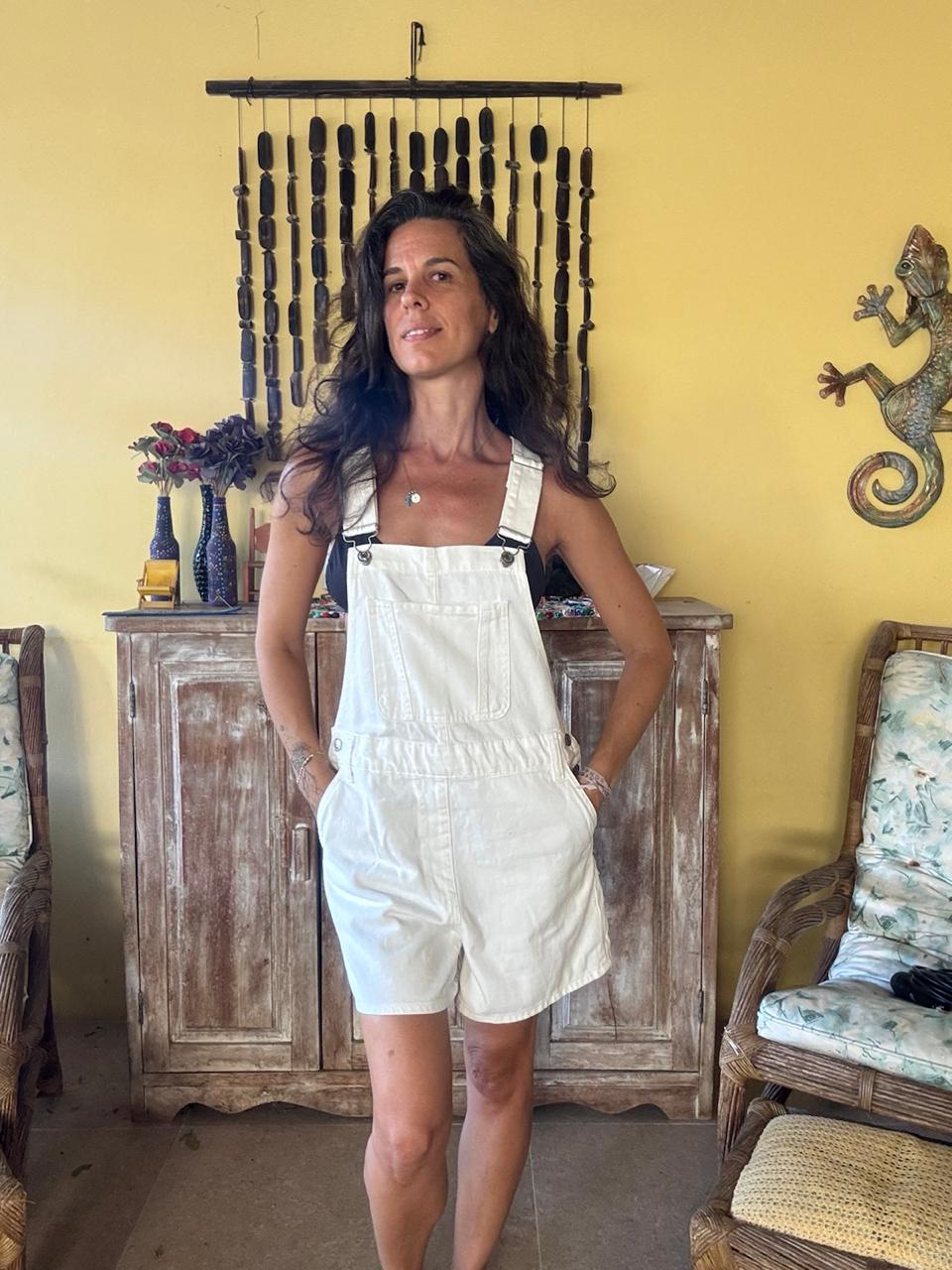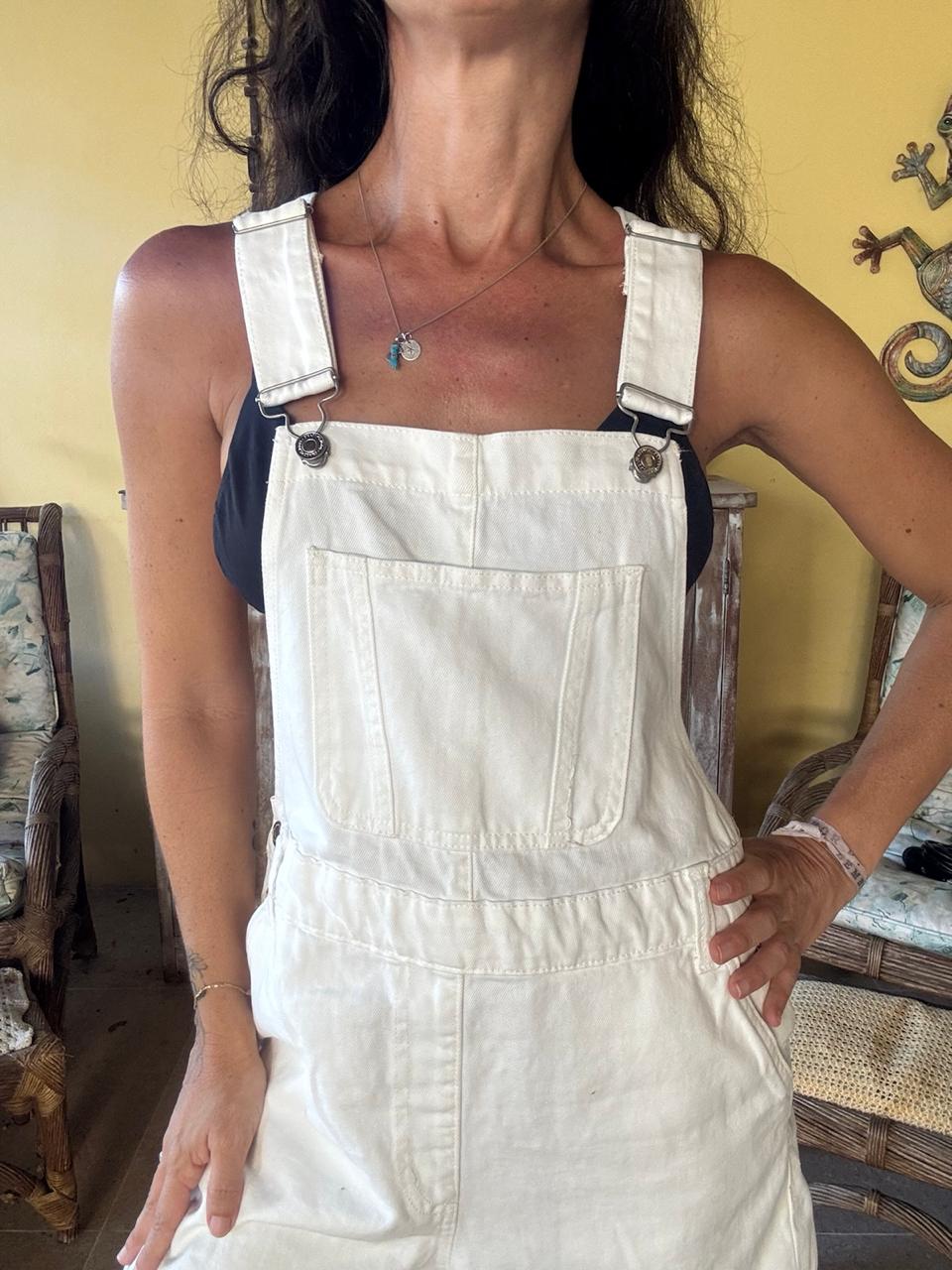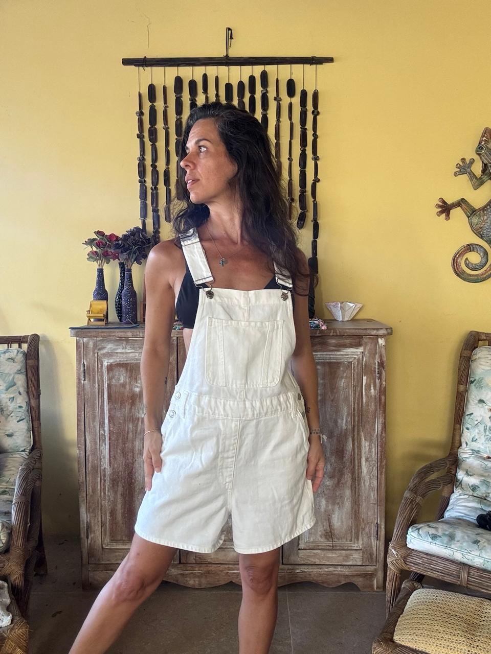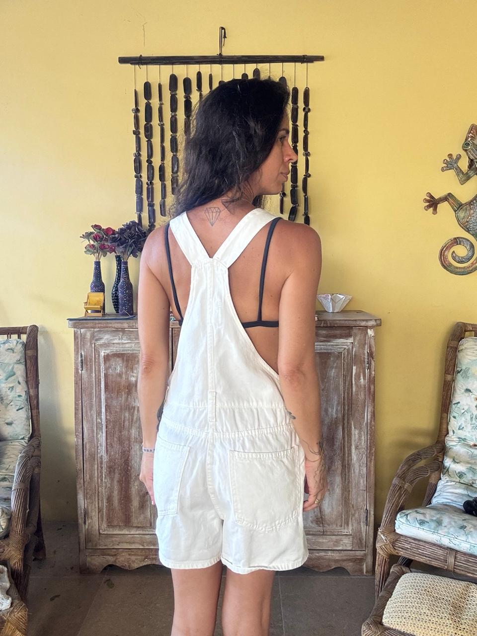 Jardineira curta em sarja off-white com bolsos – Pool – tam P