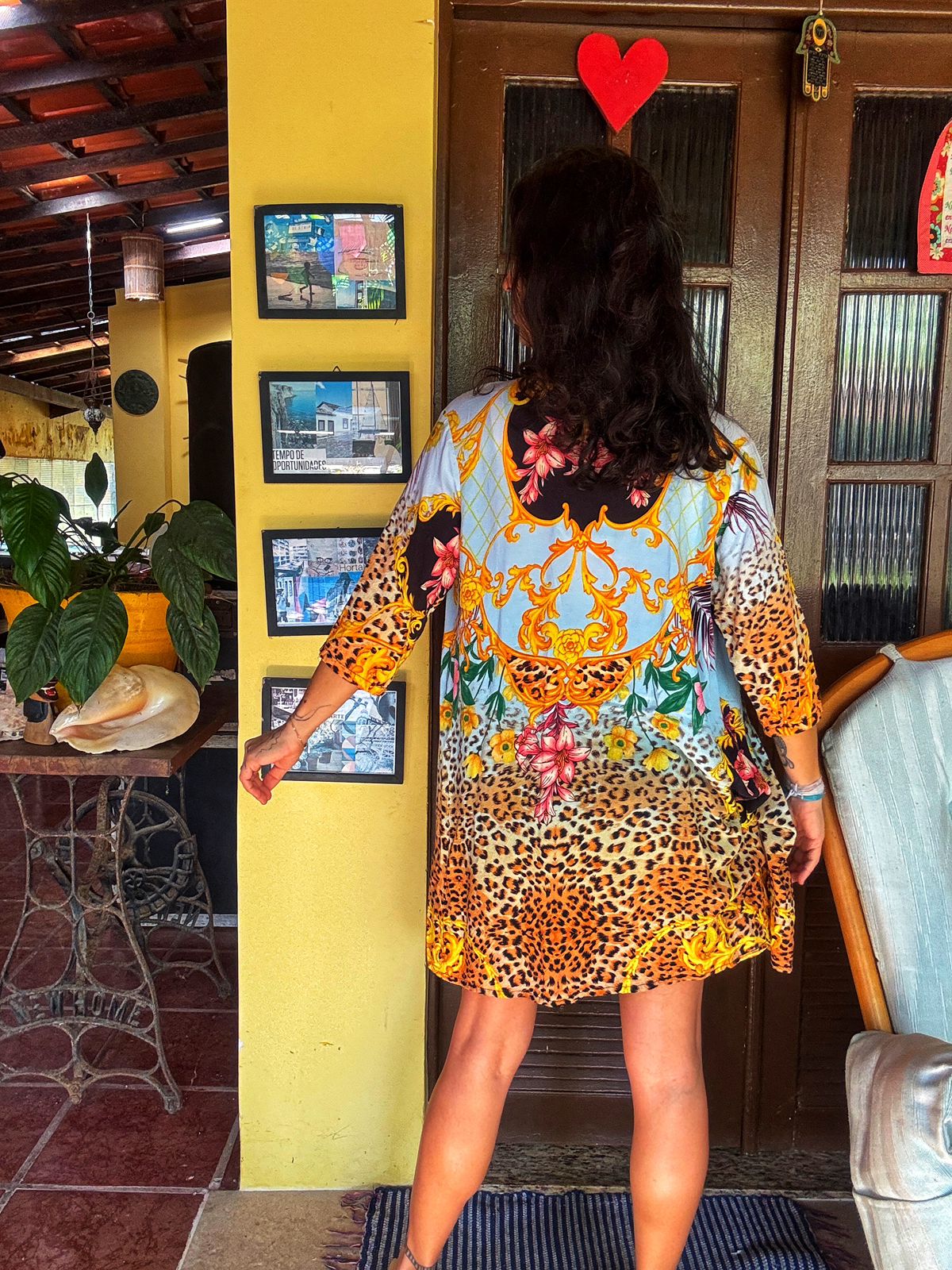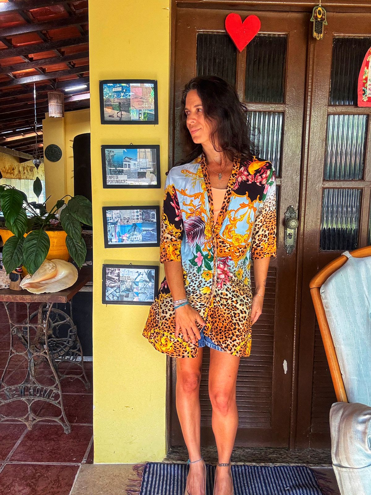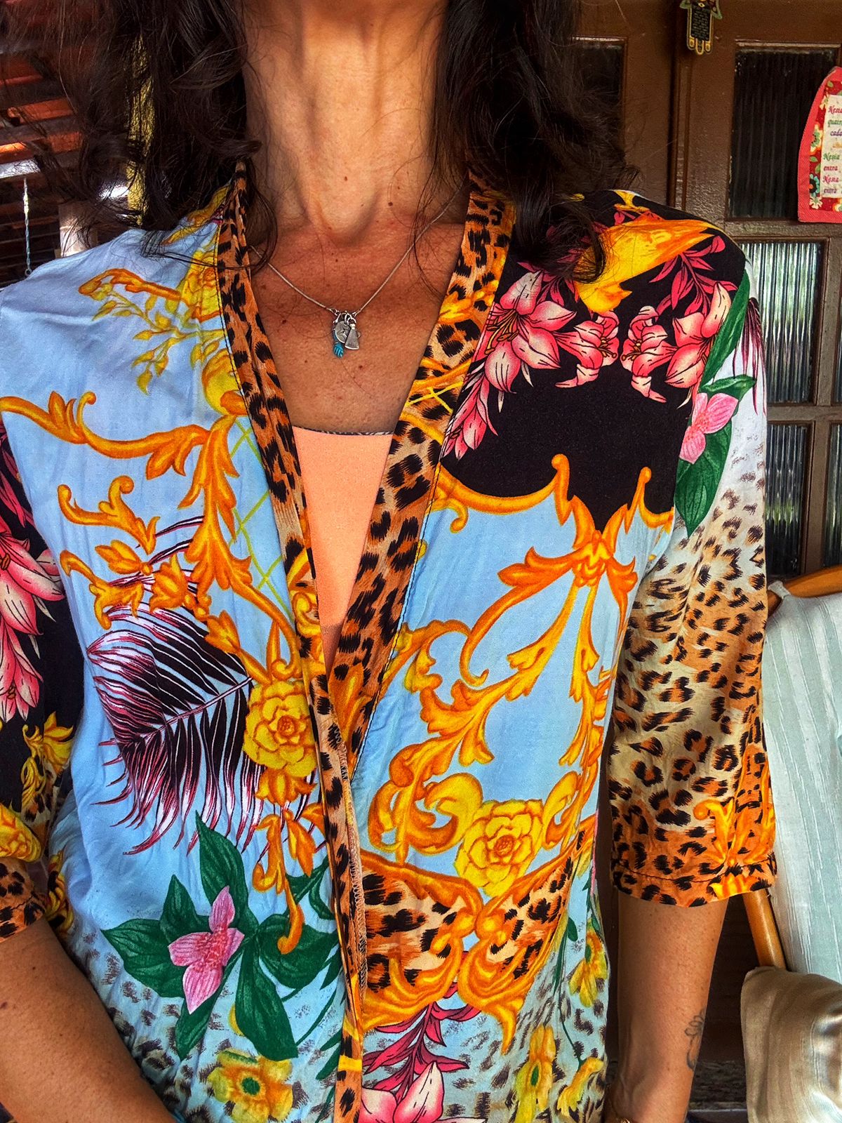Este kimono deslumbrante combina a ousadia do animal print com a delicadeza de estampas florais e ornamentos barrocos em tons de azul, dourado e rosa. Uma peça única e cheia de personalidade, perfeita para elevar qualquer look. Use-o sobre um top e shorts jeans para um visual casual chic, ou como saída de praia elegante. Sua versatilidade permite diversas combinações, adicionando um toque de sofisticação e estilo a qualquer ocasião.