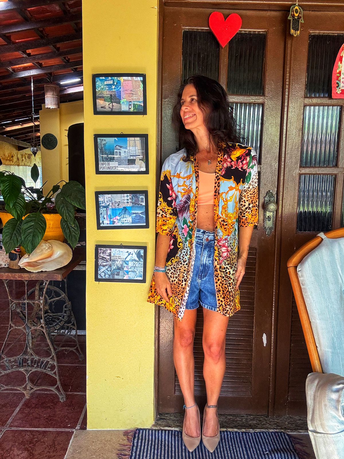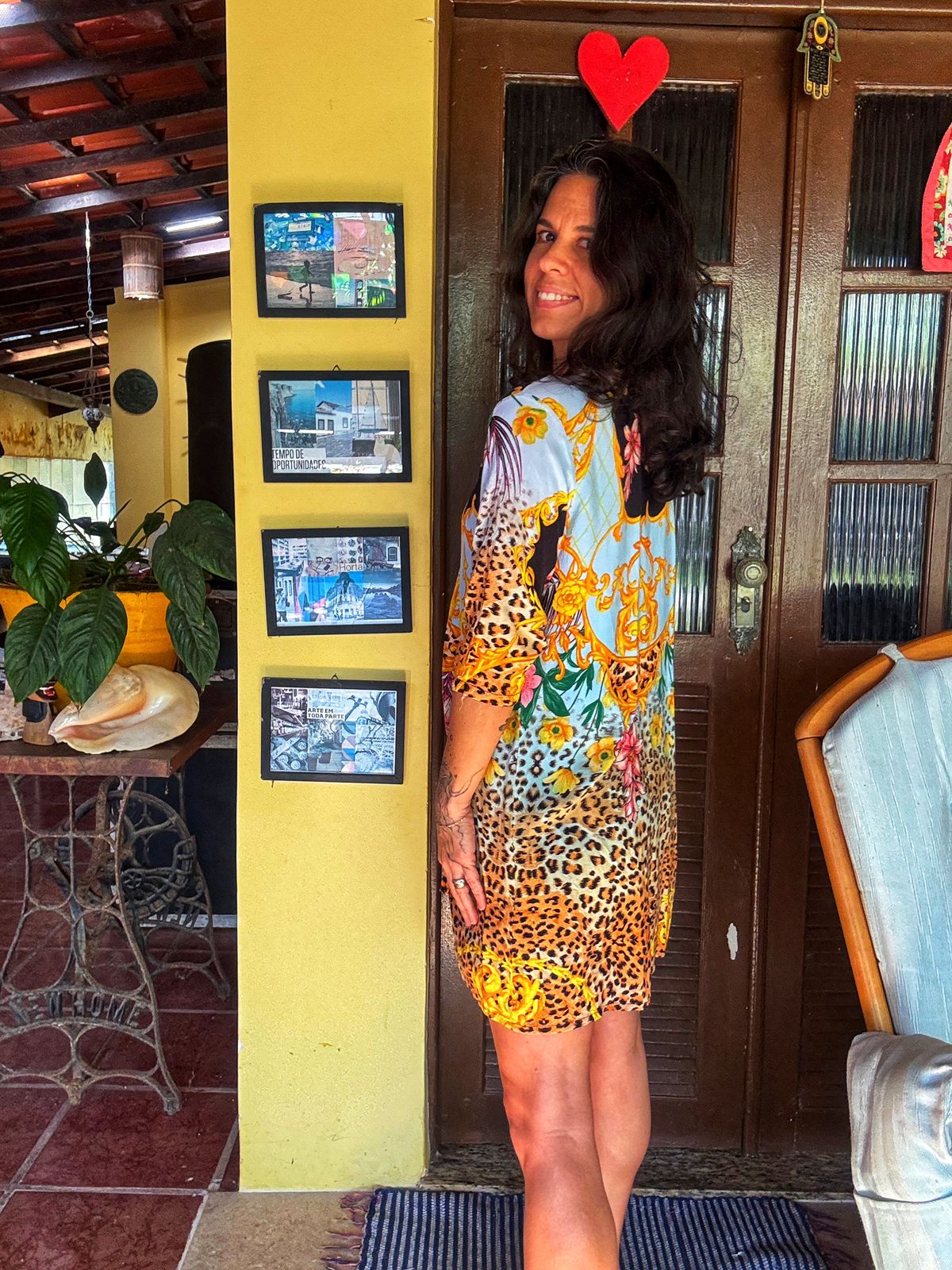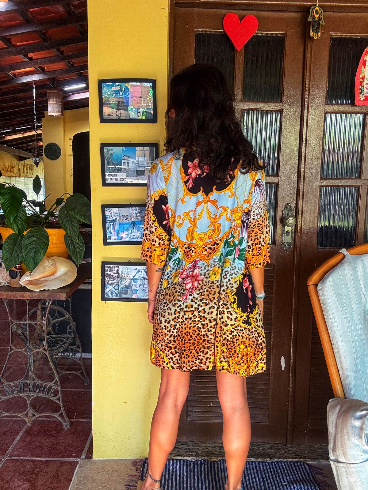 Este kimono deslumbrante combina a ousadia do animal print com a delicadeza de estampas florais e ornamentos barrocos em tons de azul, dourado e rosa. Uma peça única e cheia de personalidade, perfeita para elevar qualquer look. Use-o sobre um top e shorts jeans para um visual casual chic, ou como saída de praia elegante. Sua versatilidade permite diversas combinações, adicionando um toque de sofisticação e estilo a qualquer ocasião.