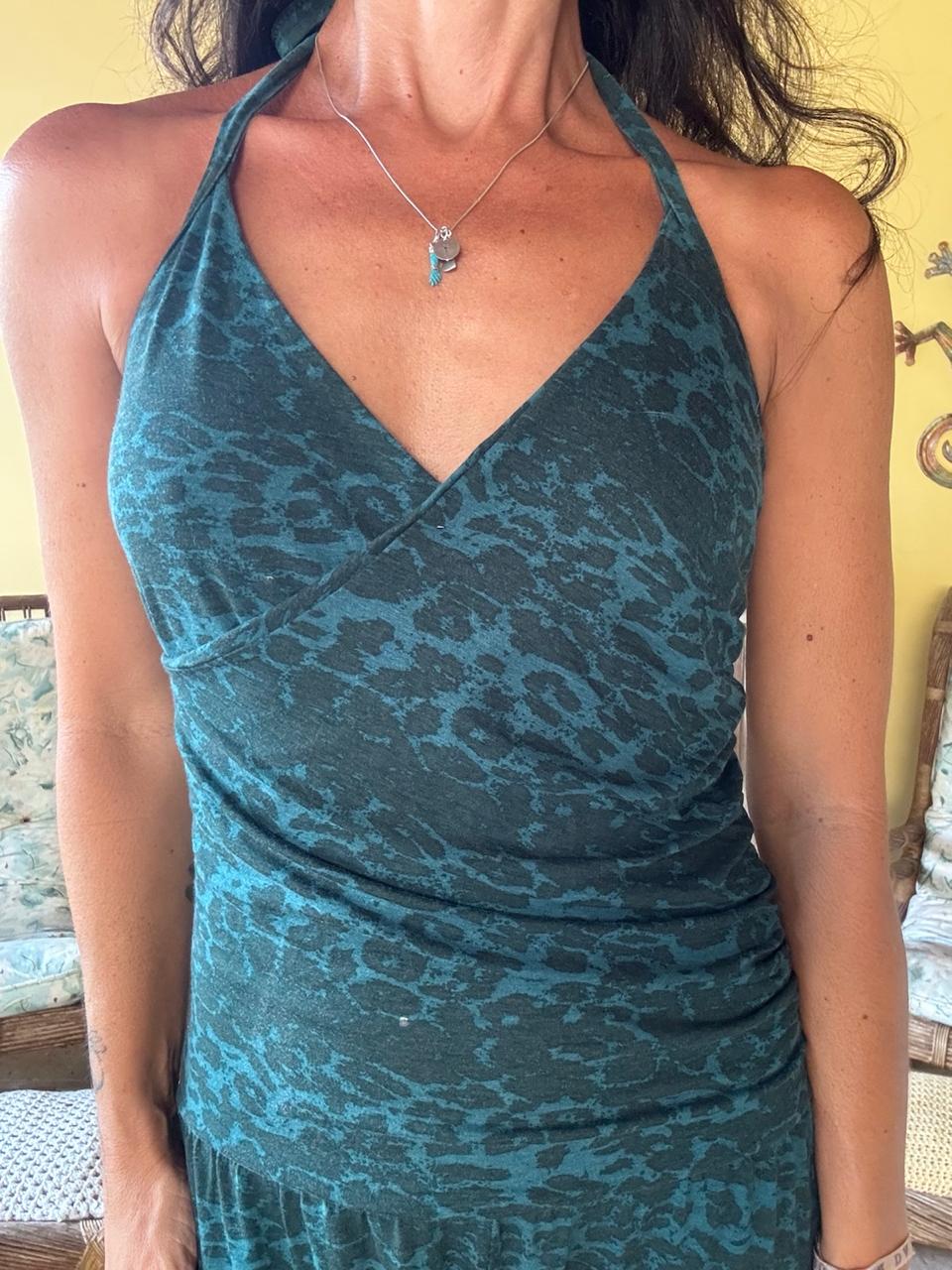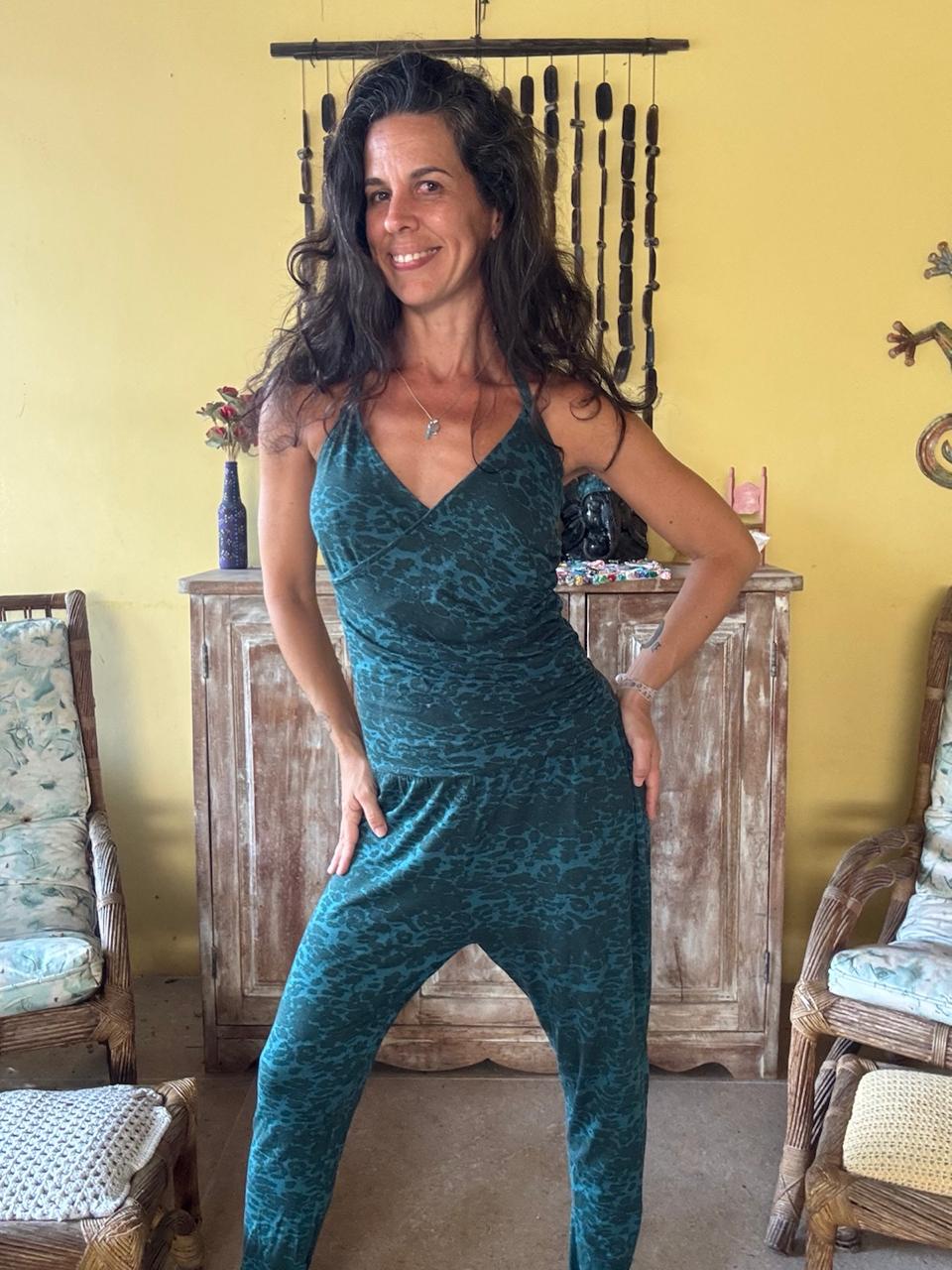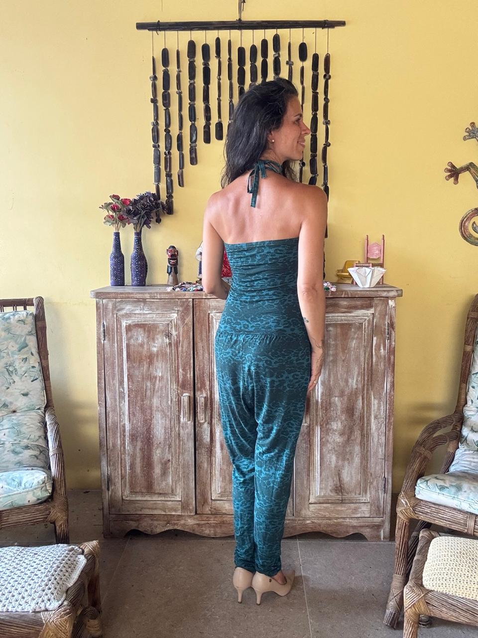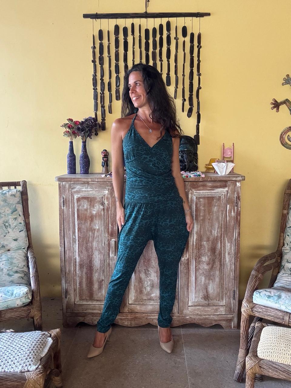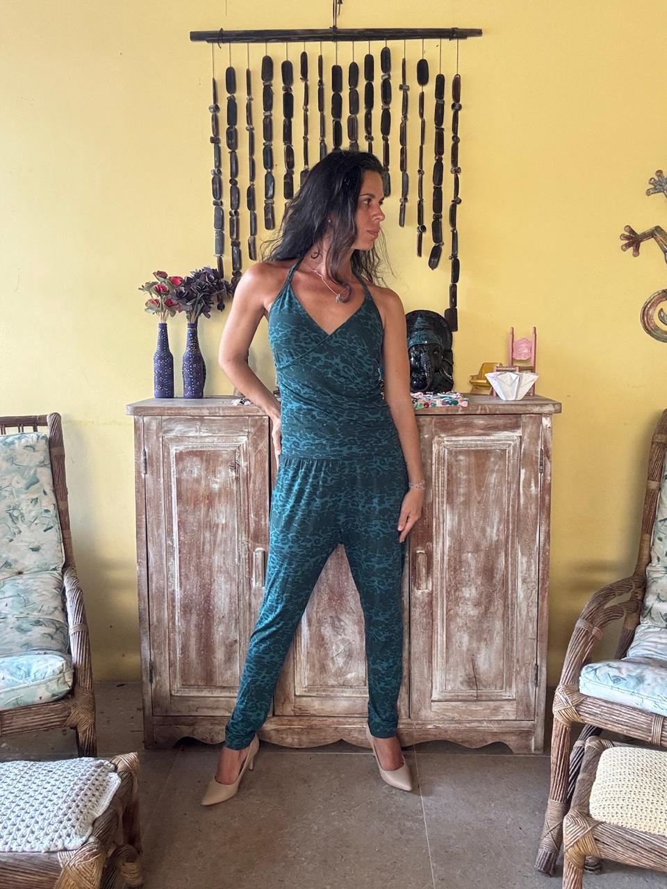 Macacão de modelagem ajustada ao corpo com decote transpassado em V e estampa de oncinha em tons de verde escuro. A peça possui fechamento por amarração no pescoço e pernas afuniladas, ideal para um visual prático e moderno.