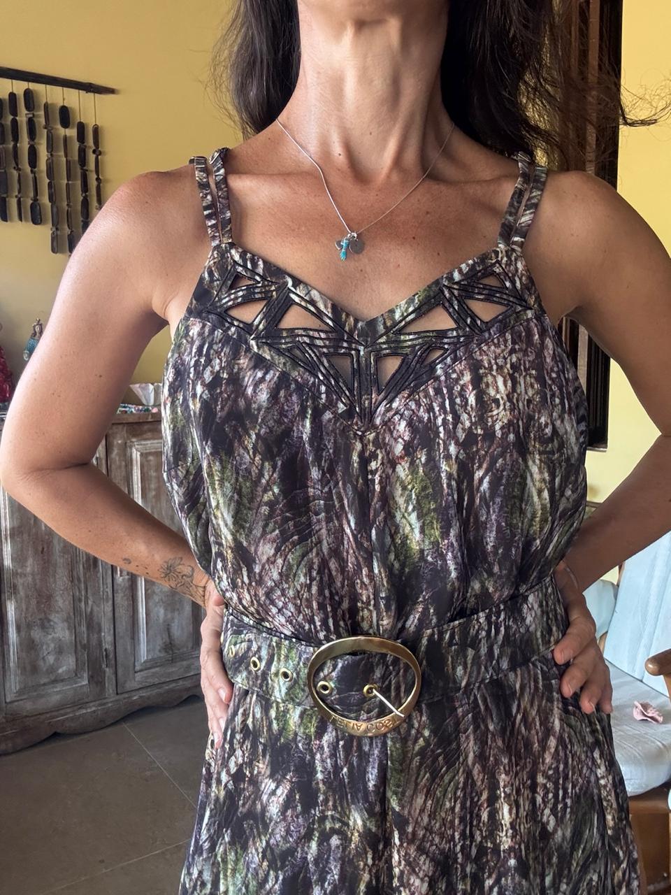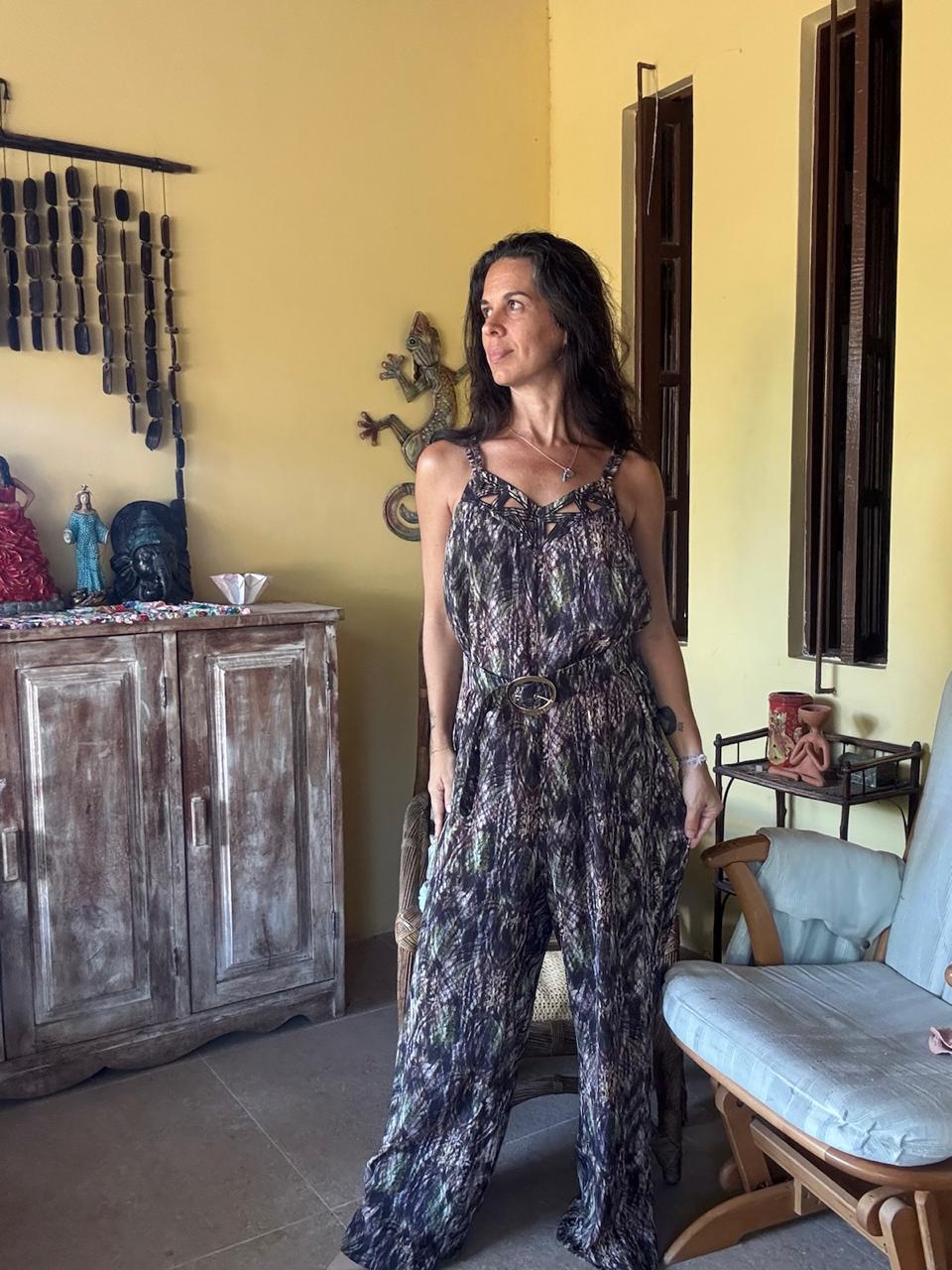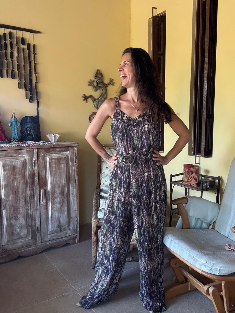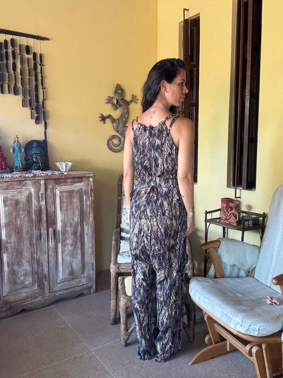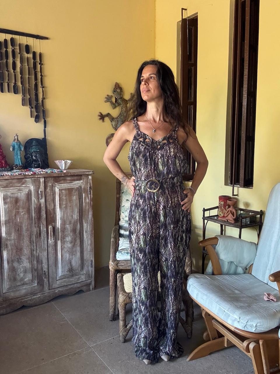 Macacão longo estampado com decote trabalhado e cinto – Leila Costa – tam G