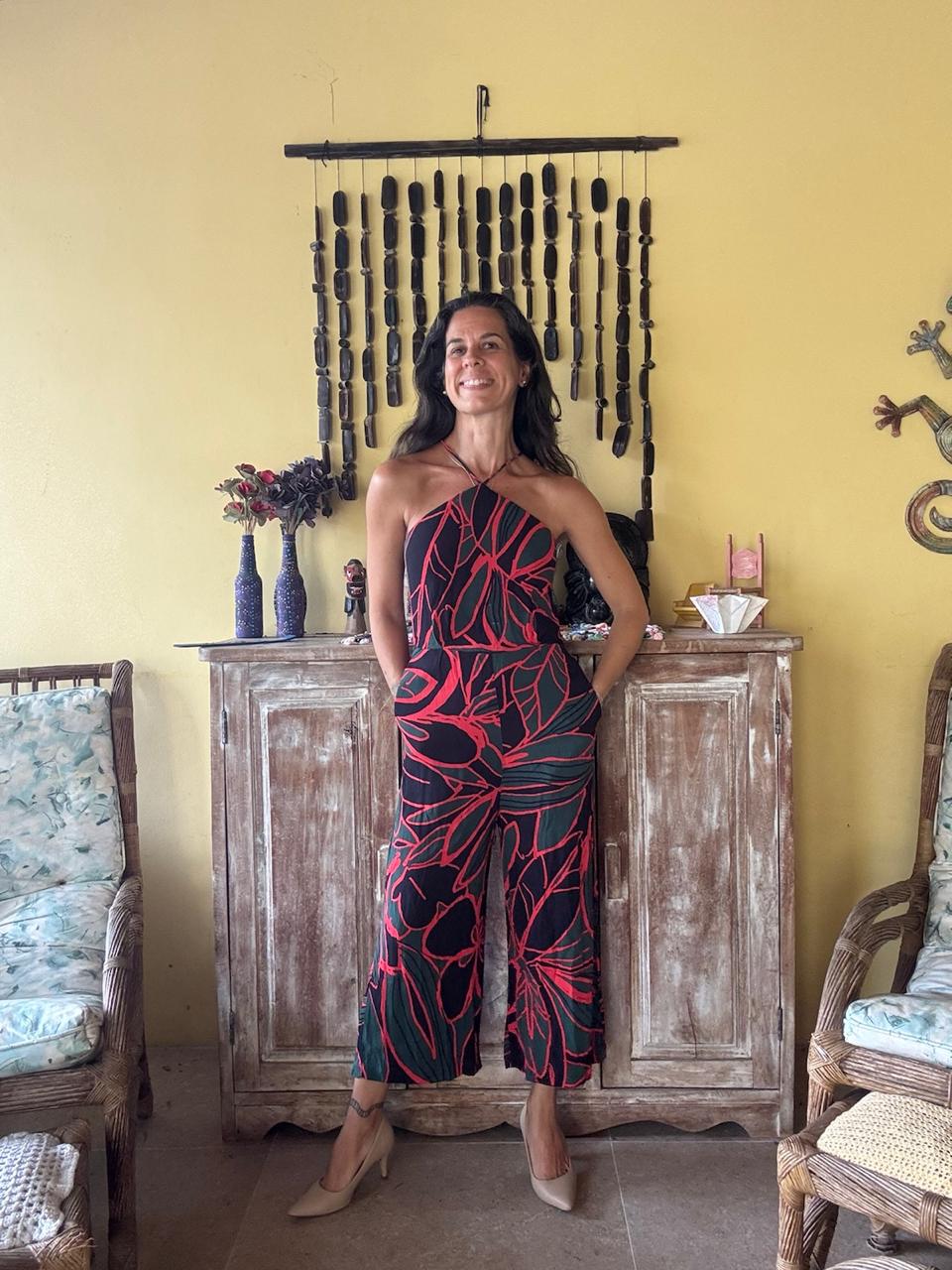 Macacão com decote frente única, pernas largas e bolsos laterais funcionais. Uma escolha vibrante e fluida para eventos diurnos ou passeios ao ar livre.