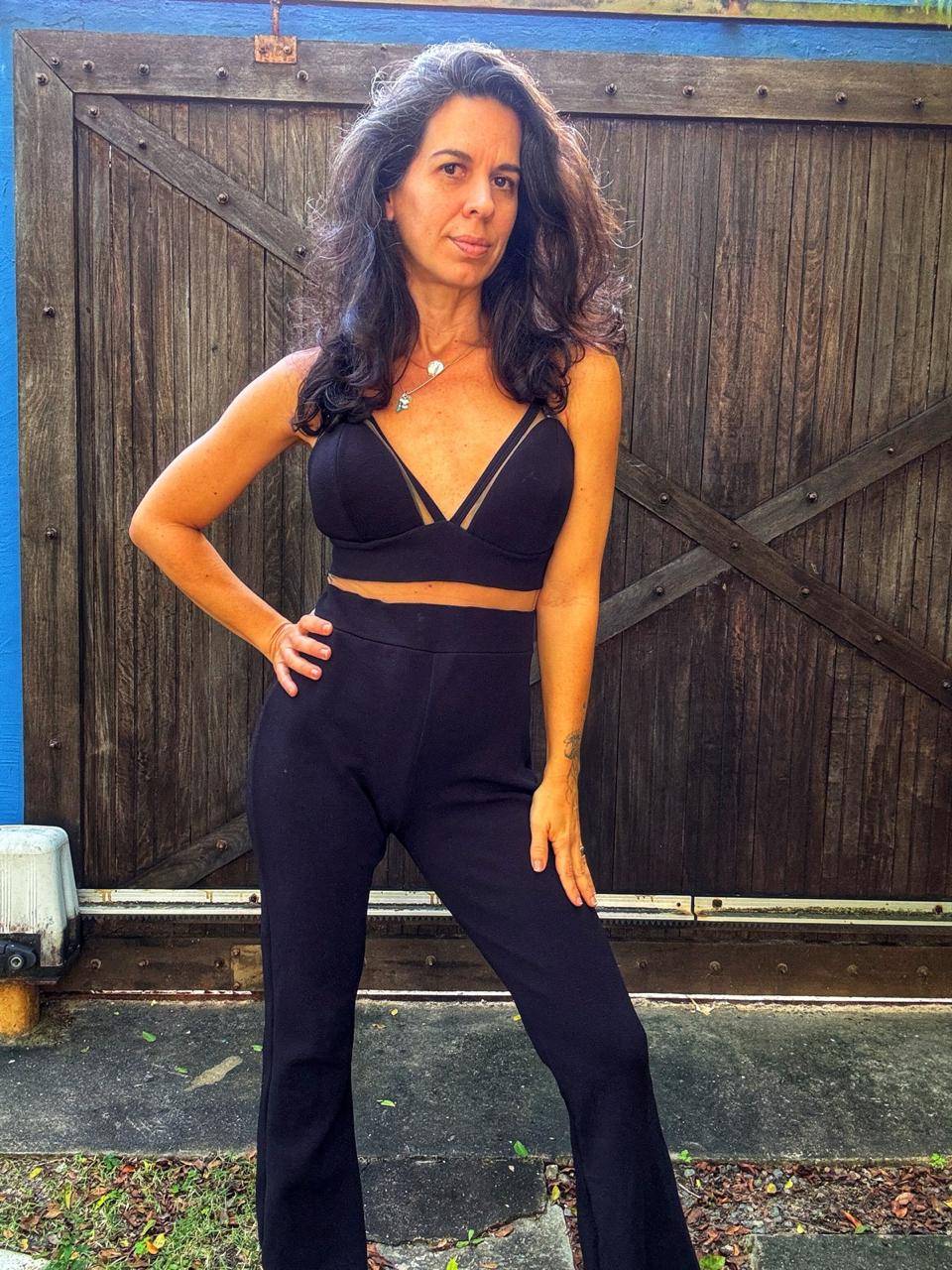 Elegância no preto clássico com textura sutil, este macacão flare possui um top cut-out com transparência na frente e alças cruzadas nas costas. A peça multifuncional perfeita para um visual sofisticado e sustentável.