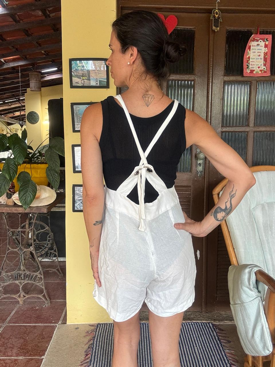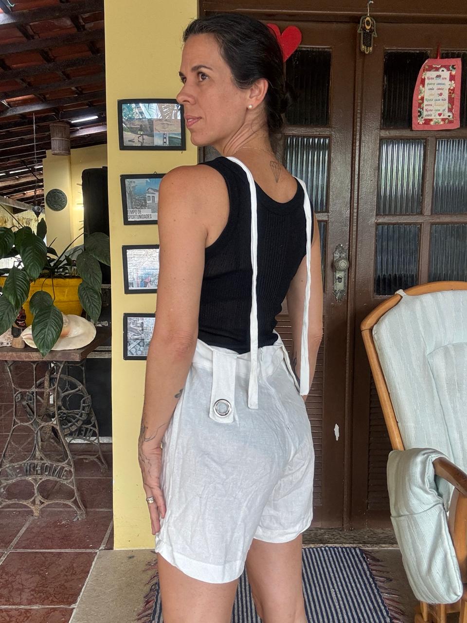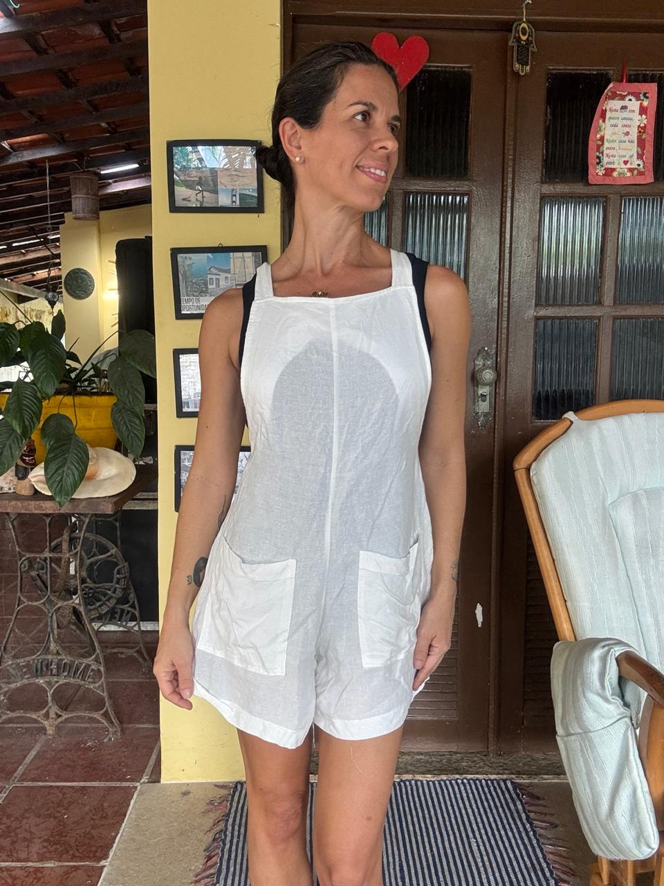 Frescor e versatilidade! Macaquinho/jardineira de shorts branca em tecido leve, com alças largas e bolsos utilitários. A peça essencial para looks casuais e de verão com estilo.