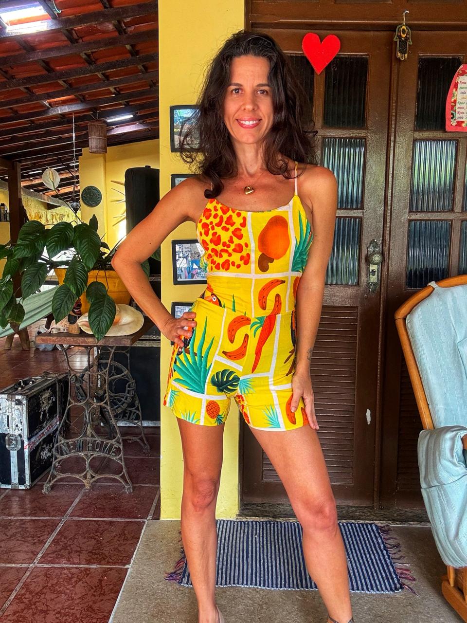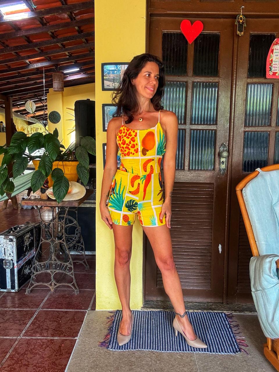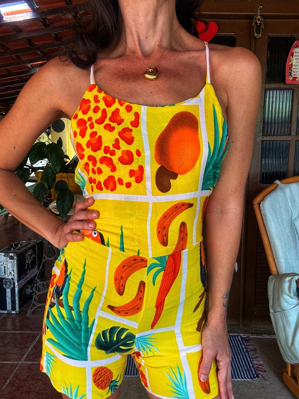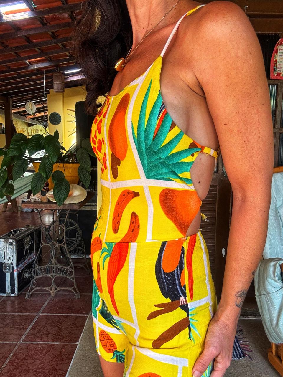 Macaquinho curto em tecido leve, com estampa vibrante de frutas e folhagens em quadrados, realçado por um alegre fundo amarelo. Possui alças finas, decote quadrado e recortes laterais com amarração nas costas, perfeito para o calor!