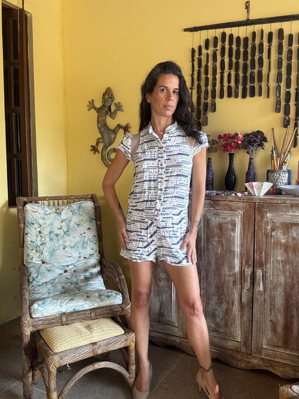 Macaquinho curto em tecido leve com estampa geométrica abstrata em tons de azul, cinza e branco. Possui gola alta com botões frontais, cintura marcada por elástico e mangas curtas em tela transparente, adicionando um toque moderno e descontraído.