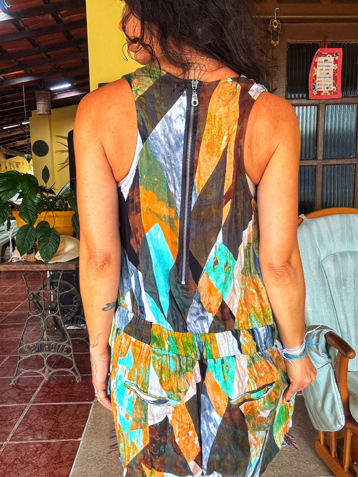 Macaquinho de alça com detalhes em babado e zíper aparente nas costas.