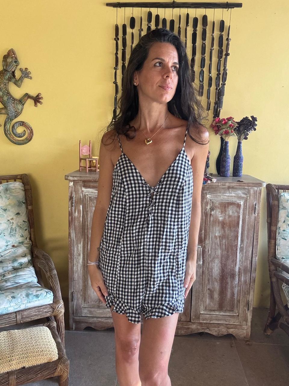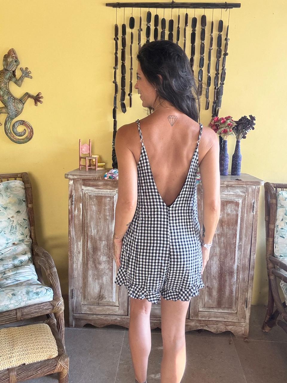 Macaquinho (ou jardineira) curto com estampa xadrez vichy preto e branco, alças finas, decote V frontal com amarração e super decote nas costas. Peça leve e atual para um visual divertido de verão.