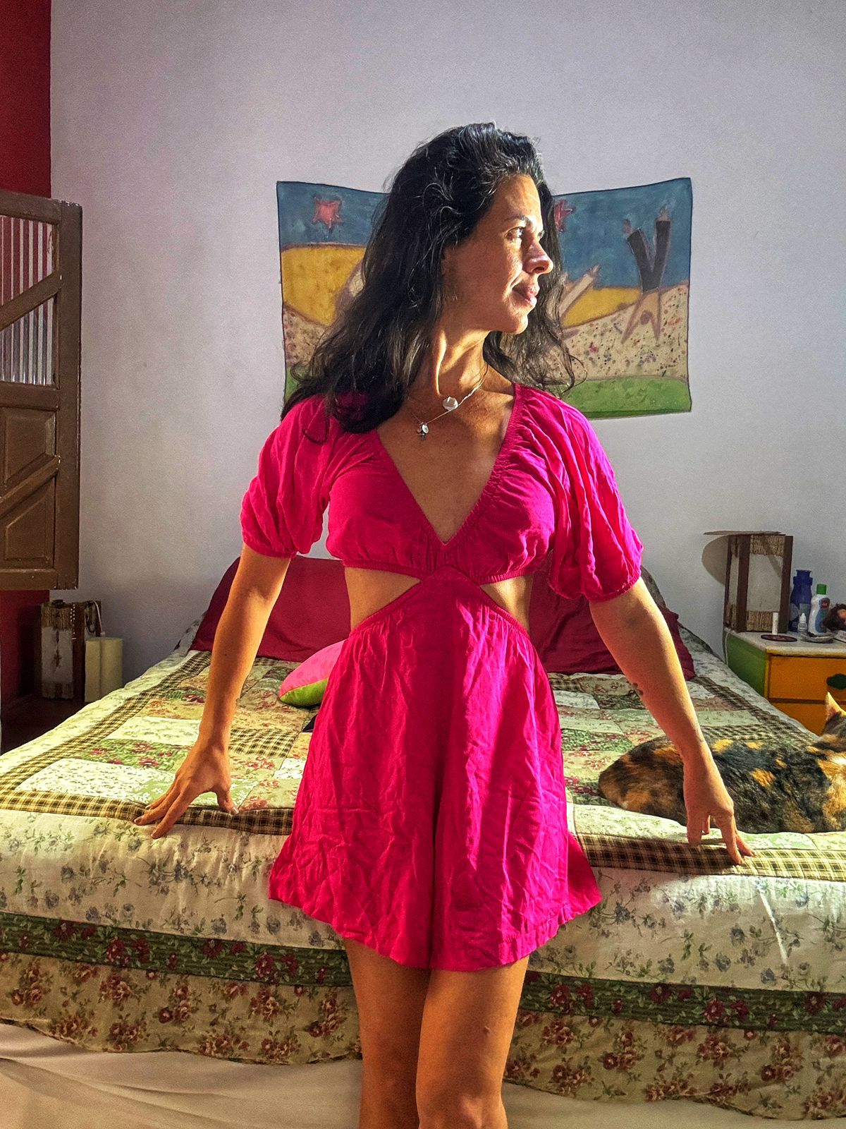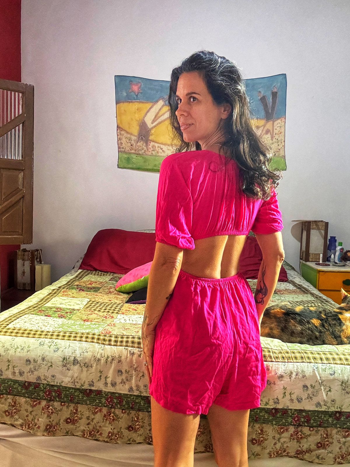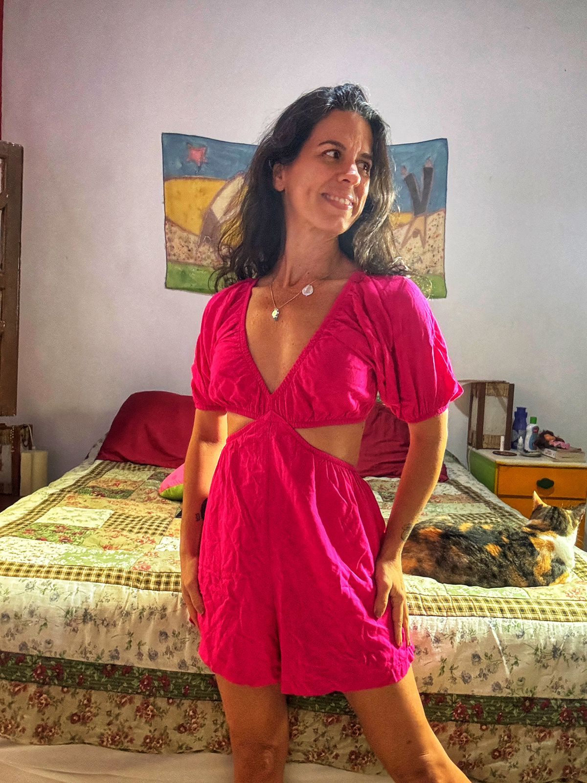 Macaquinho no tom vibrante de pink, com decote V profundo, mangas bufantes curtas e cintura marcada.