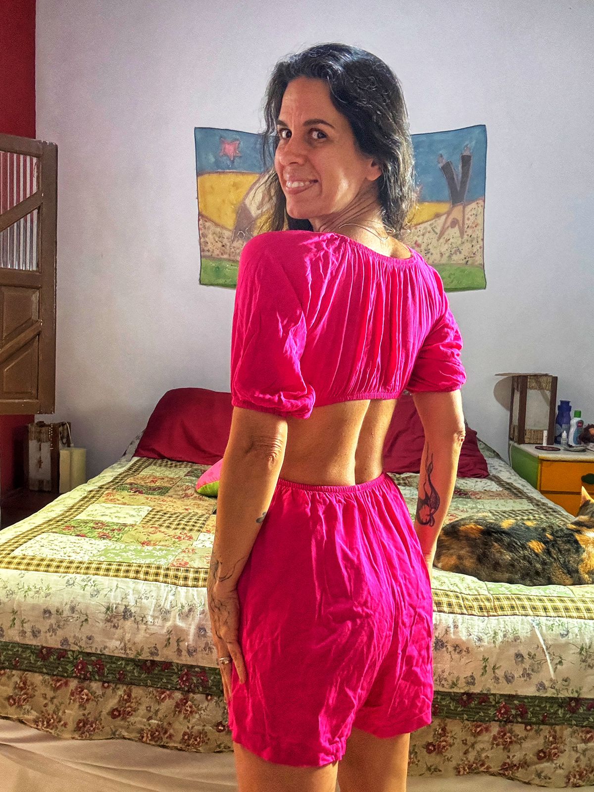 O destaque são os recortes laterais e traseiros na cintura, que oferecem um visual aberto e fresco, ideal para dias quentes.