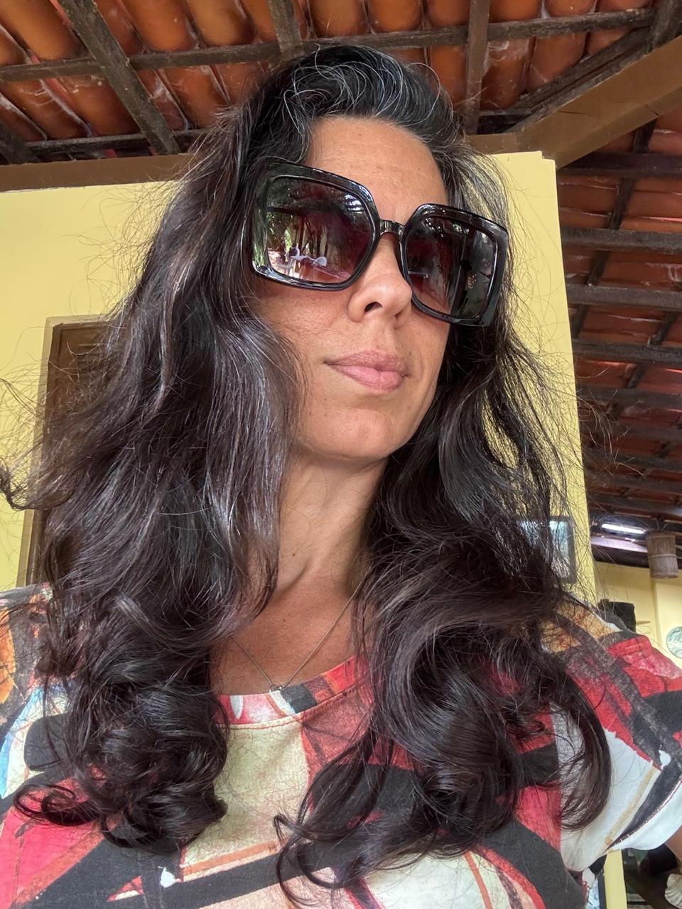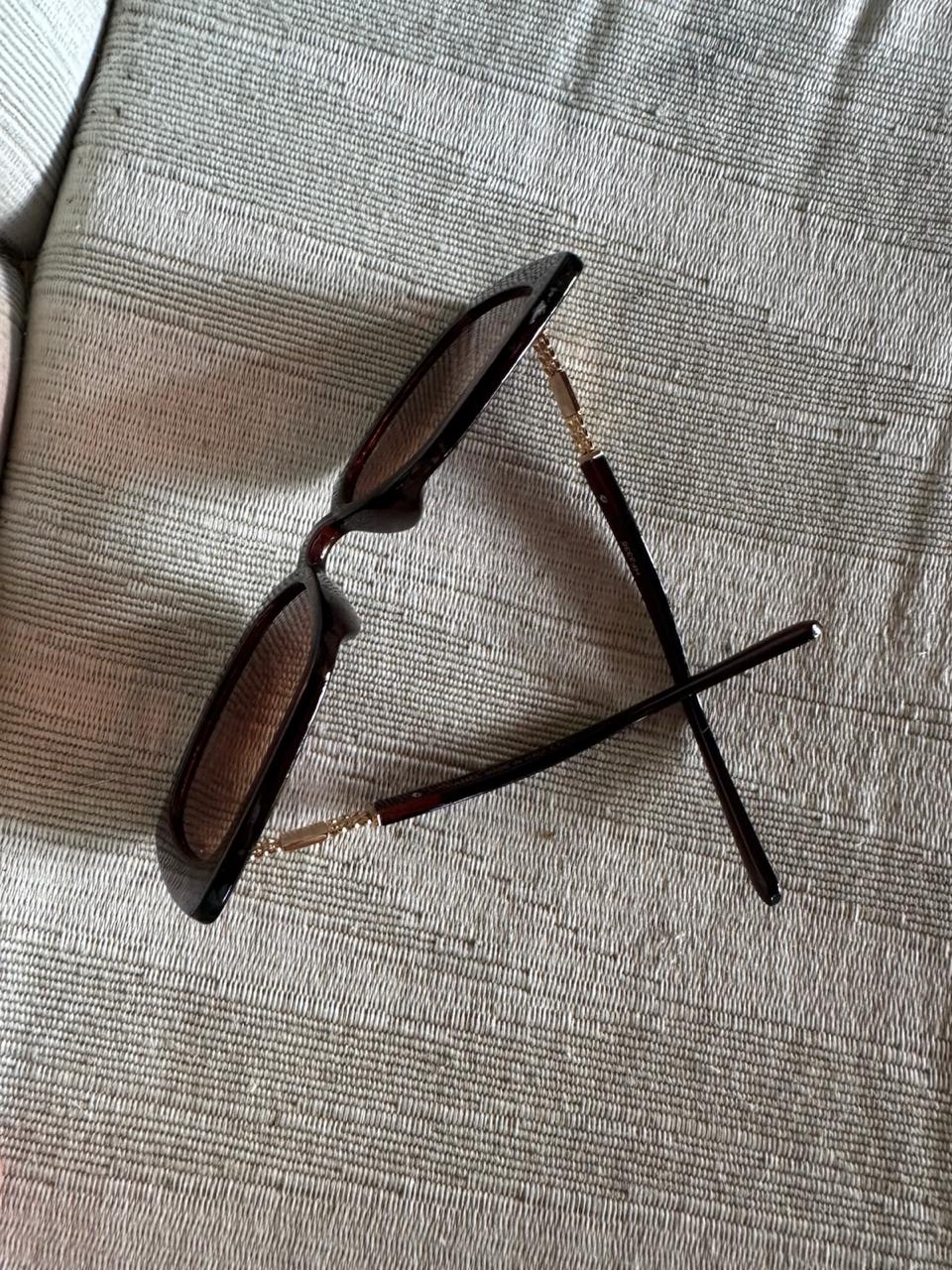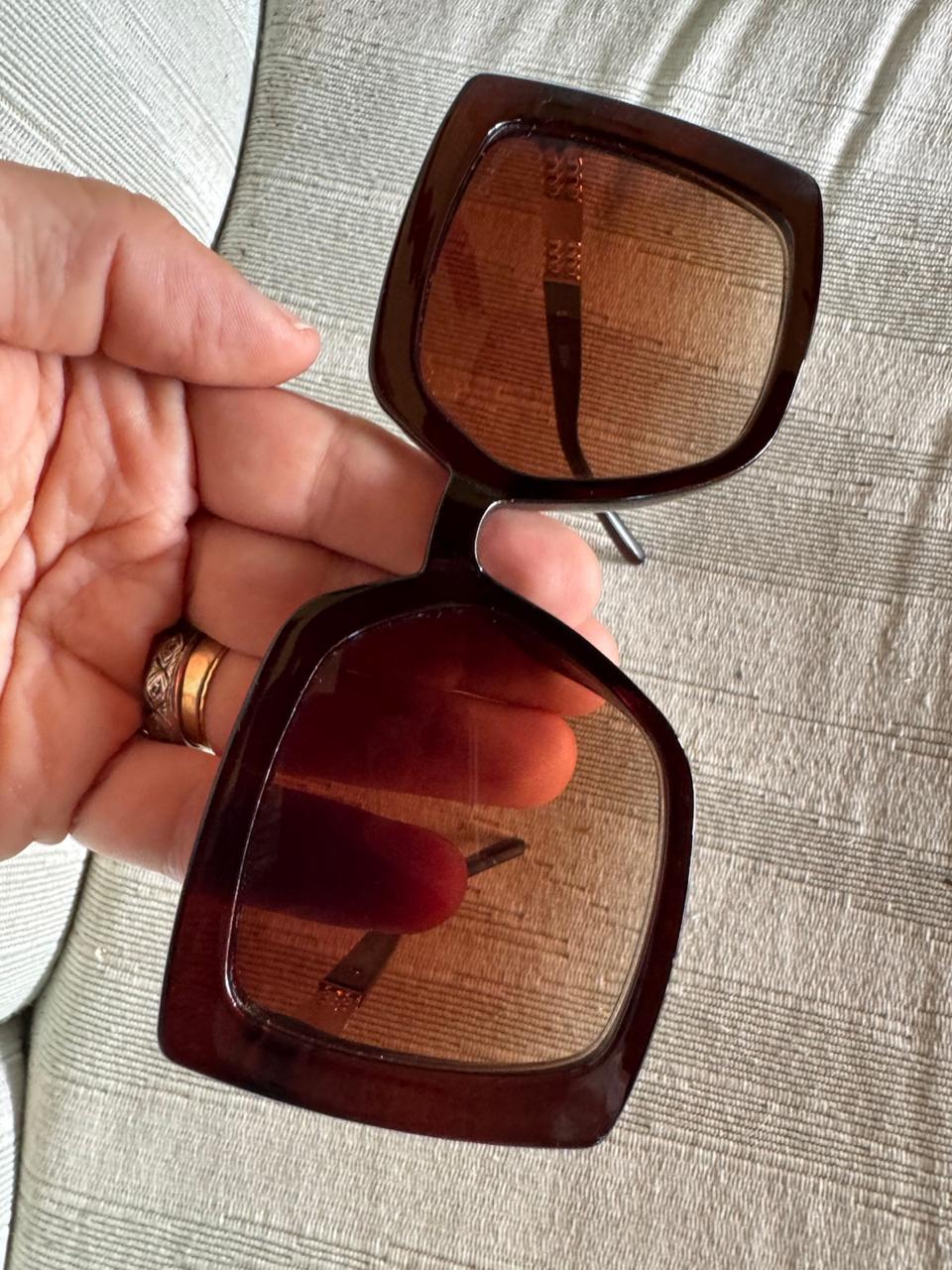 Óculos de Sol com armação robusta marrom escura e lentes degradê em tom marrom. As hastes laterais trazem detalhe de corrente dourada com o logotipo CC em preto, ideais para um visual sofisticado e marcante.