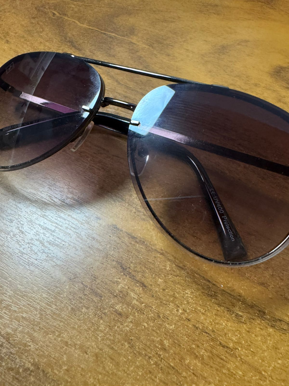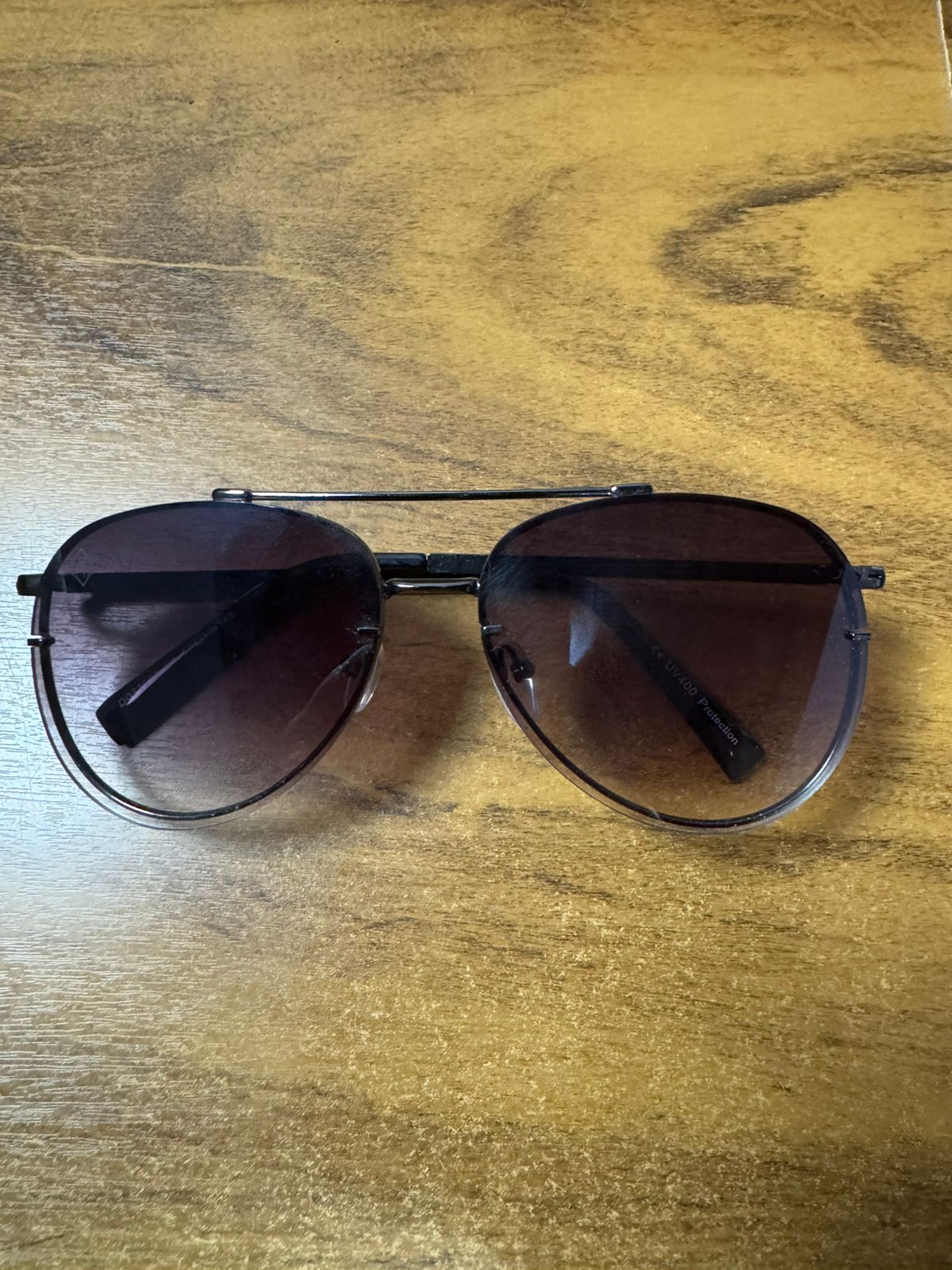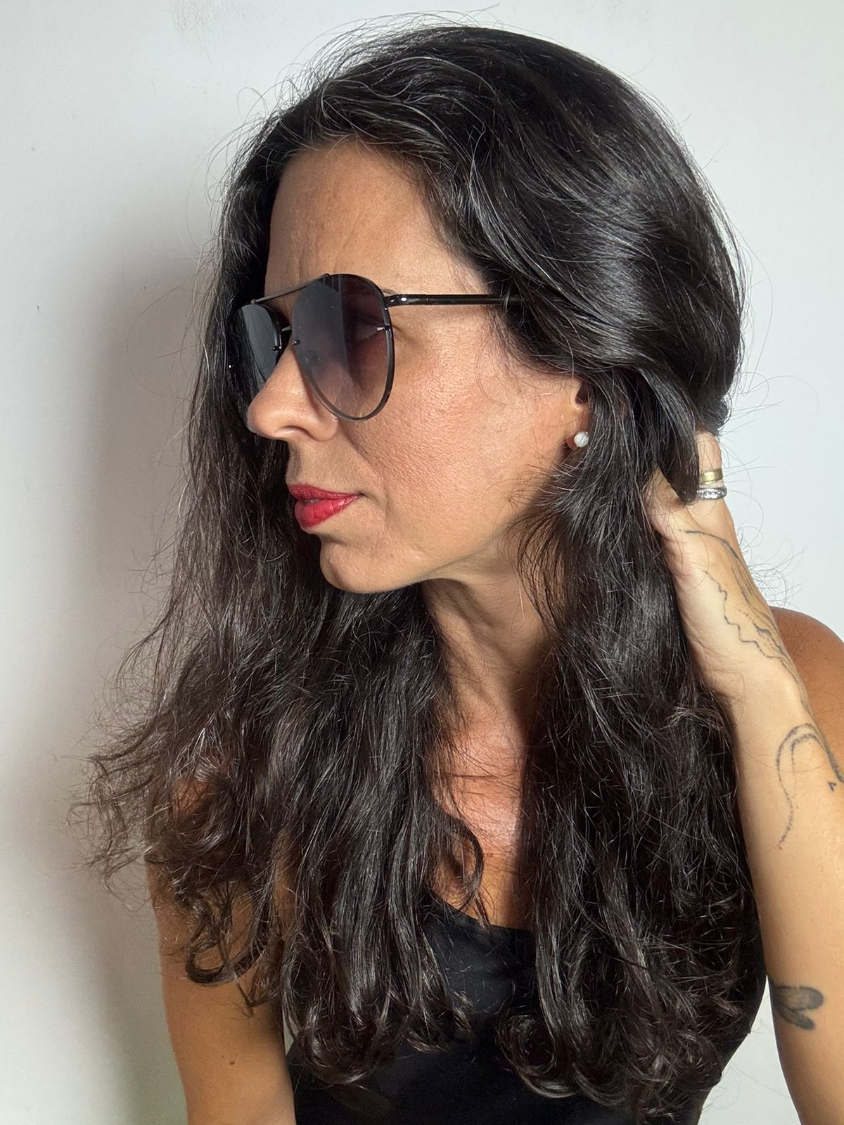 Óculos com lentes escuras degradê e armação fina de metal preto. Modelo clássico e versátil para complementar looks casuais ou sofisticados nos dias de sol. Estilo Ray Ban