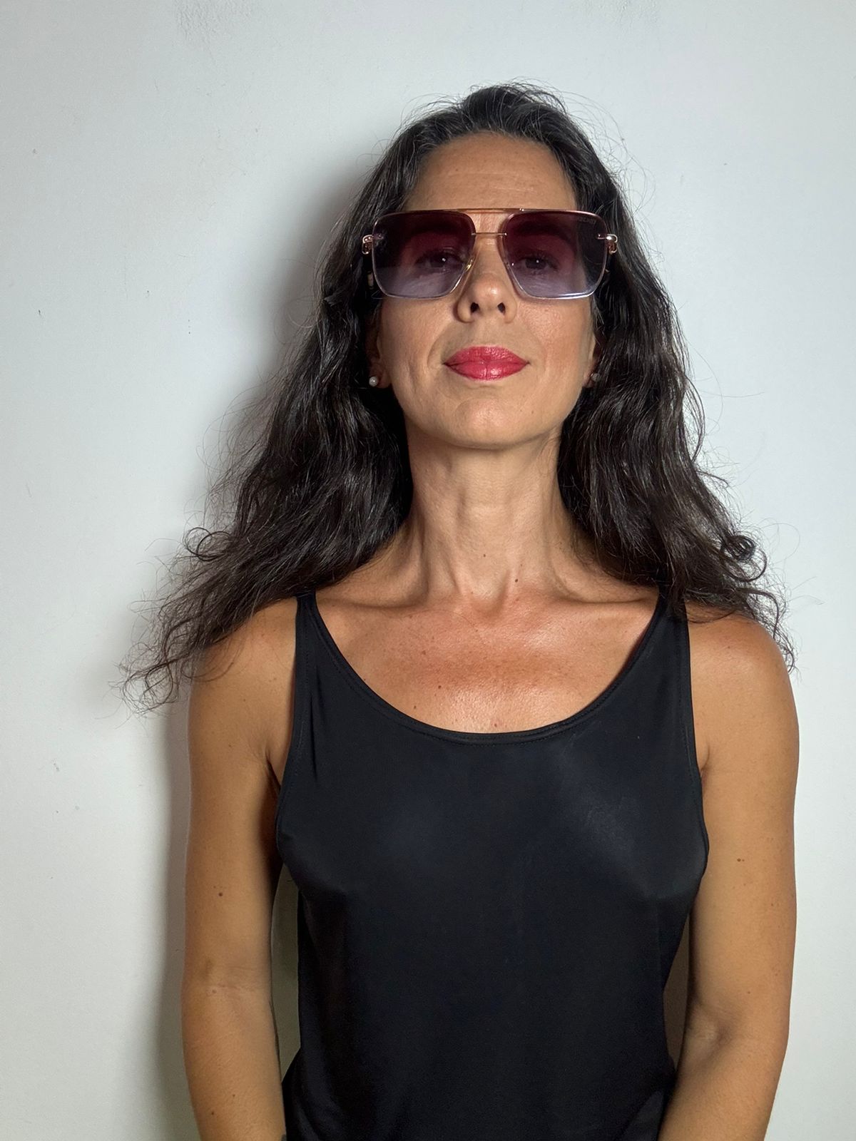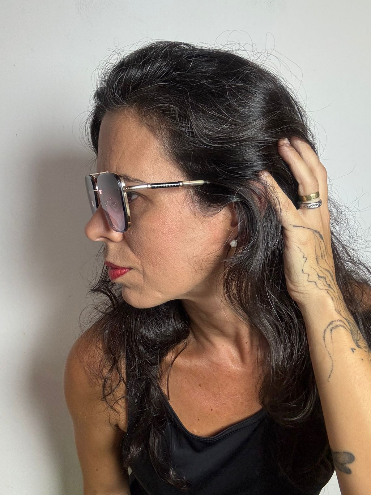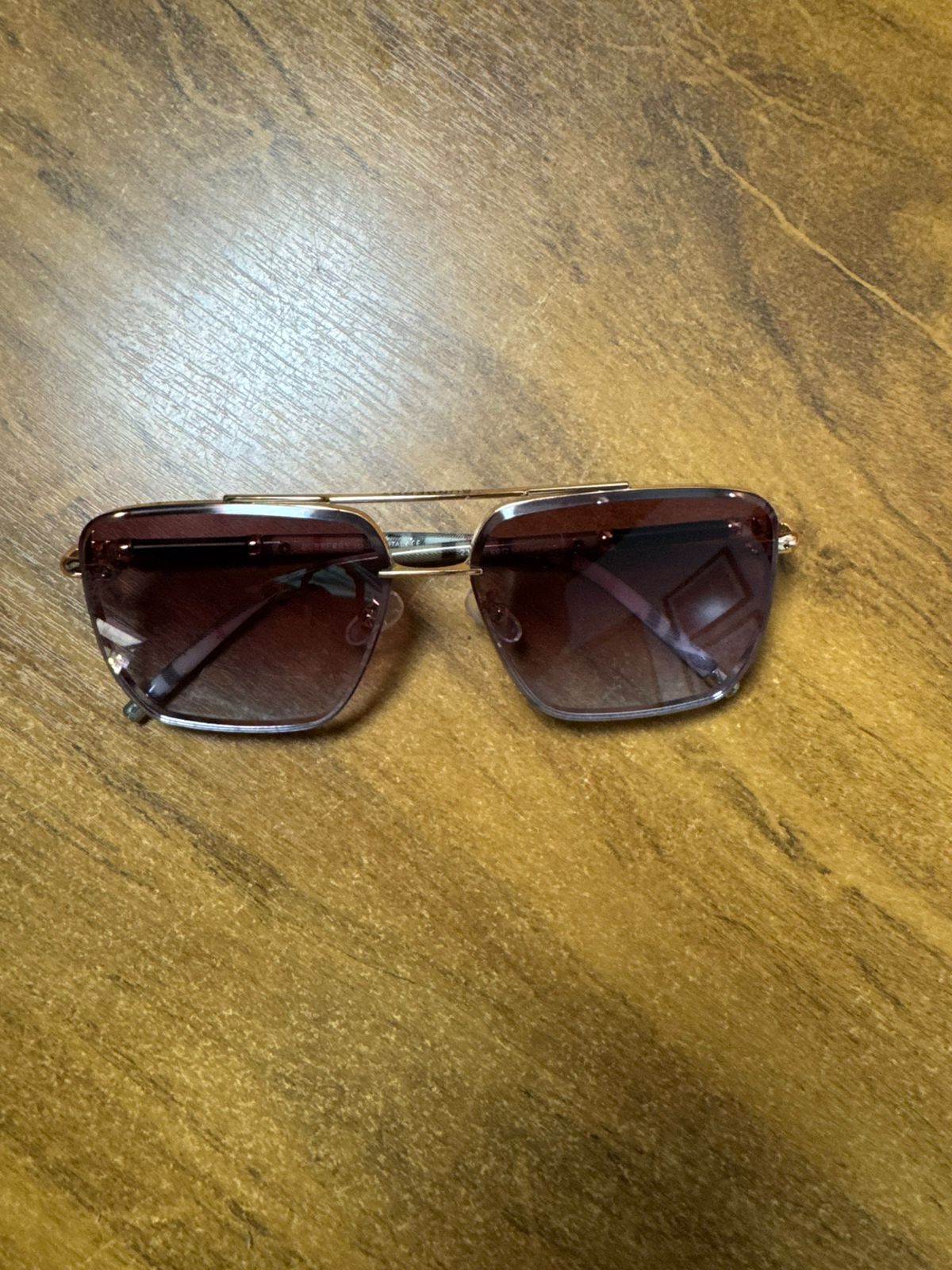 Óculos de sol com armação fina dourada e lentes quadradas em degrade marrom e roxo. As hastes trazem ponteiras com padronagem clássica em bege, preto e vermelho, ideal para complementar produções elegantes de dia.