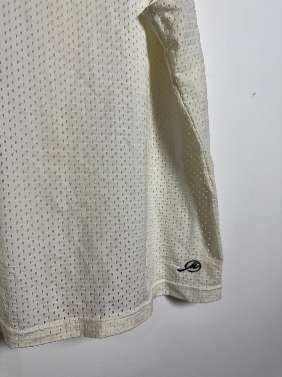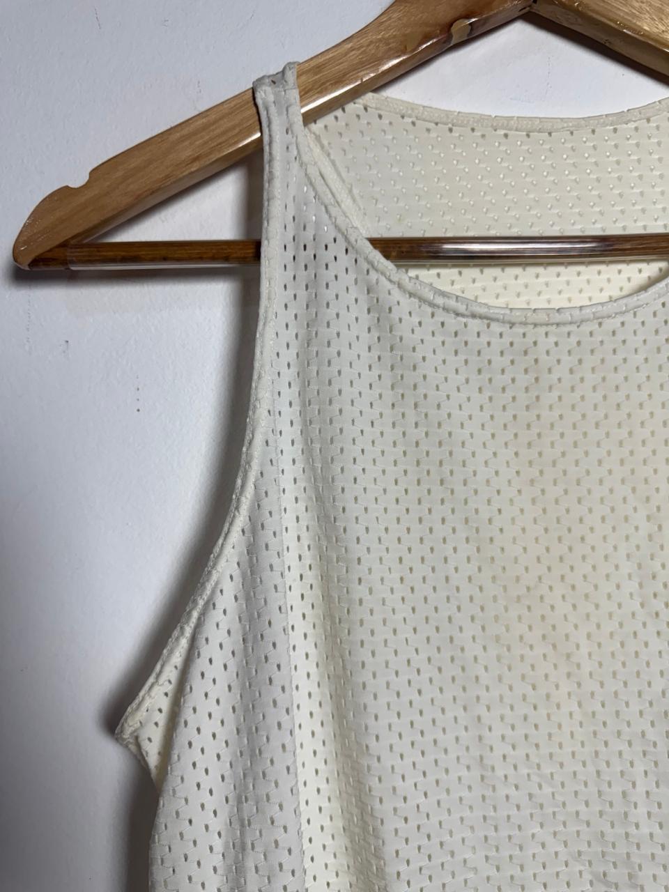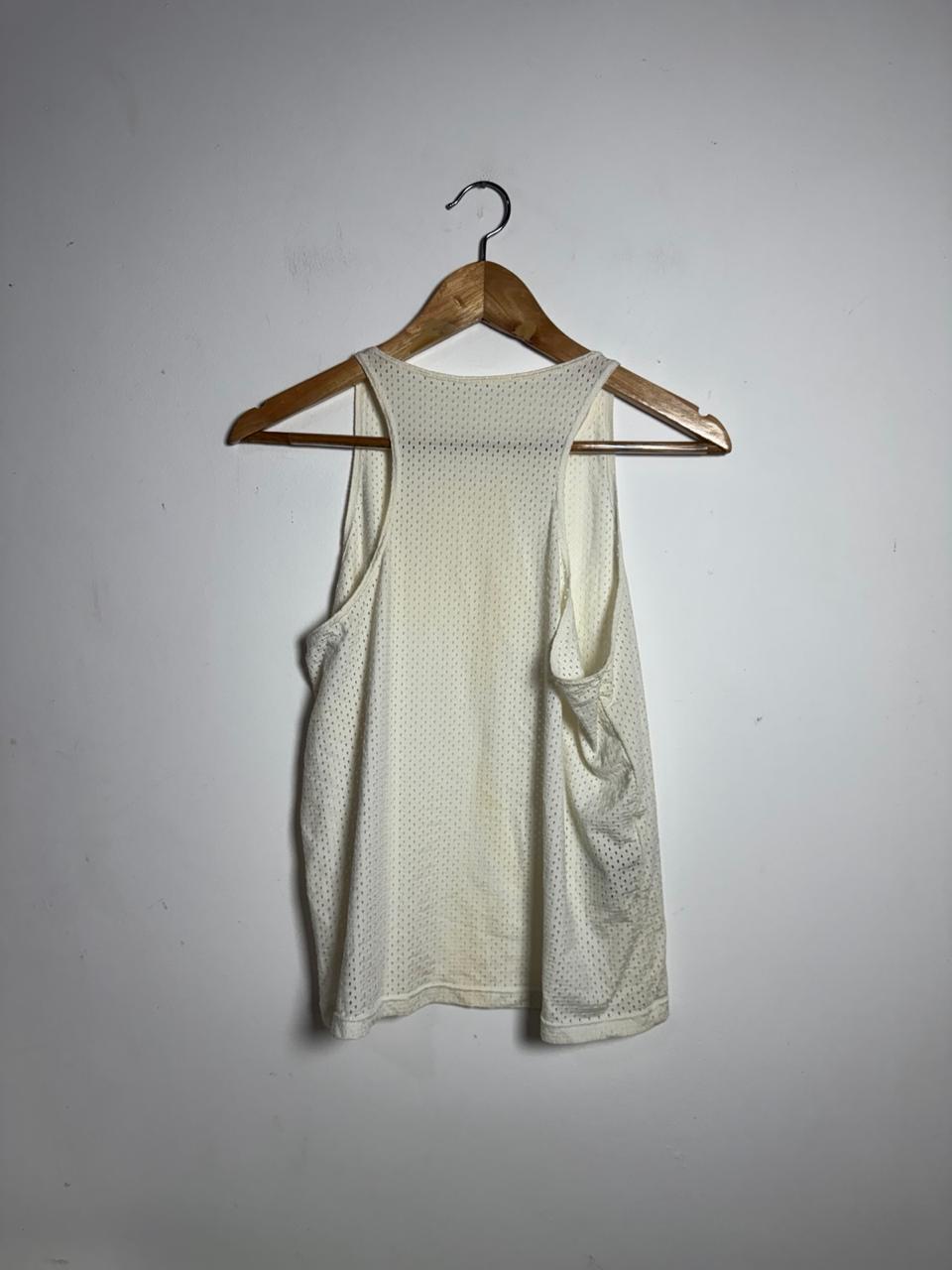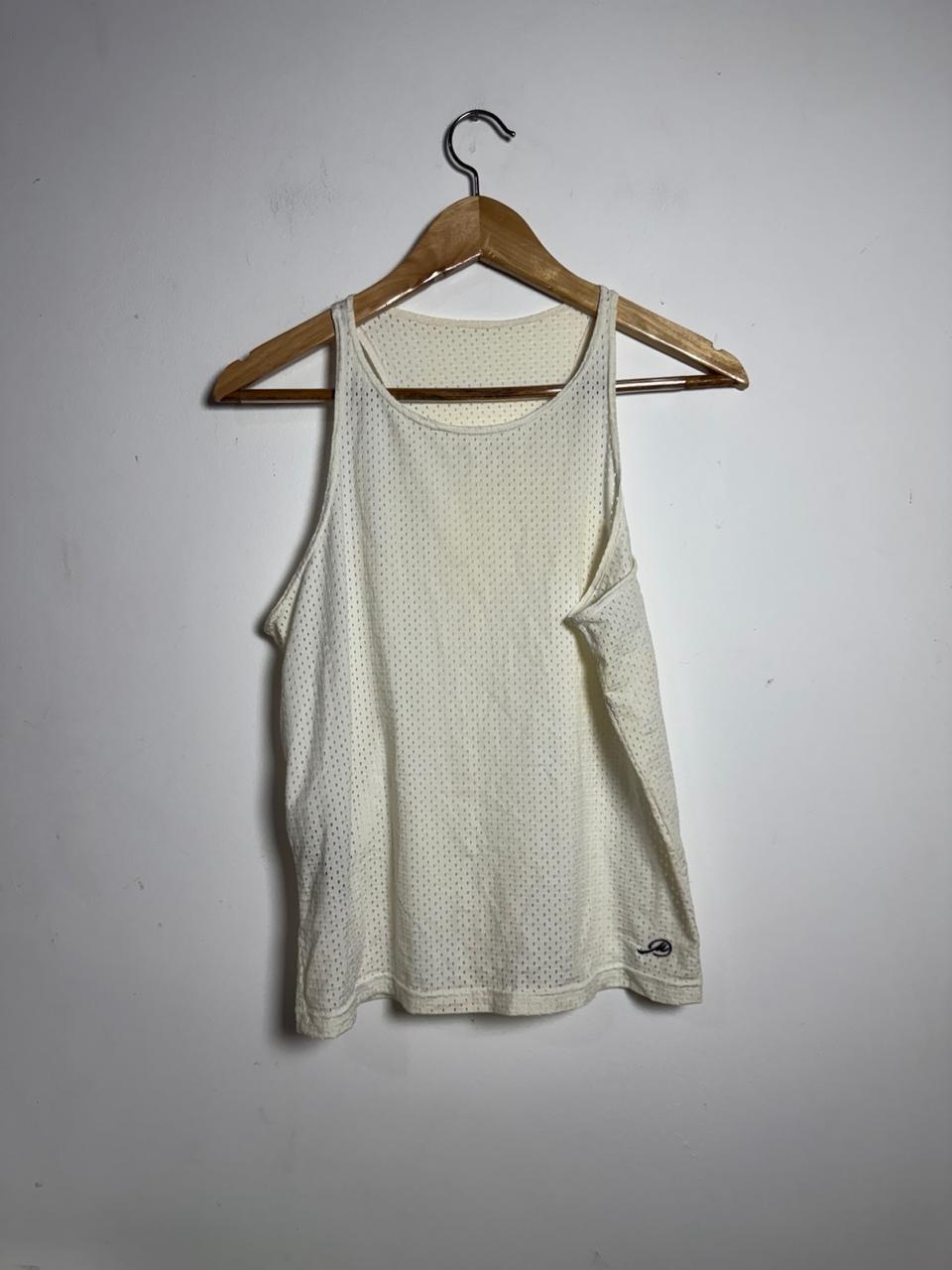 Regata de alças cavas em tom off-white/creme, feita em tecido furadinho (mesh/dry fit) que proporciona alta respirabilidade. Essencial para treino, corrida ou look casual despojado, oferecendo frescor e conforto.