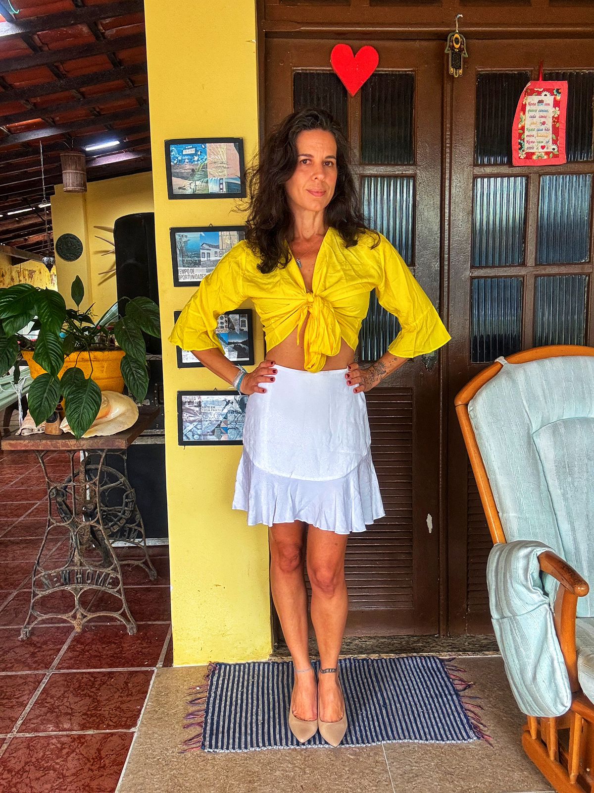 Saia branca com babado na barra e caimento solto.