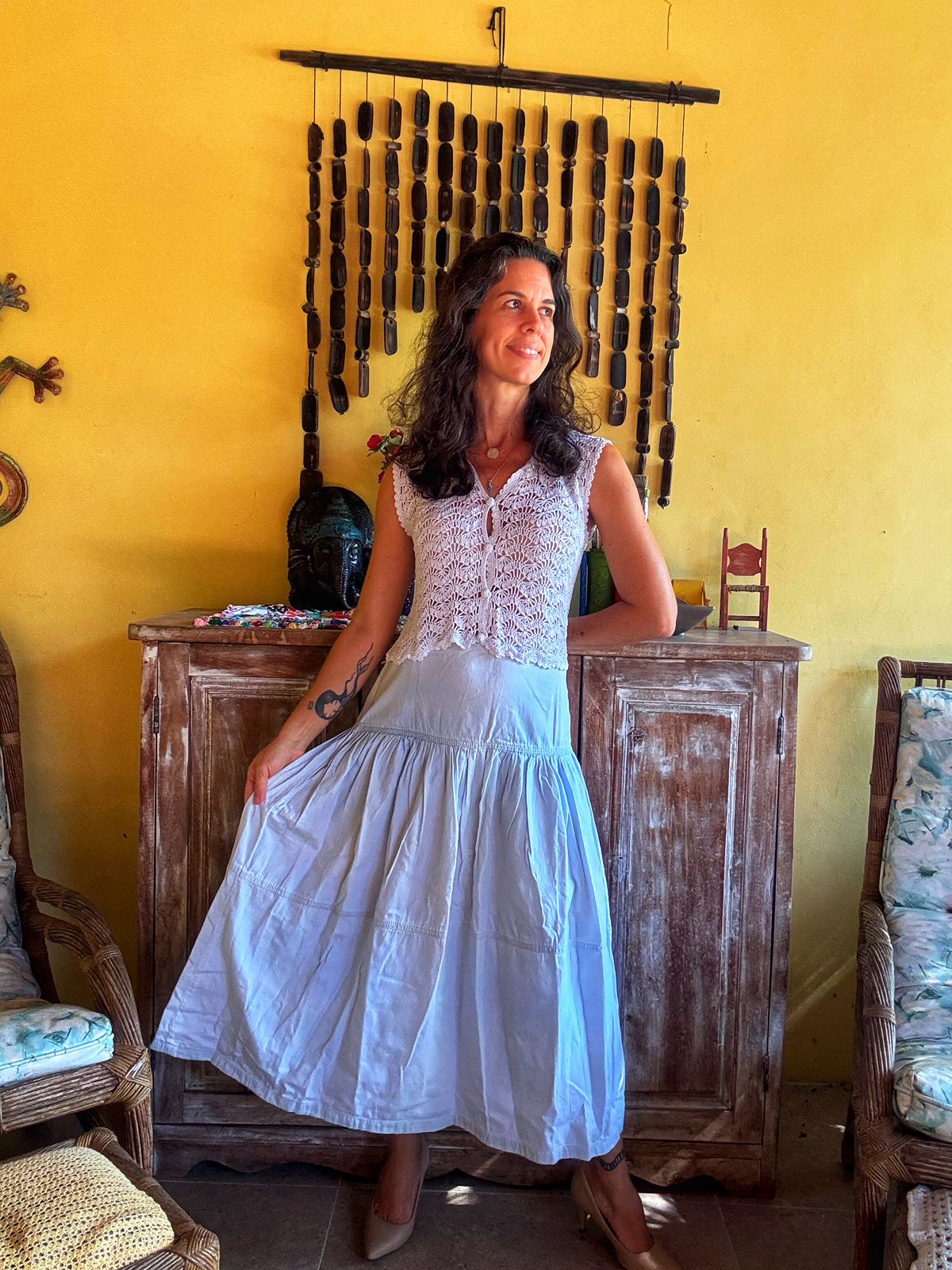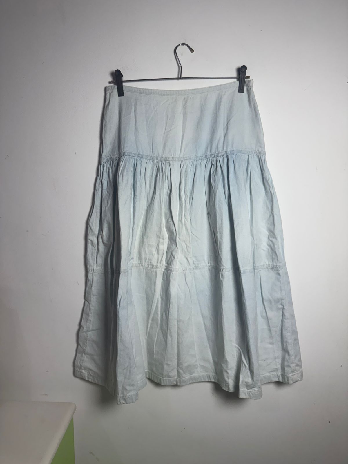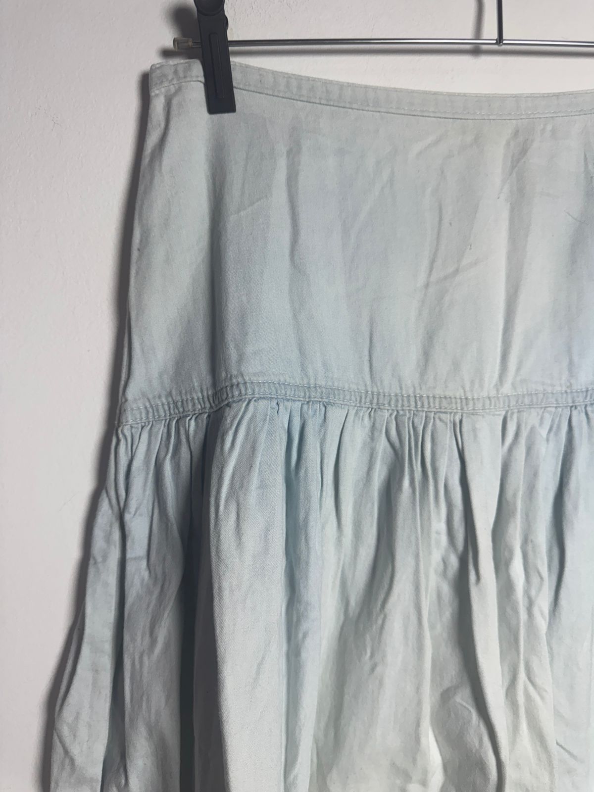 Saia longa/midi jeans (ou tecido claro) estonada/delavé em tom azul claro, modelo evasê com recortes e babados (três marias). Uma peça boho chic e super confortável para um visual leve.
