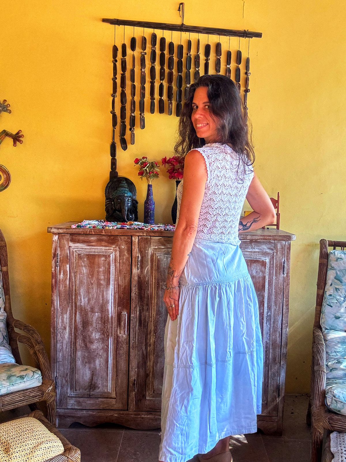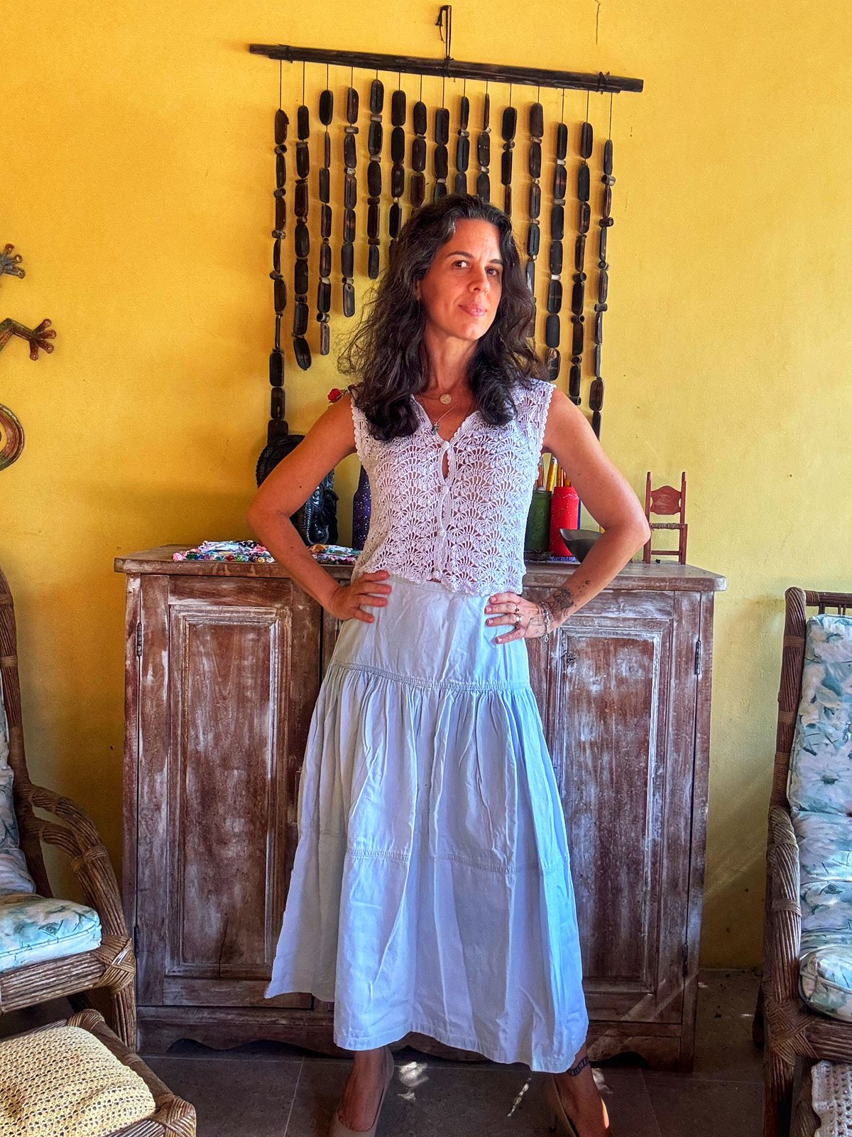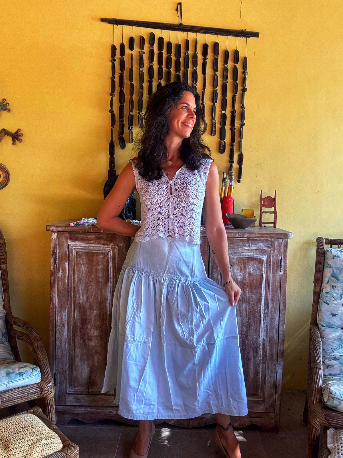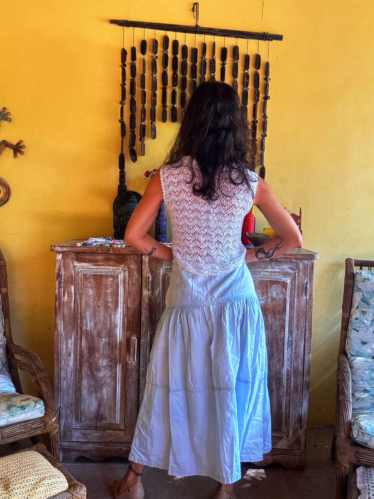 Saia longa/midi jeans (ou tecido claro) estonada/delavé em tom azul claro, modelo evasê com recortes e babados (três marias). Uma peça boho chic e super confortável para um visual leve.
