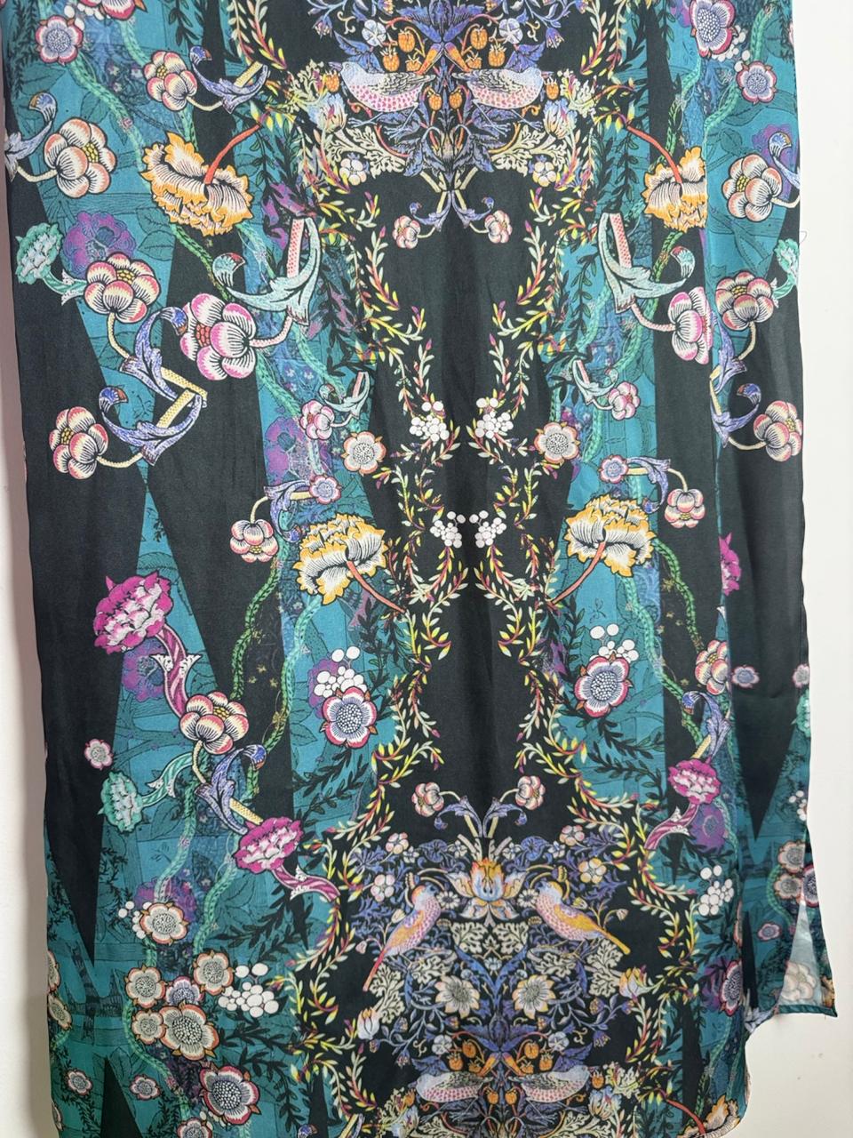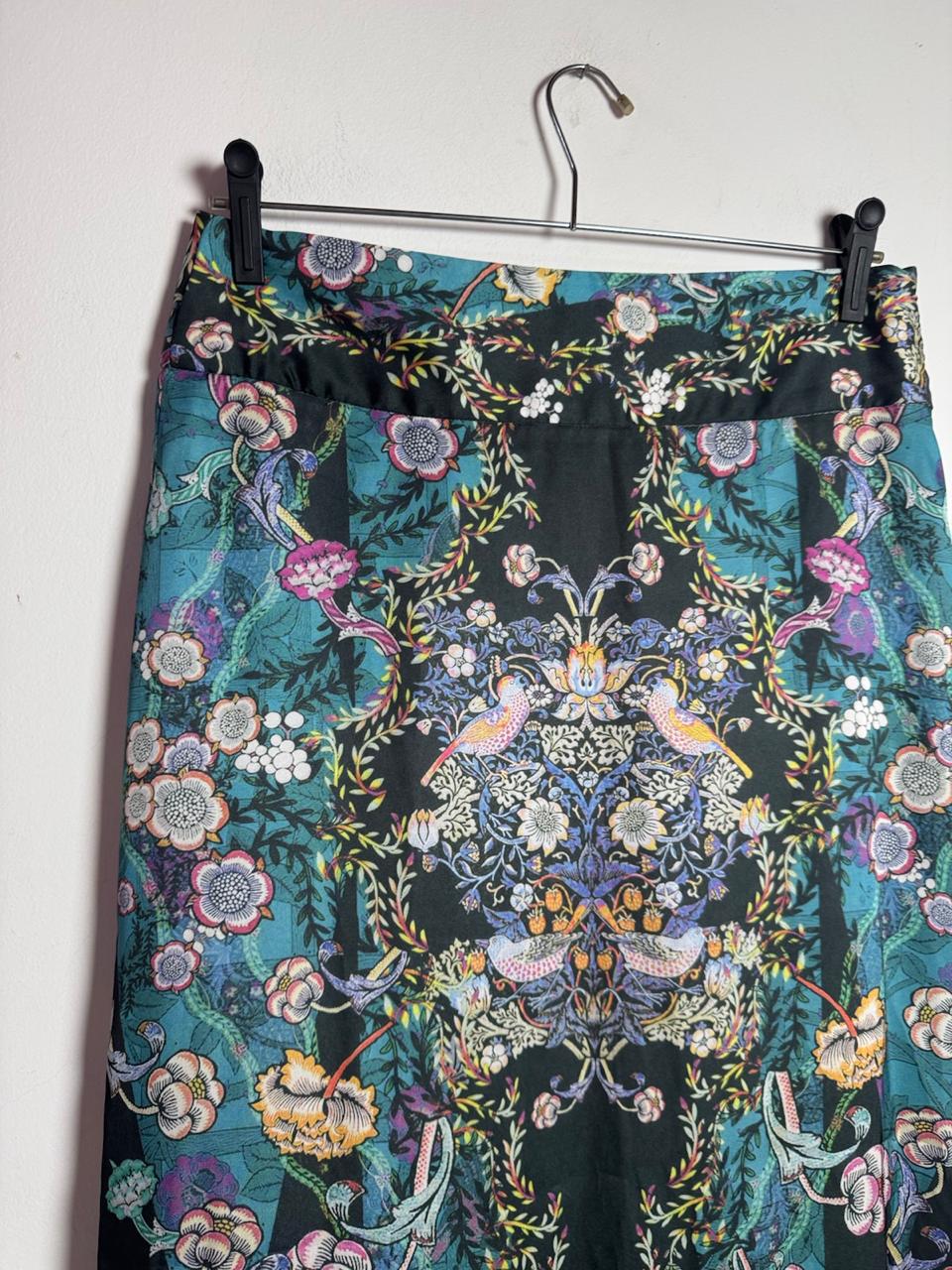 Saia de comprimento longo com fundo preto, fendas laterais e padronagem colorida de flores e pássaros. Peça com caimento reto, perfeita para criar looks sofisticados em eventos noturnos.
