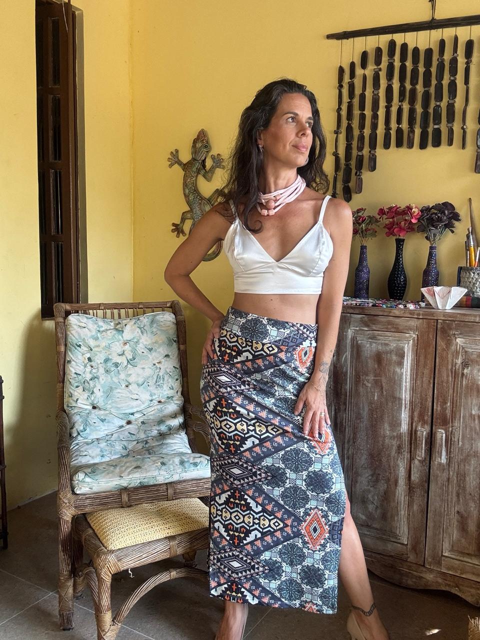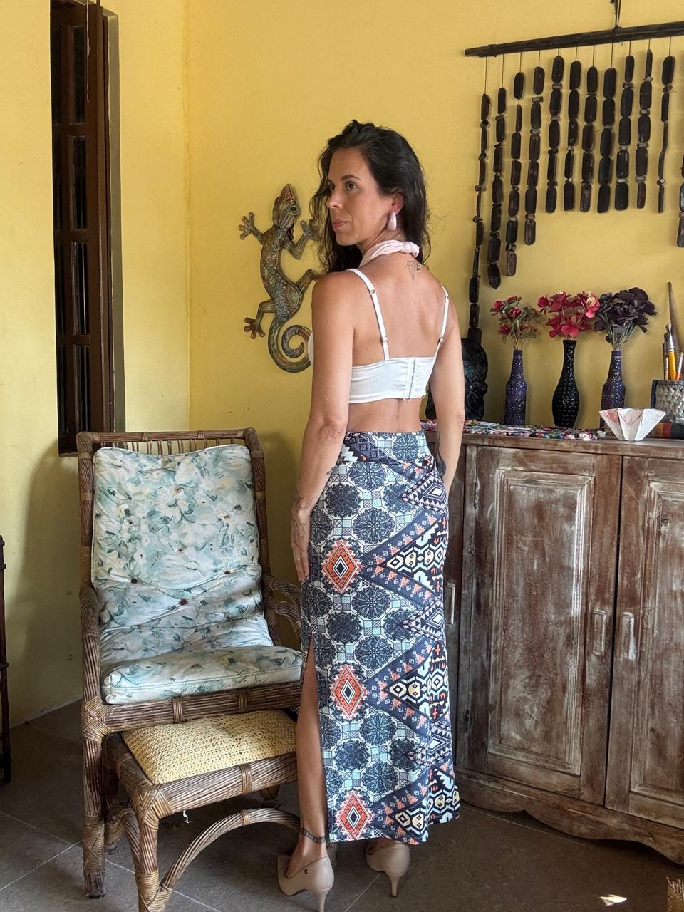 Saia longa de malha com fenda lateral e estampa geométrica de inspiração étnica em tons de azul, cinza, laranja e preto. Possui modelagem ajustada e cintura alta, criando uma silhueta alongada e um visual moderno com referência boho-chic.