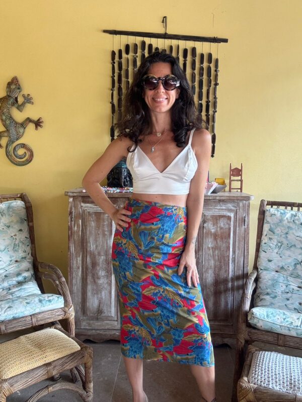 Saia midi transpassada, envolvente e vibrante, em estampa floral com tons de azul, vermelho e verde militar. Garanta o seu toque de cor vintage e caimento impecável para um look de impacto!