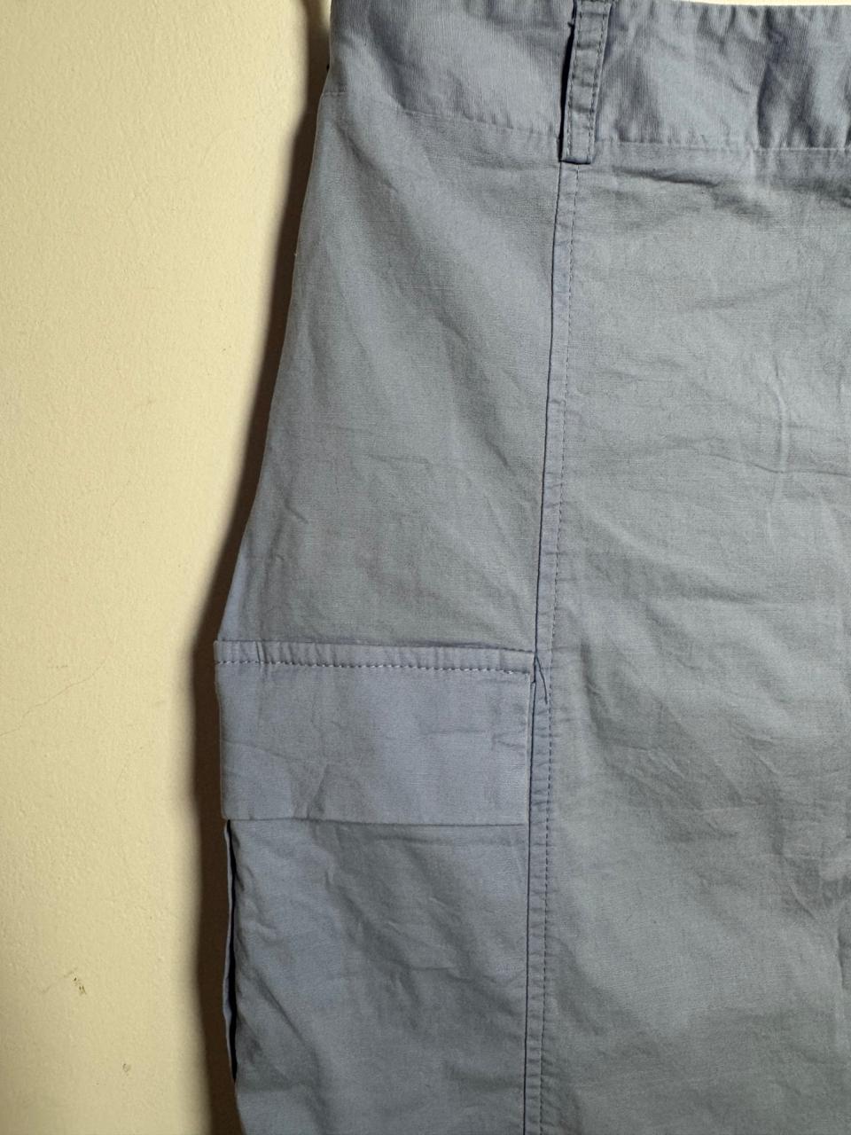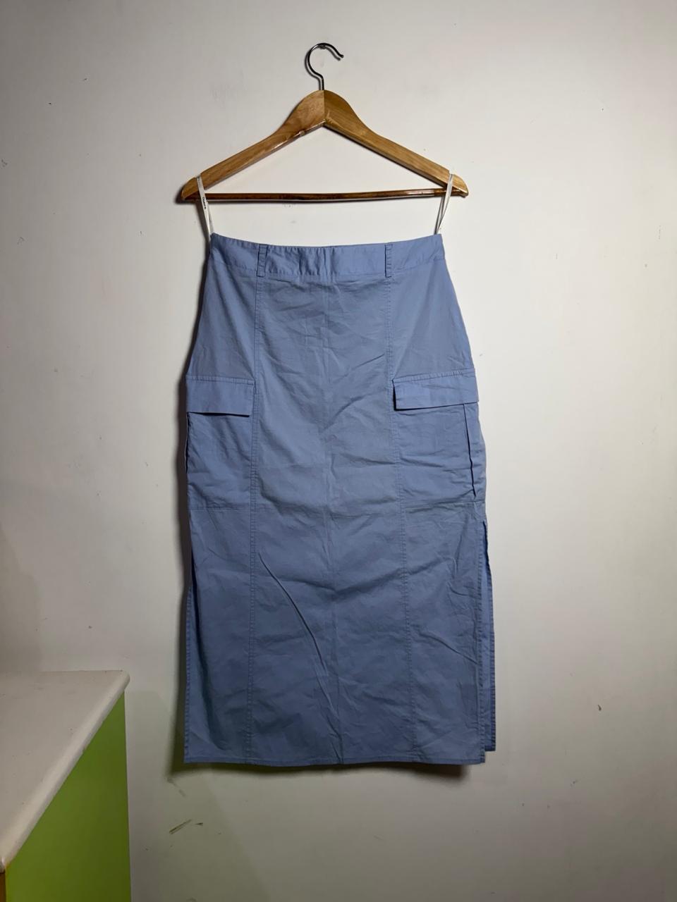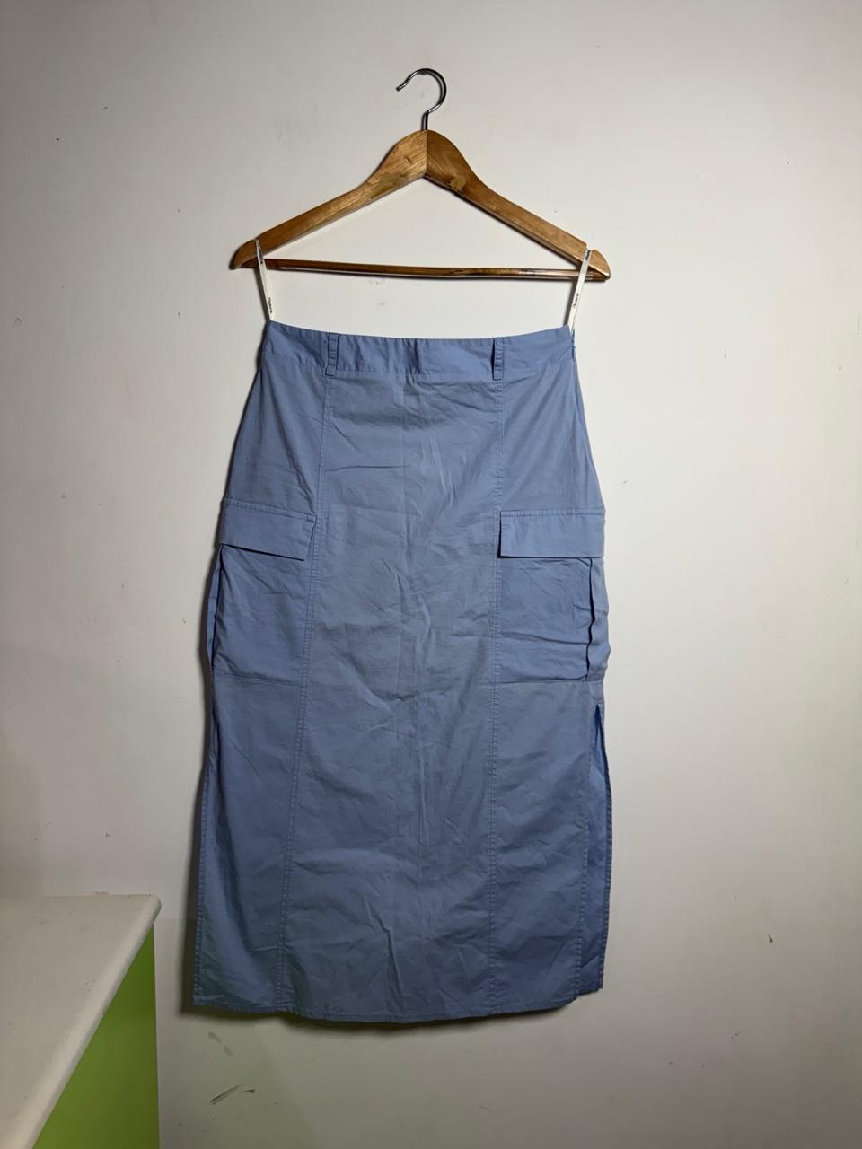 Saia midi em tecido de sarja leve na cor azul pastel/bebê de corte reto, apresentando bolsos laterais estilo cargo e fendas discretas na barra. Uma peça que combina tendência e conforto, ideal para um visual casual moderno e descontraído.