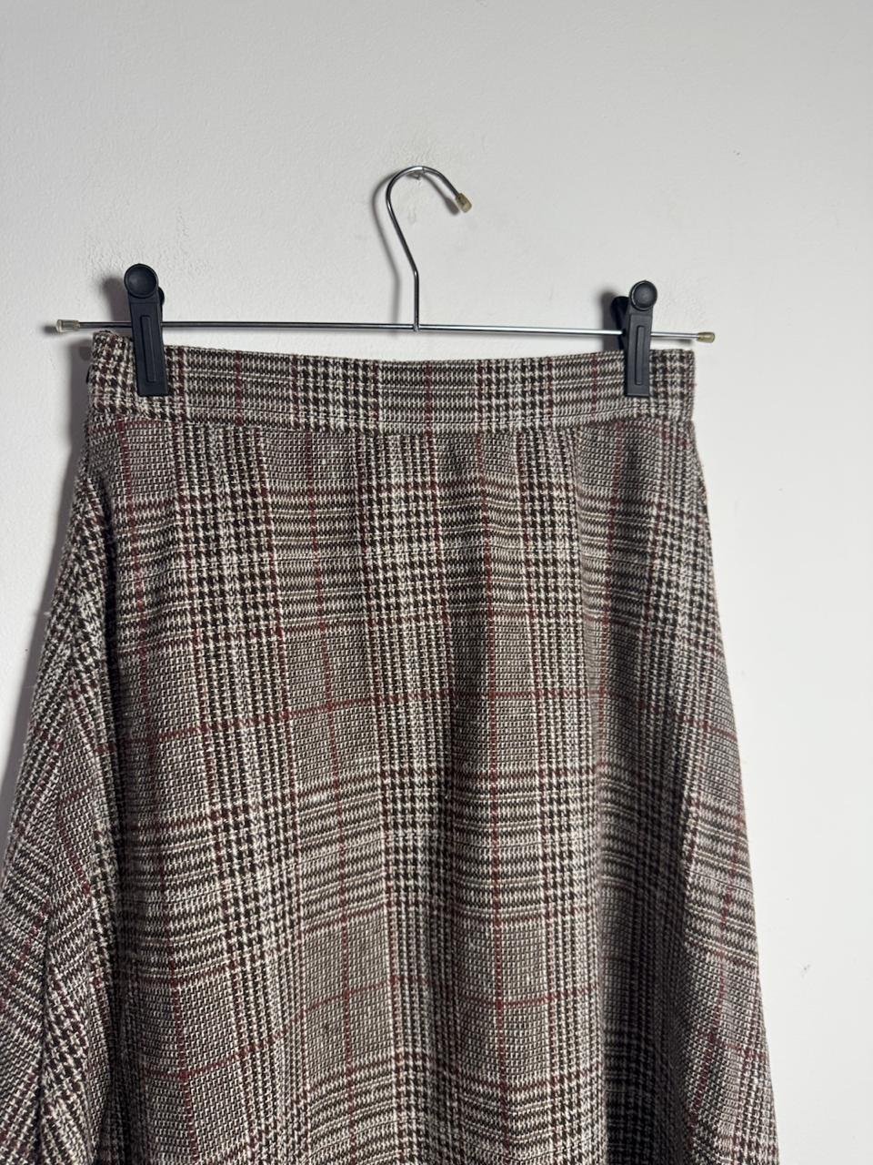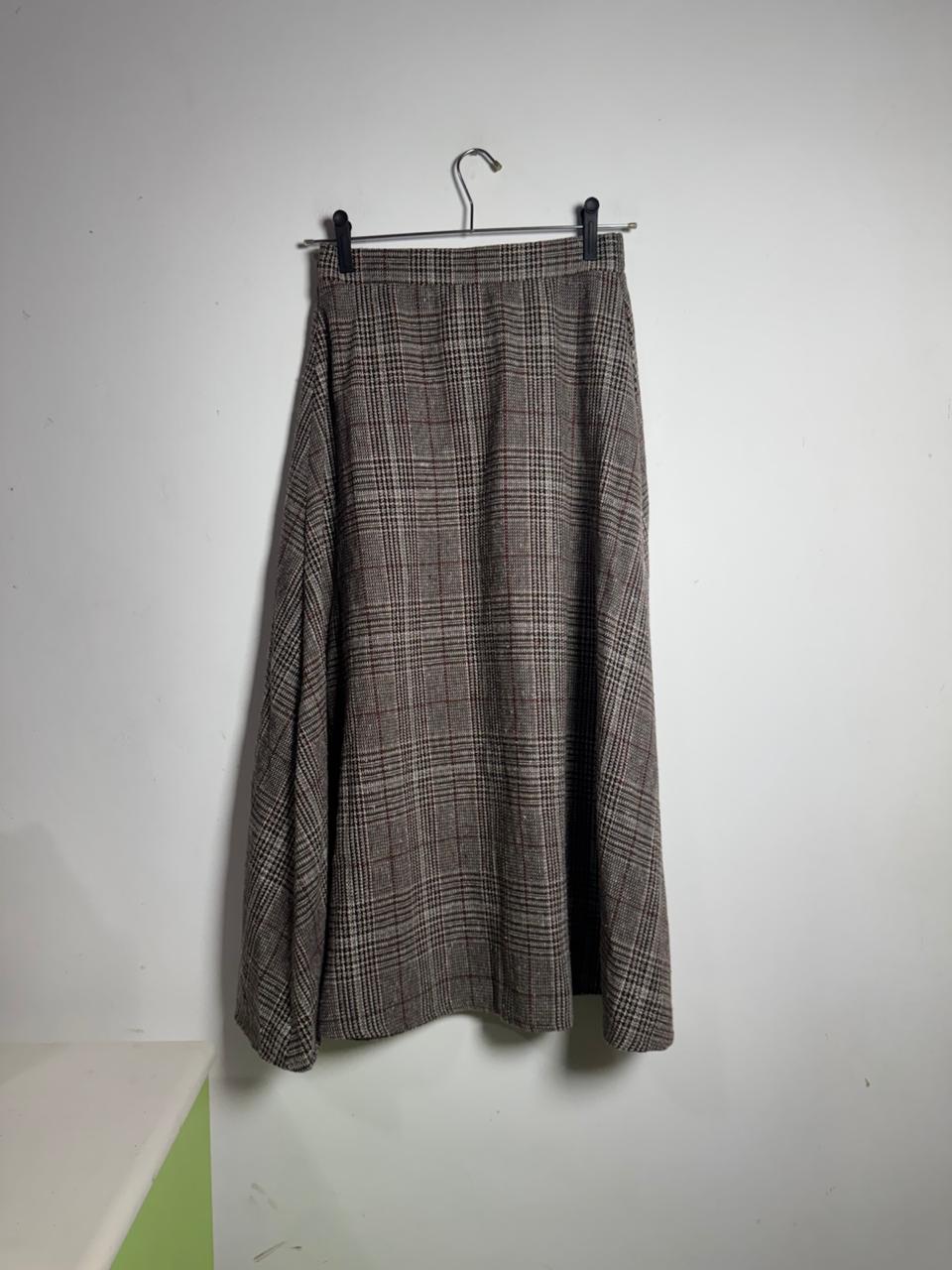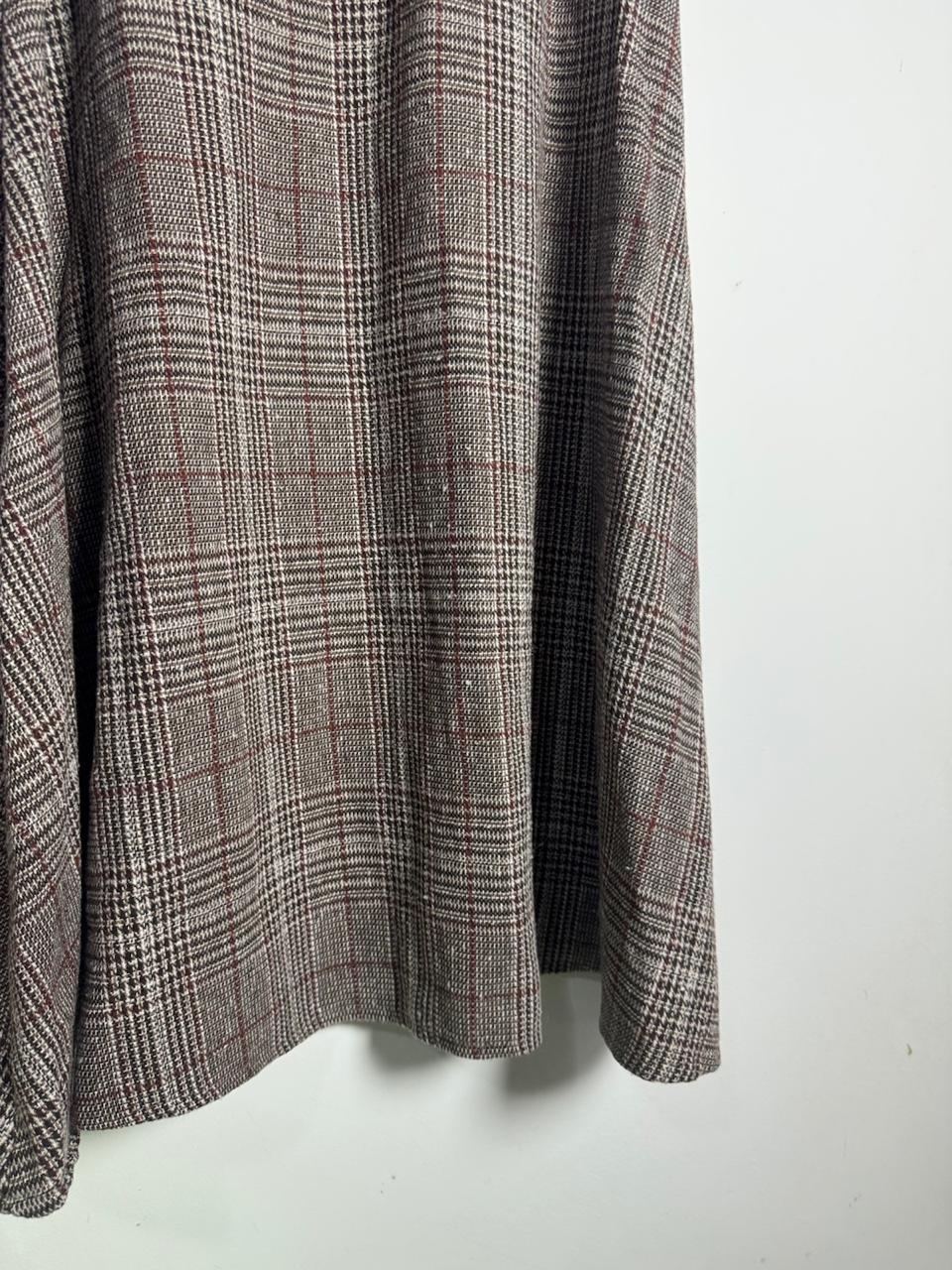 Saia de comprimento midi com padronagem xadrez em tons de marrom, bege e vinho. Apresenta modelagem evasê com caimento fluido, sendo ideal para criar visuais elegantes de inverno com botas e blusas de gola alta.
