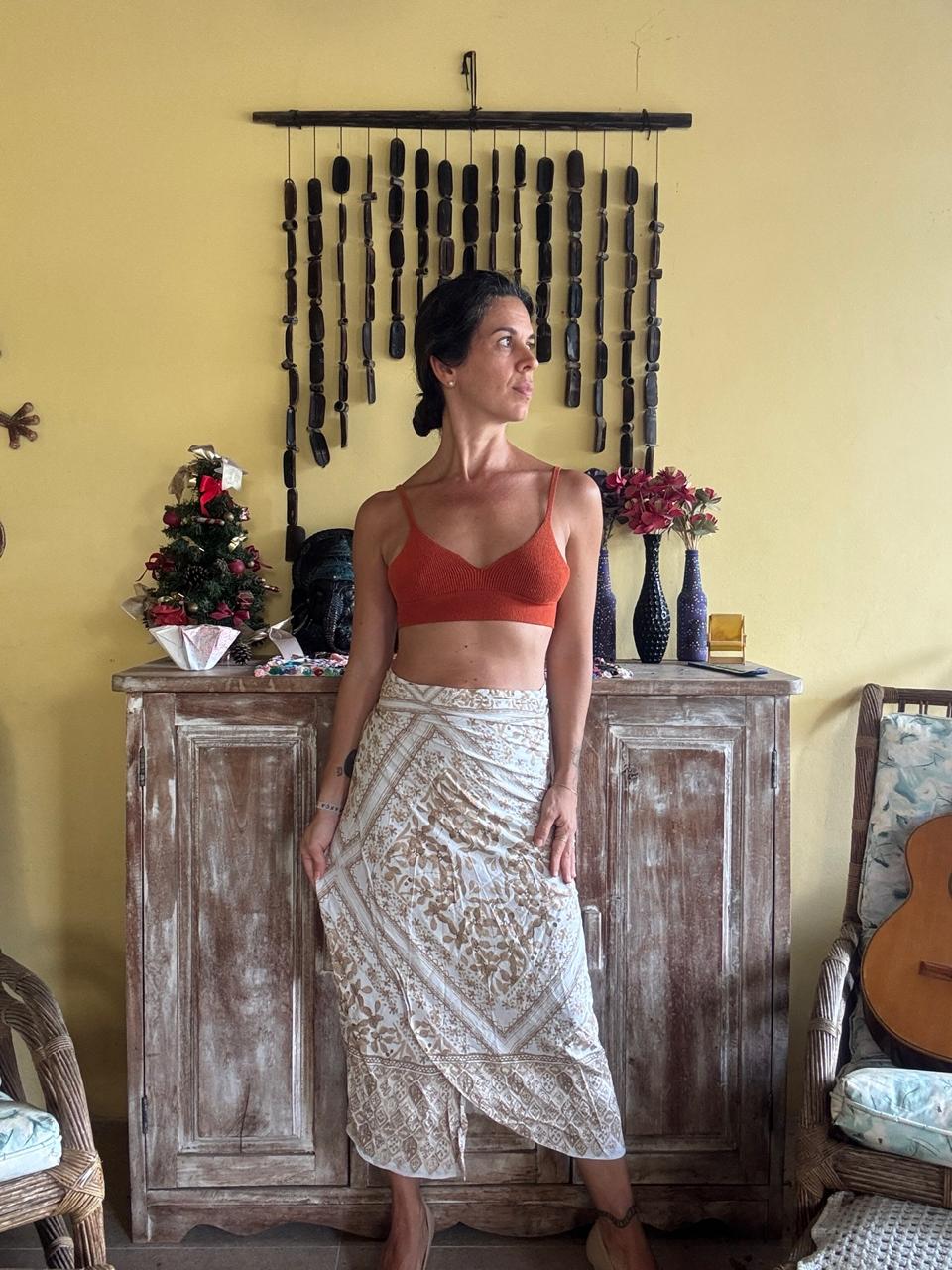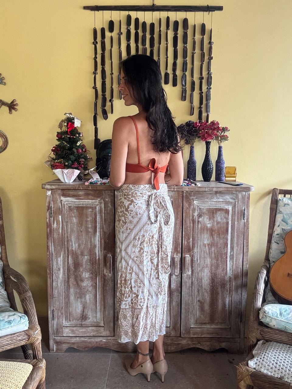 Saia com transpasse frontal, amarração na cintura e desenhos florais em tons de bege. Modelo leve e versátil para produções casuais de verão.
