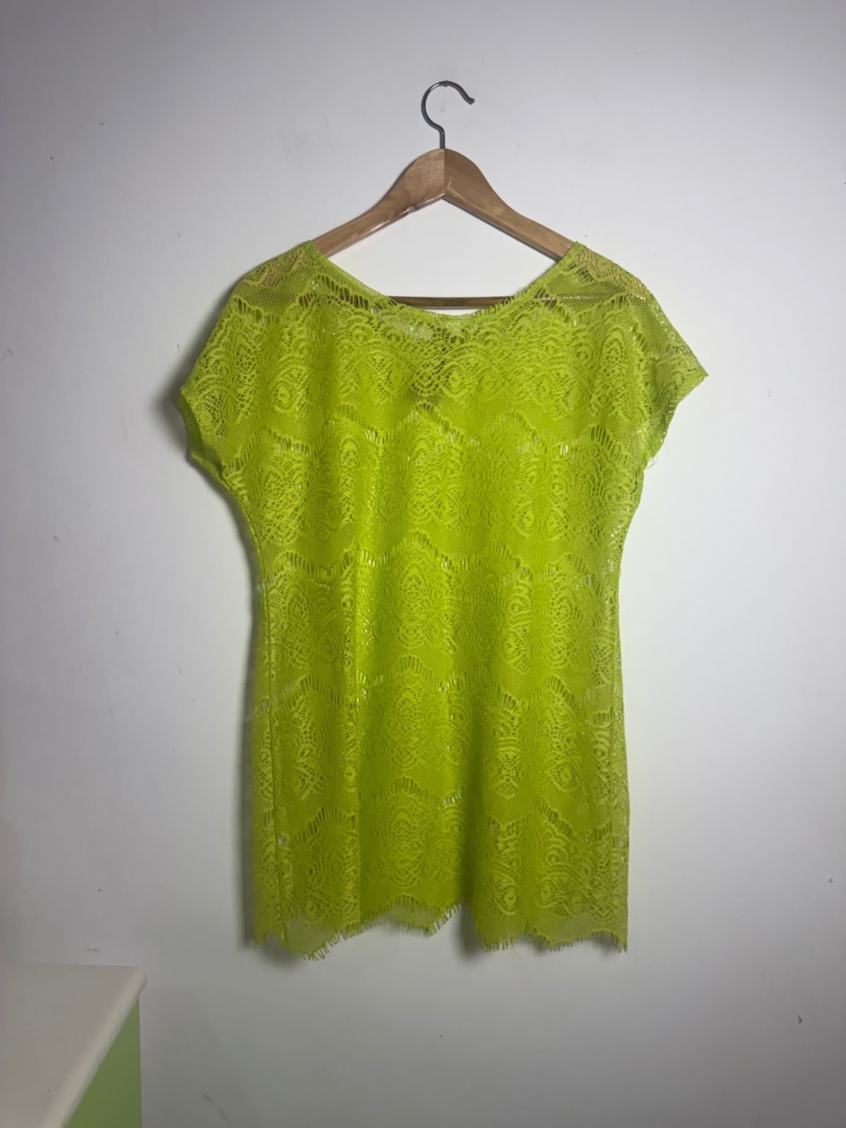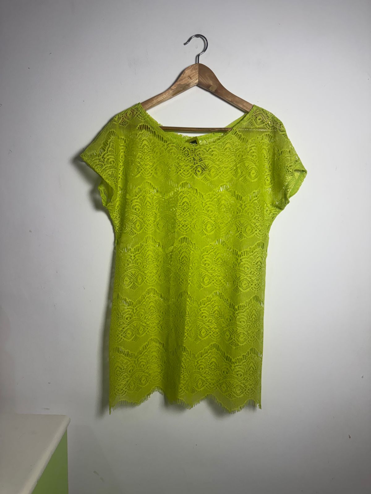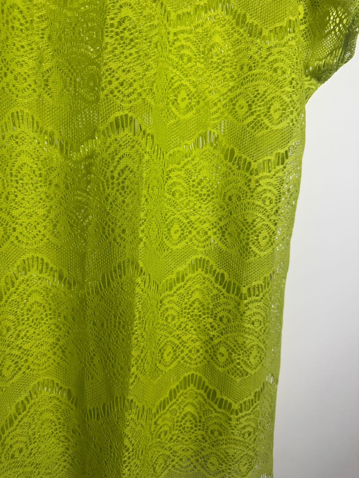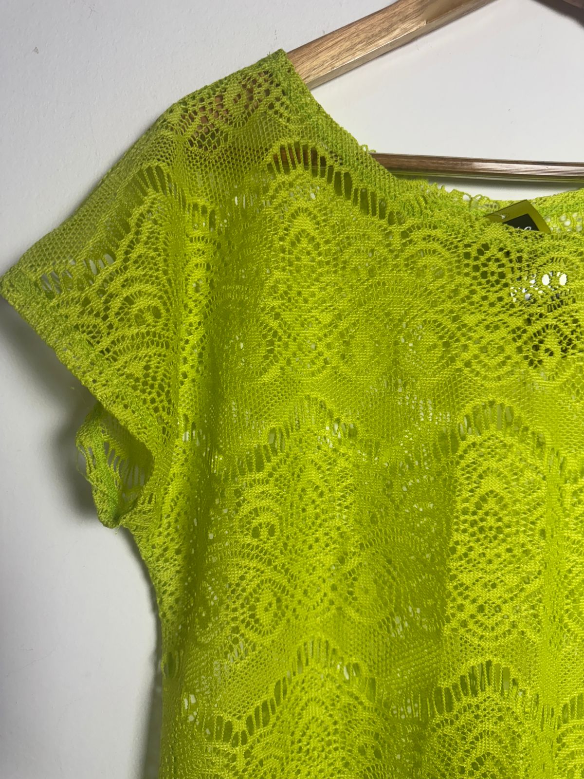 Saída de praia/bata em renda vazada (ou crochê) no vibrante tom verde limão neon. Peça leve e moderna para arrasar na beira da piscina ou praia.