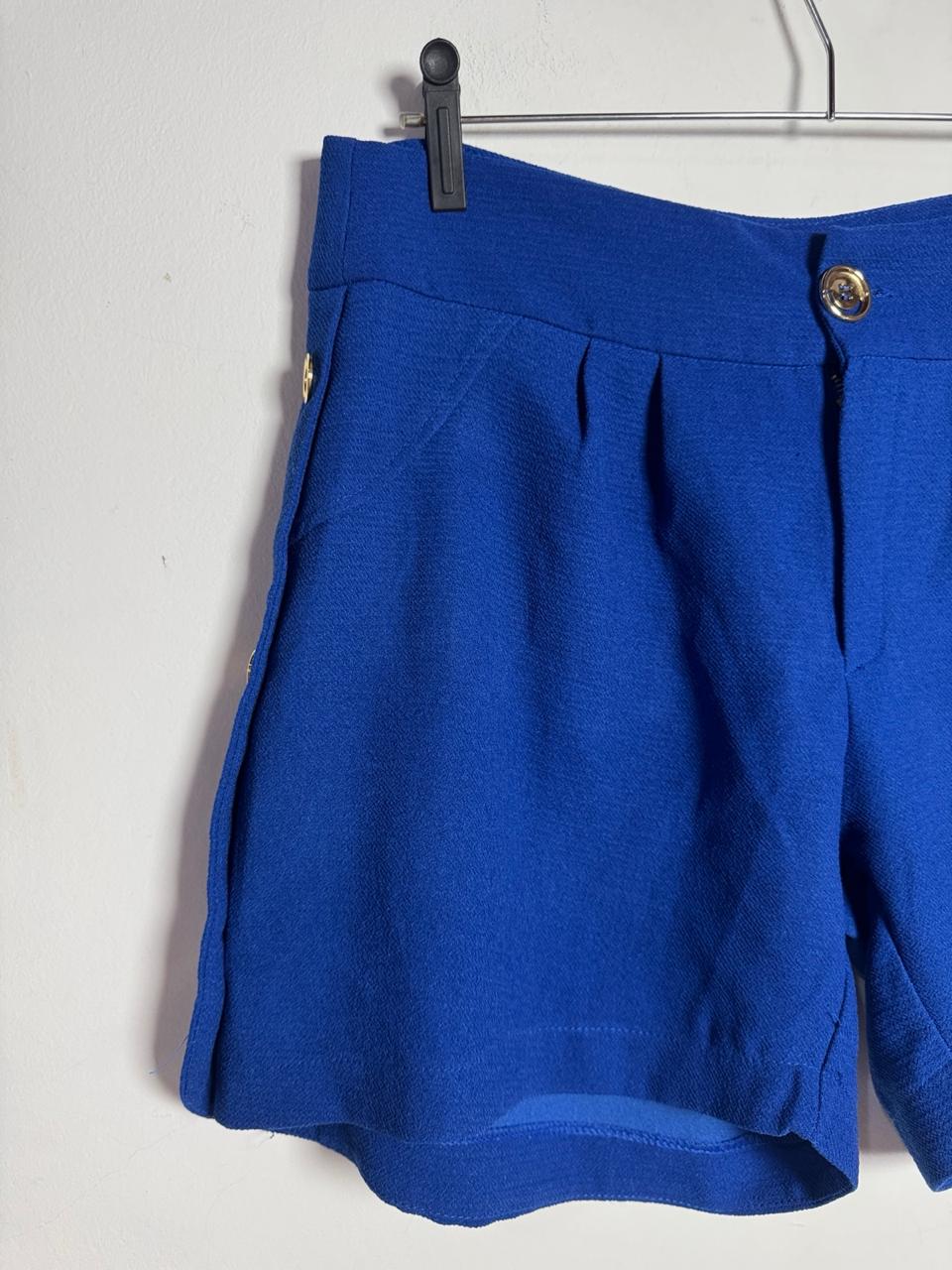 💙 Short de Alfaiataria Azul Royal: Short de tecido texturizado na cor azul klein/royal vibrante, com cintura alta e pregas frontais. Detalhes de botões dourados nas laterais e na frente adicionam um ar sofisticado e moderno, perfeito para sair do básico.